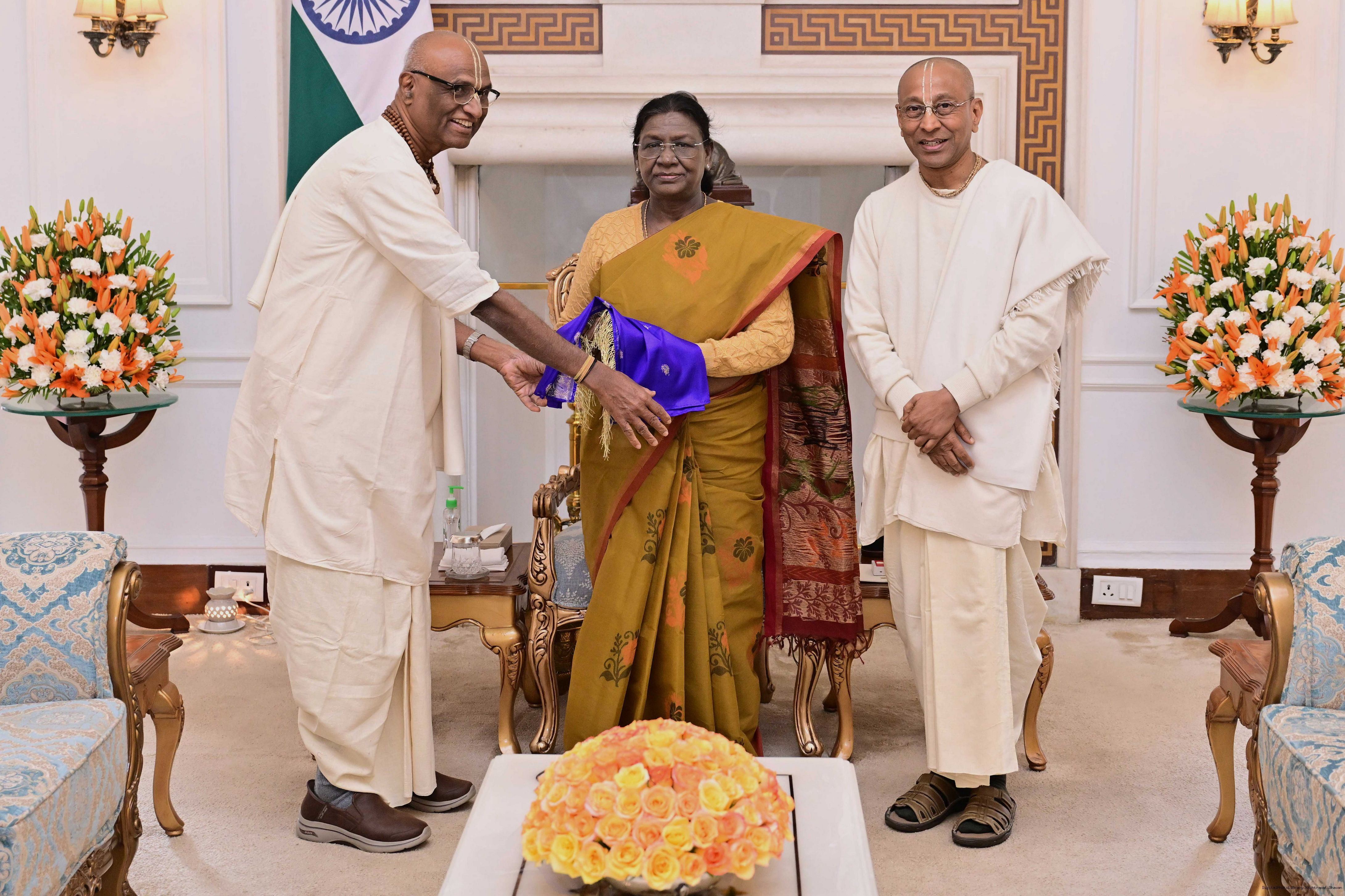 | Caption: | Shri Madhu Pandit Dasa, Founder Chairperson, The Akshaya Patra Foundation and Shri Chanchalapathi Das, Vice Chairman and Co-Founder meeting with the President of India, Smt Droupadi Murmu at Rashtrapati Bhavan on January 22, 2026. |