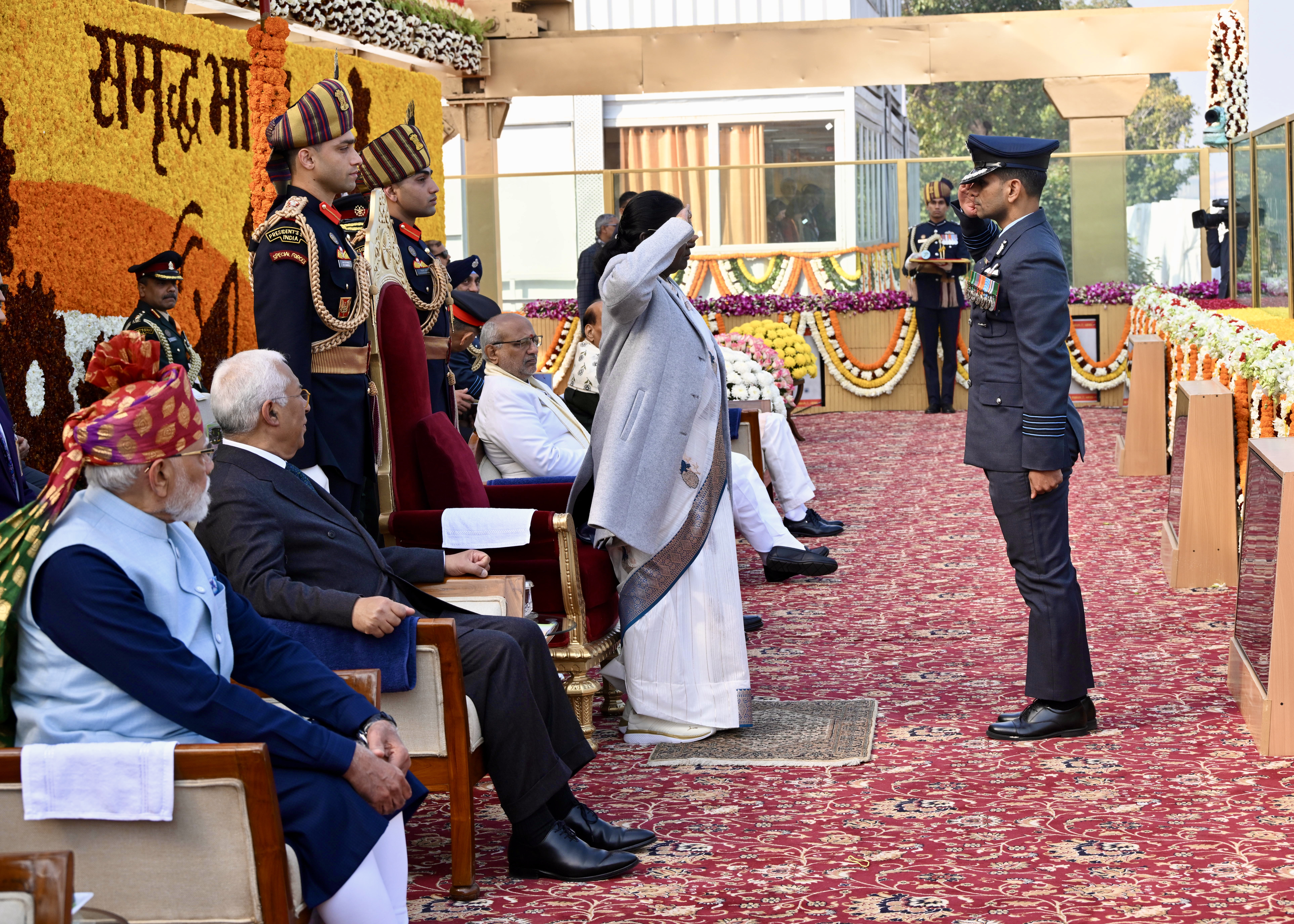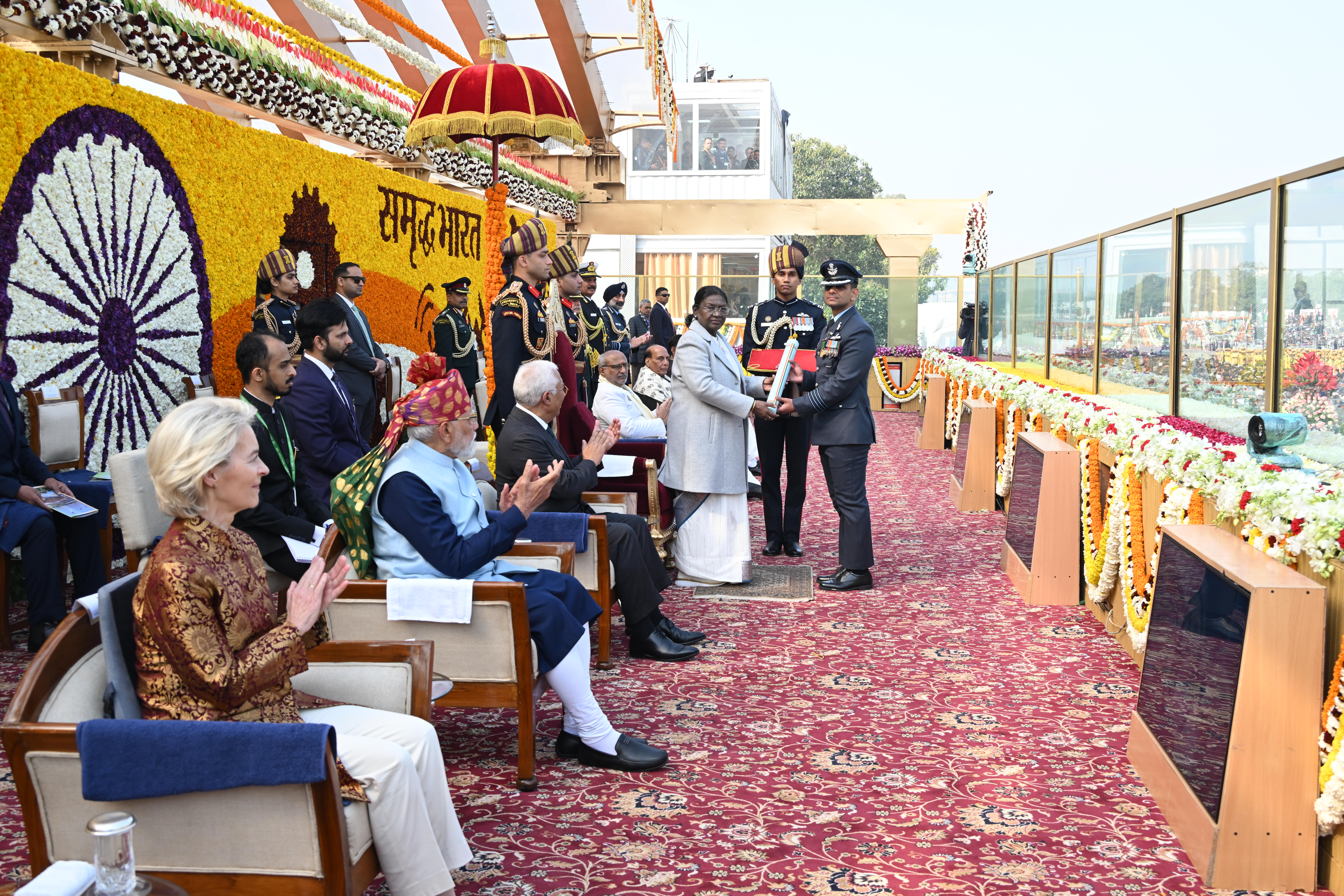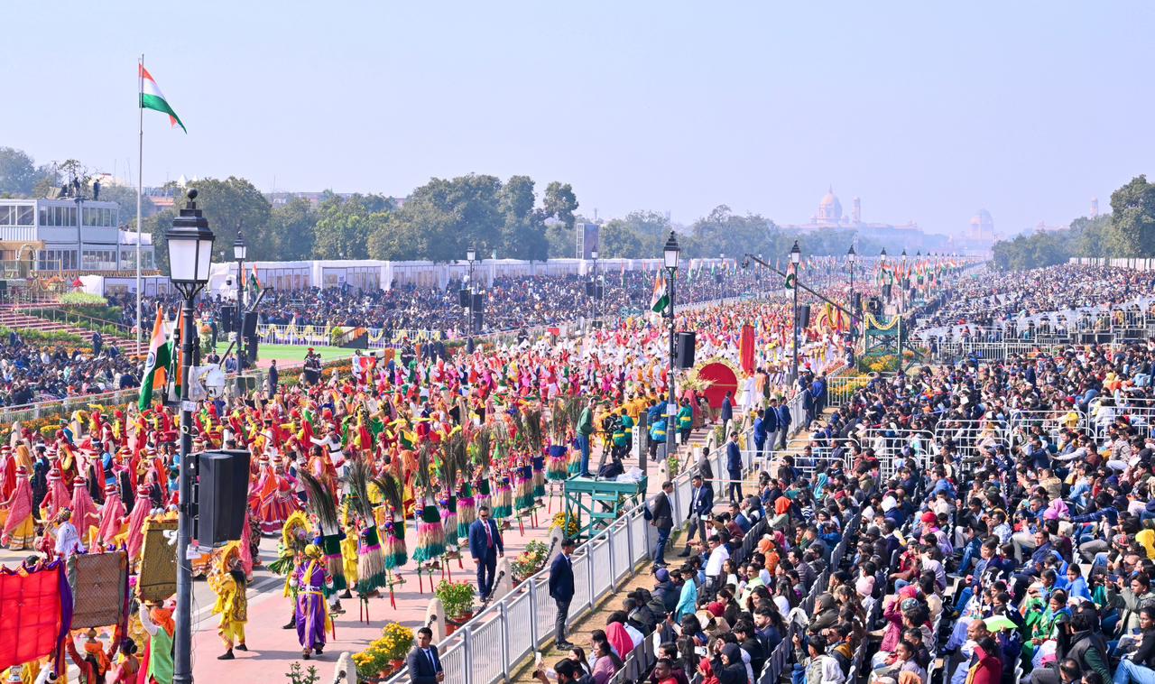| Caption: | The President of India, Smt Droupadi Murmu, along with the Chief Guests, the President of the European Council Mr. Antonio Costa, and the President of the European Commission Ms. Ursula von der Leyen, witnessed the 77th Republic Day Parade at Kartavya Path on January 26, 2026. |