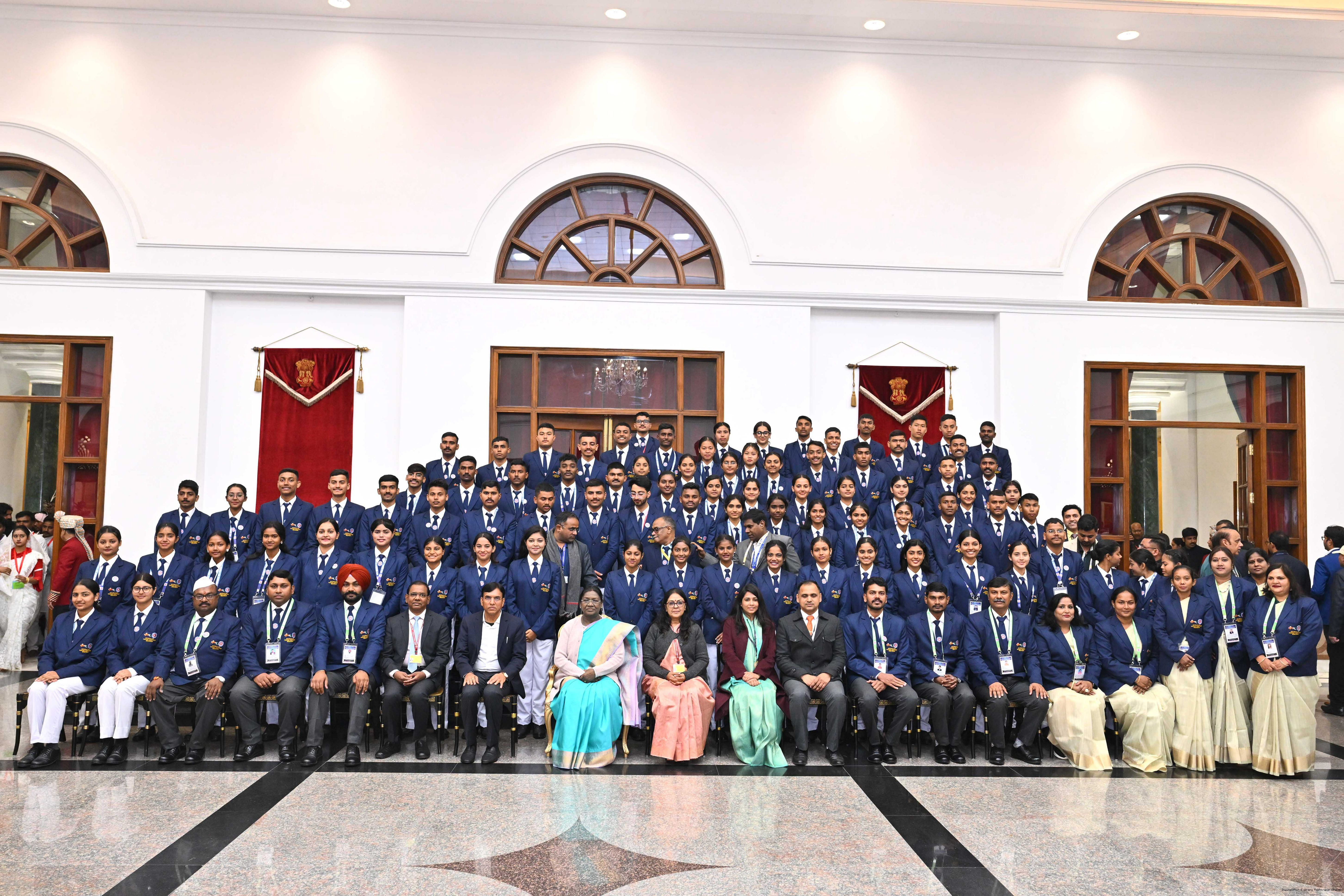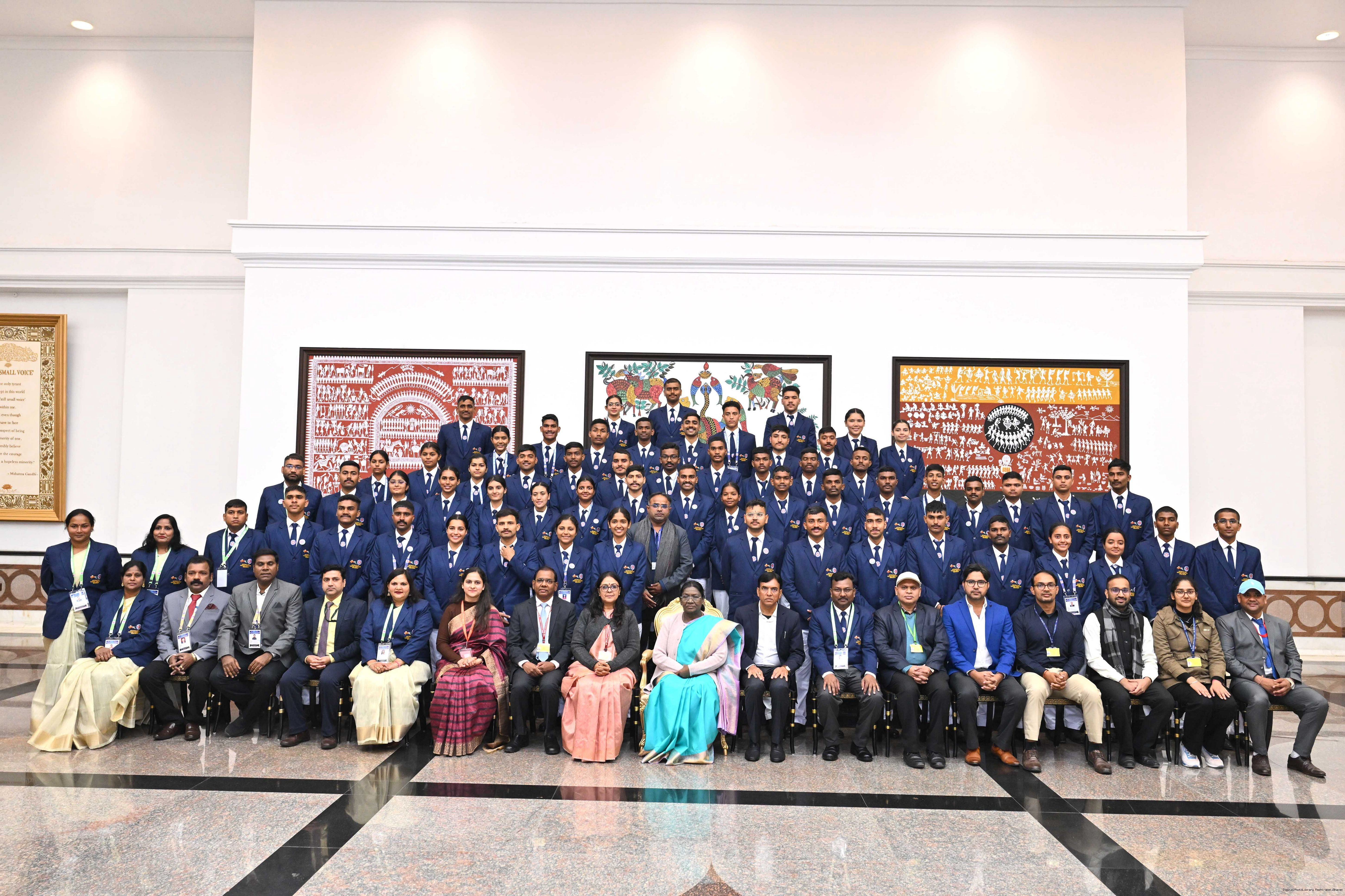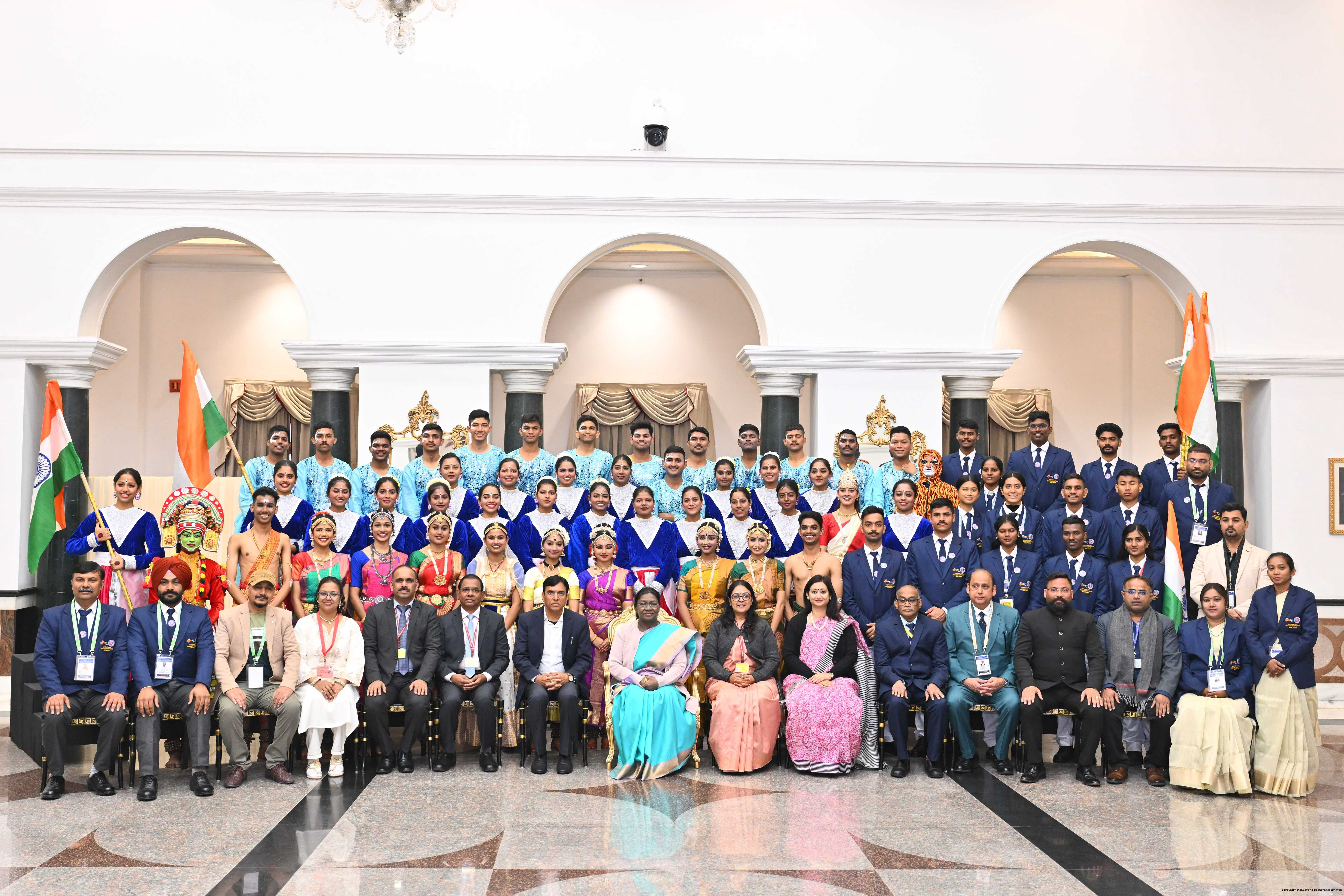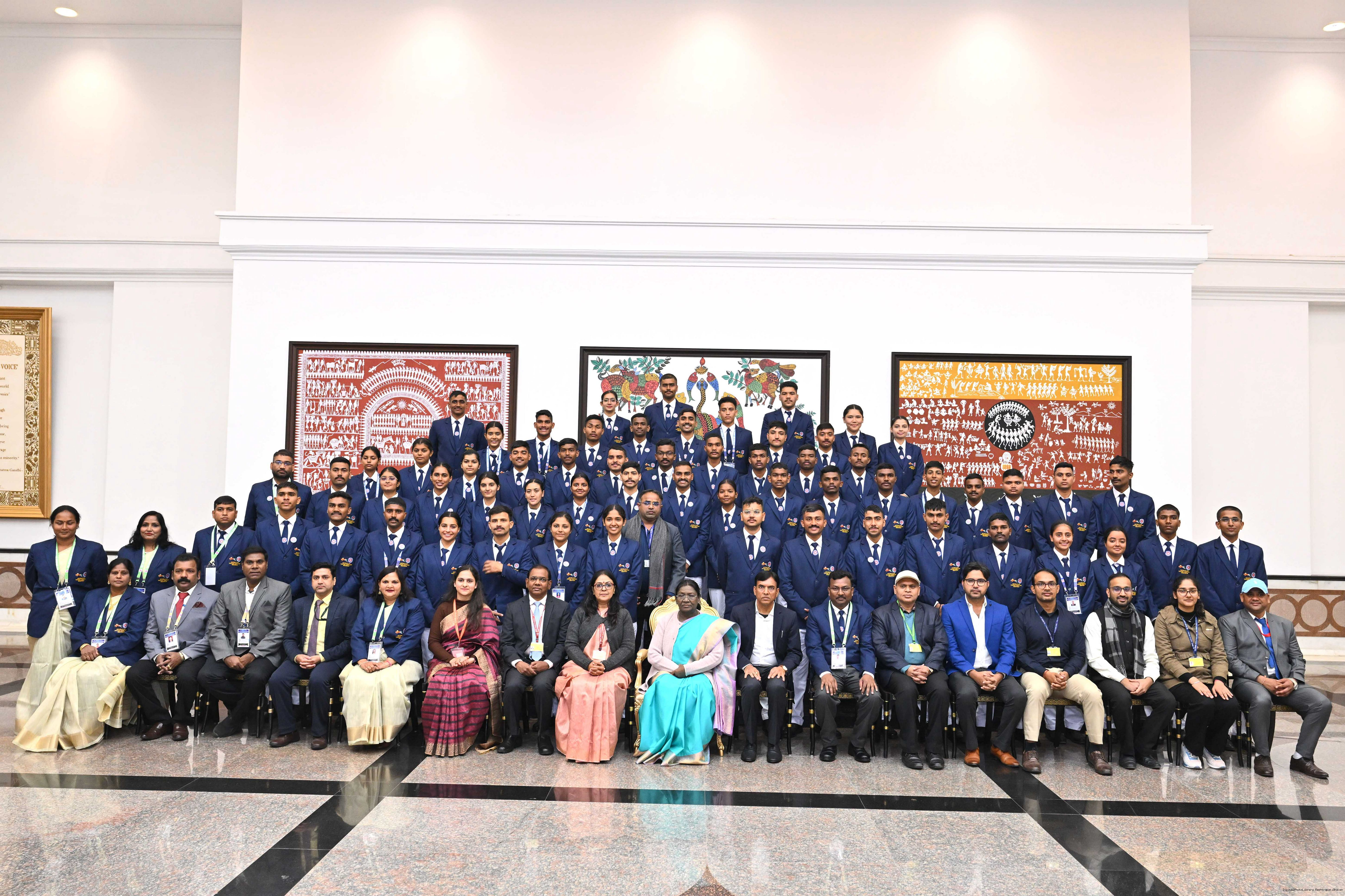 | Caption: | The President of India, Smt Droupadi Murmu met guests from tribal communities, tableaux artists and tractor drivers, NSS volunteers and NCC cadets, officials and other participants of the Republic Day Parade 2026 at Rashtrapati Bhavan on January 27, 2026. |