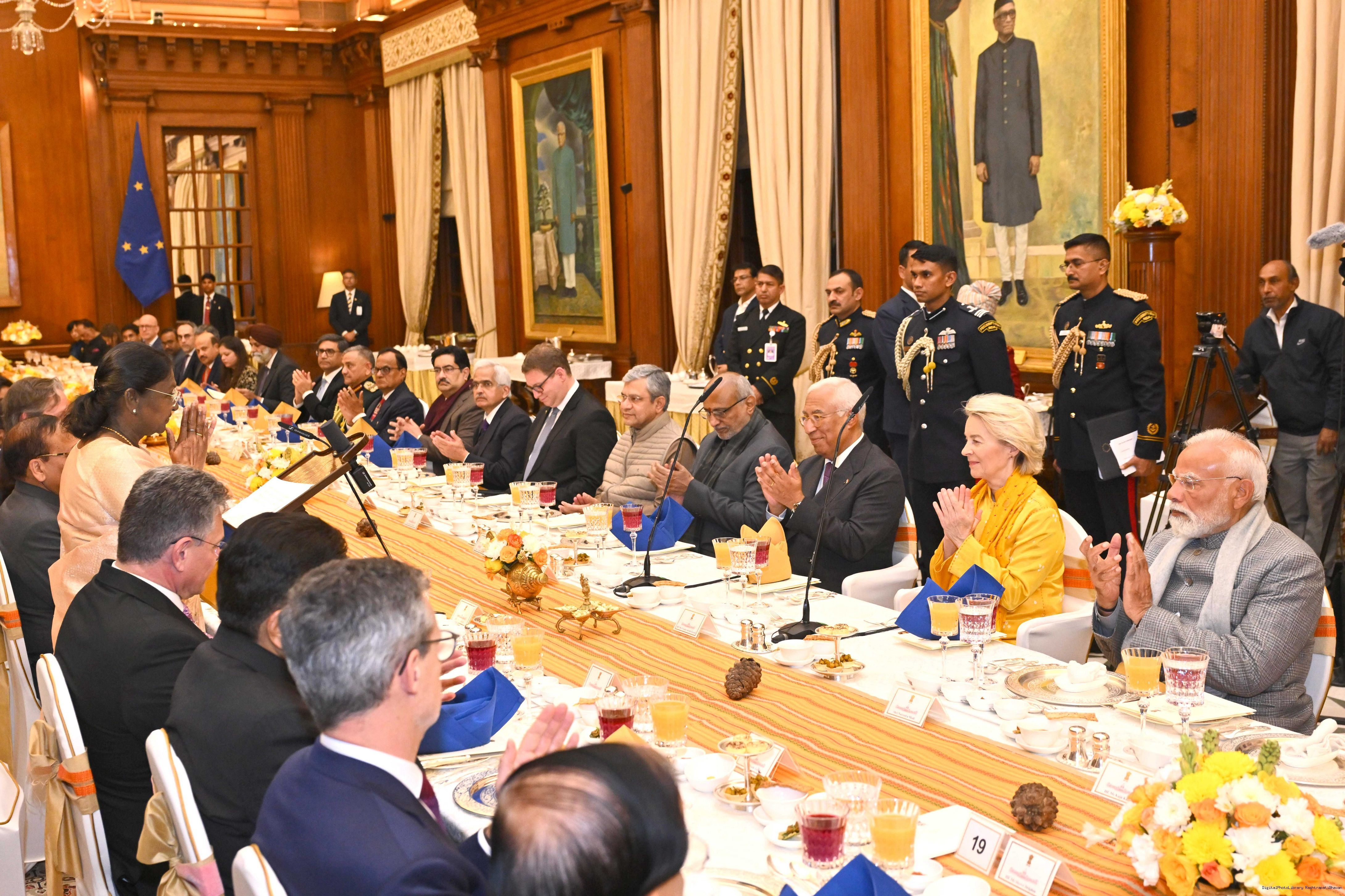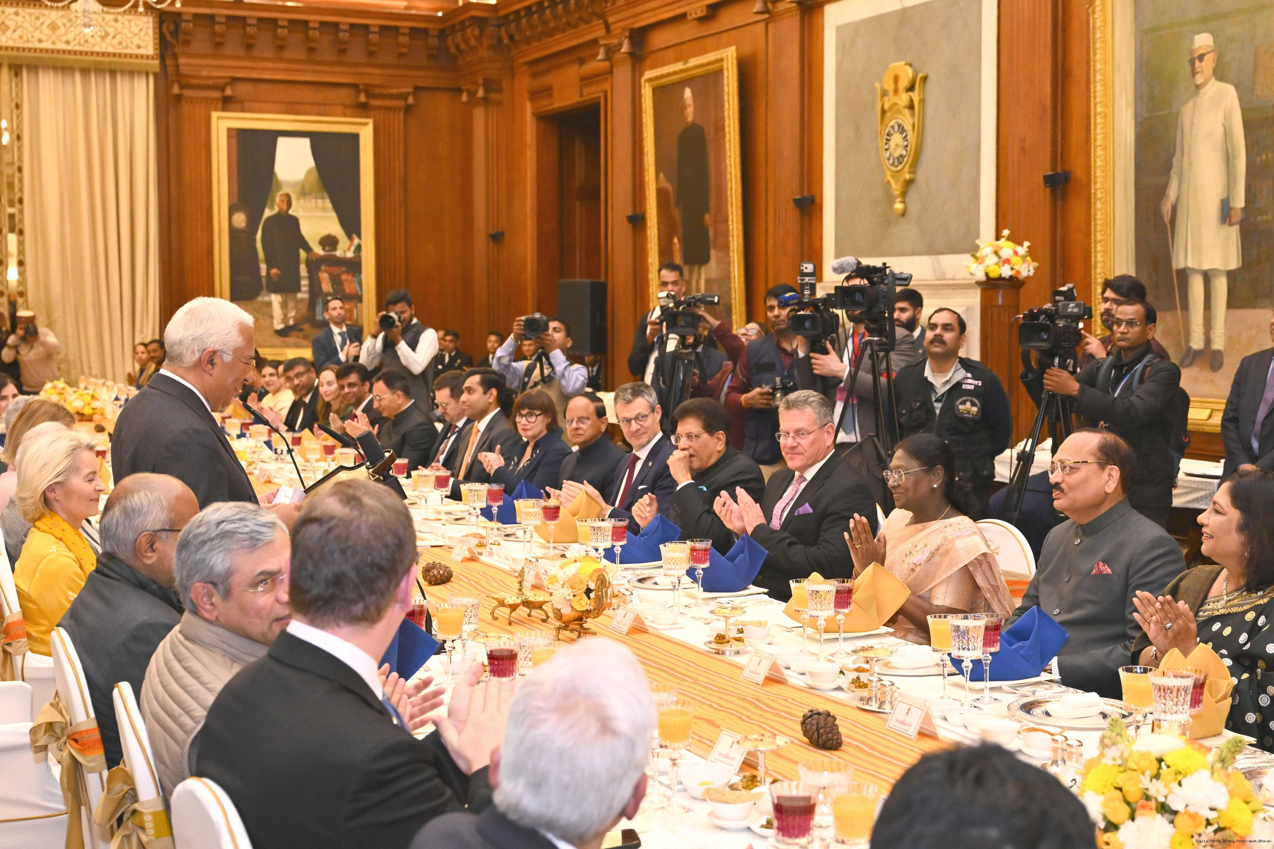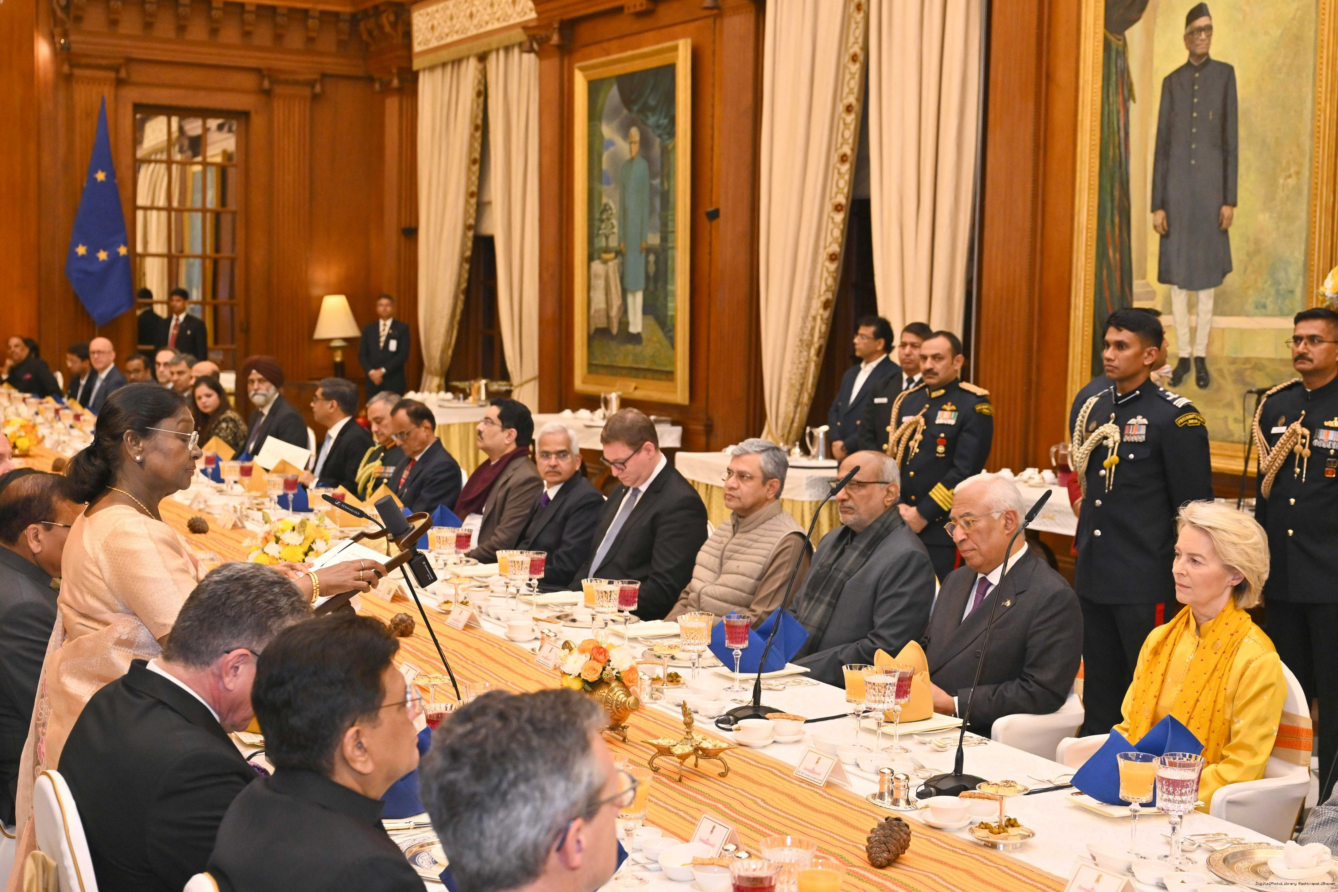 | Caption: | The President of India, Smt Droupadi Murmu hosted a banquet in the honour of the Chief Guests of the 77th Republic Day Celebrations, H. E. António Costa, President of the European Council and H. E. Ms Ursula von der Leyen, President of the European Commission at Rashtrapati Bhavan on January 27, 2026. |
