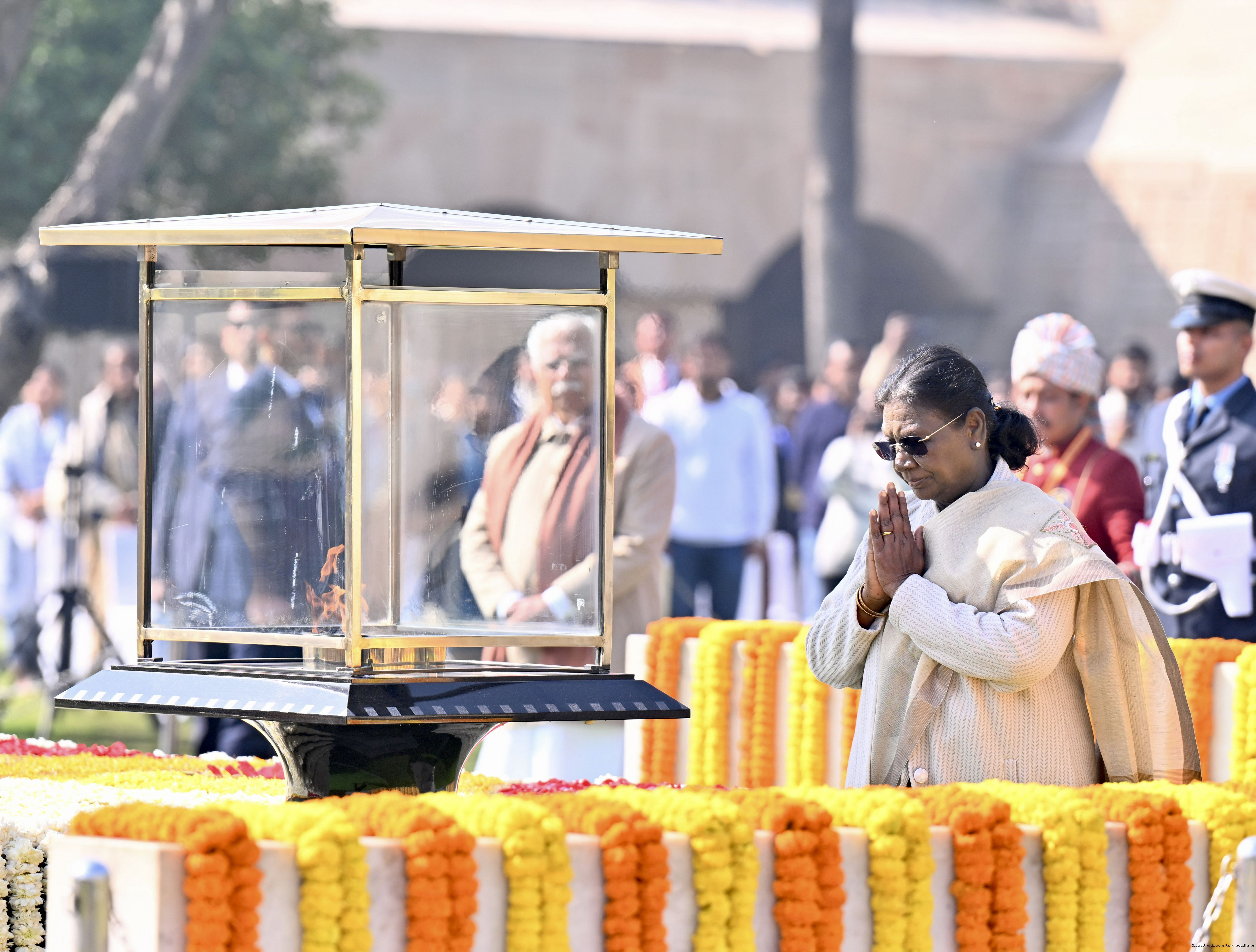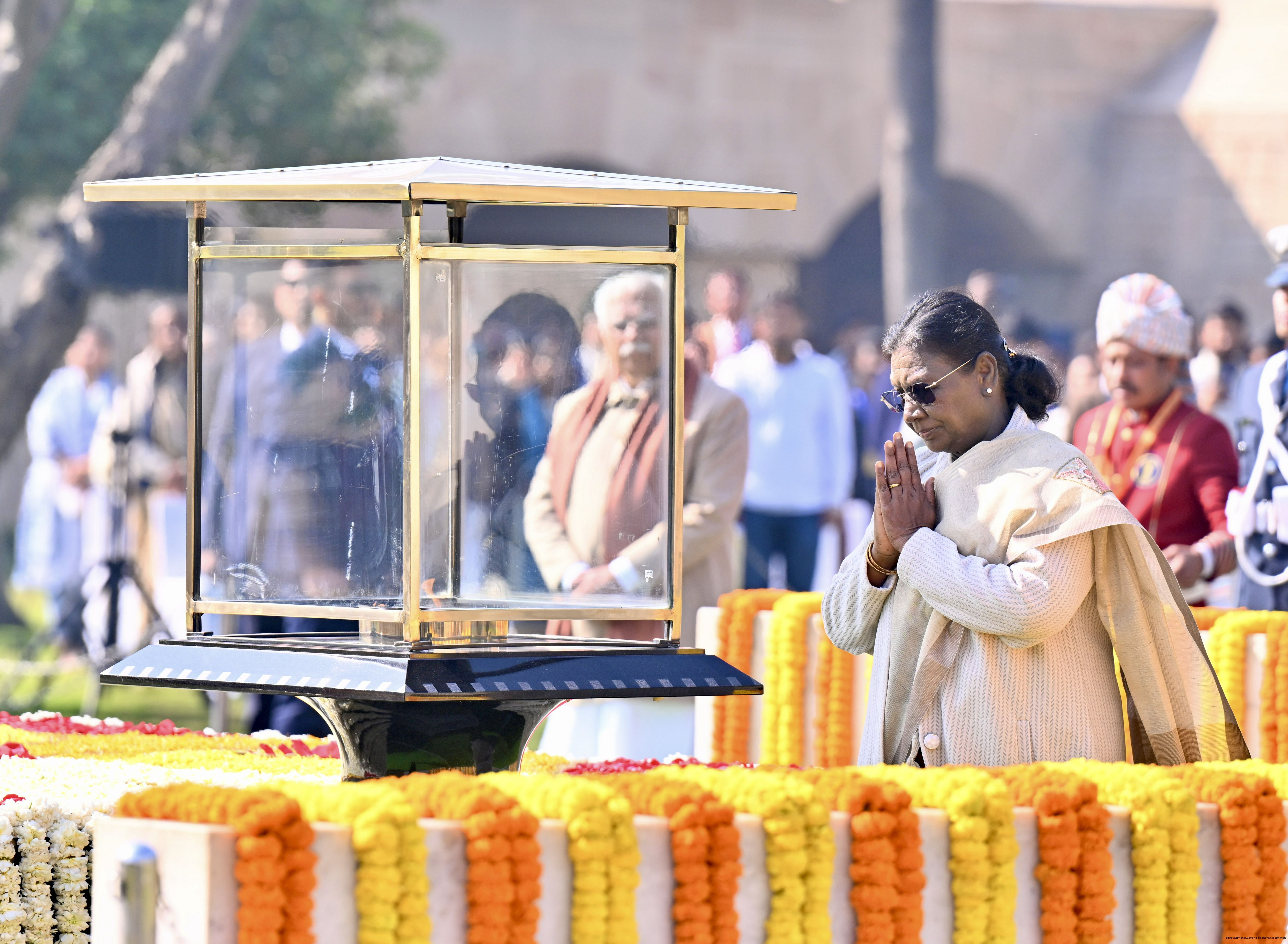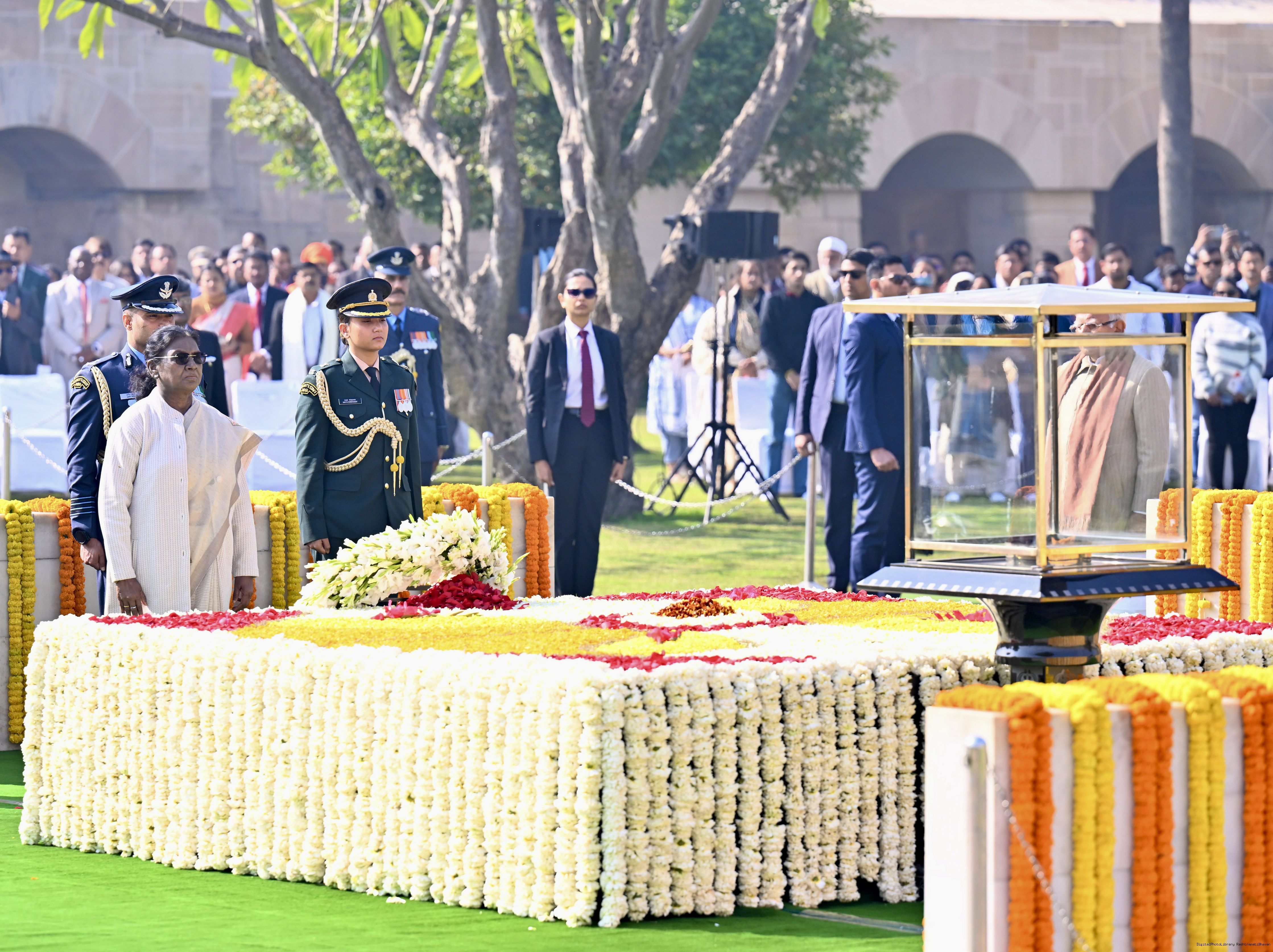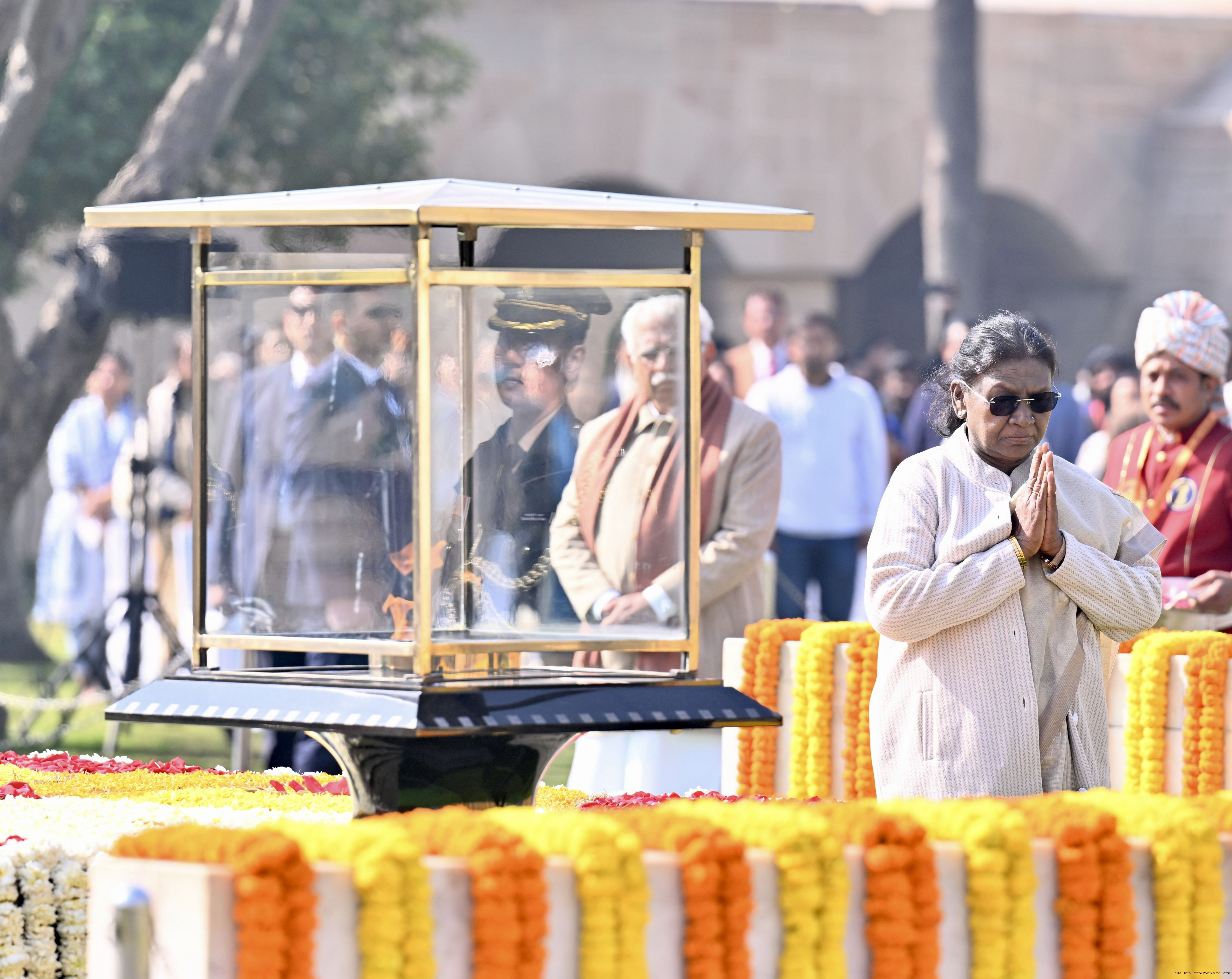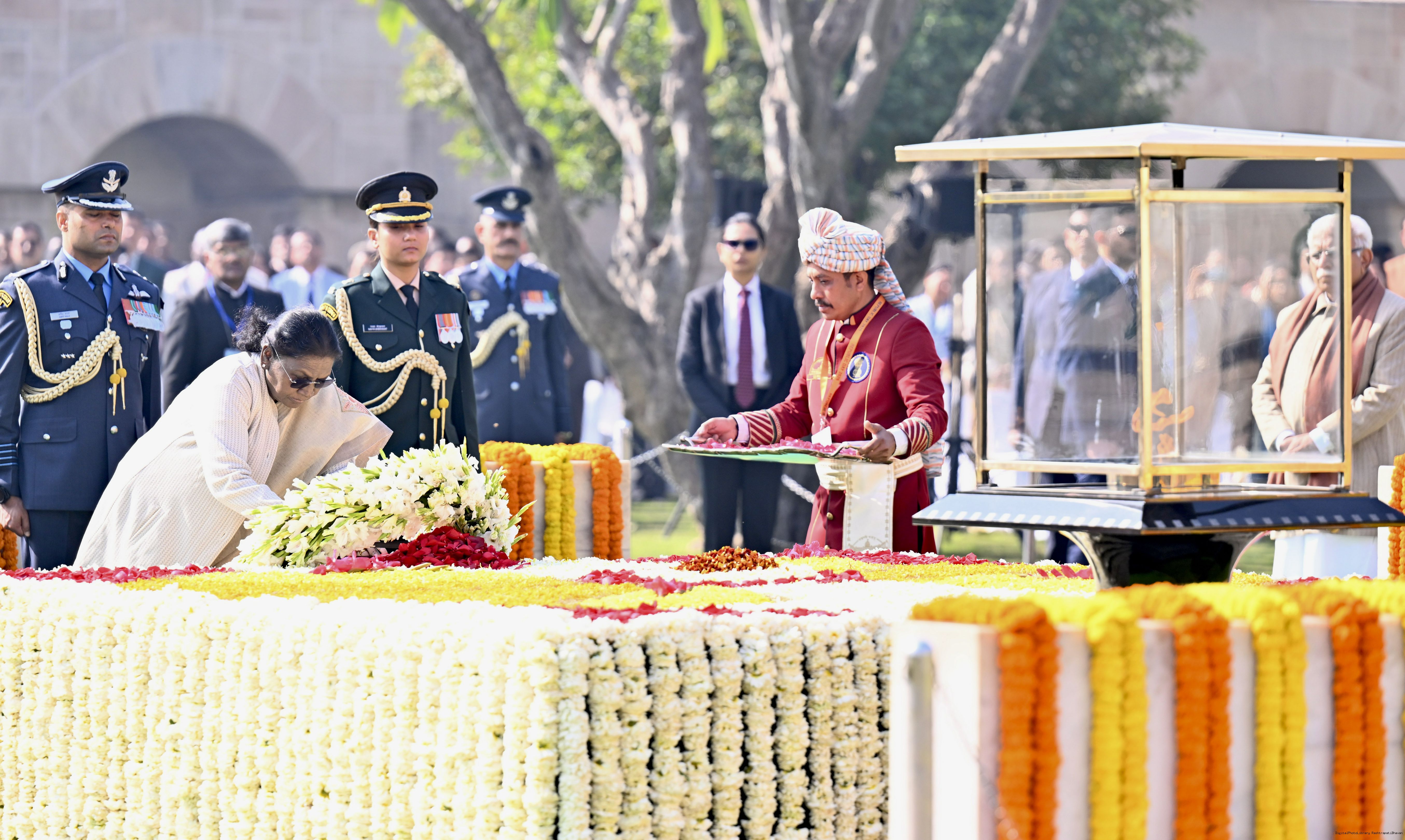 | Caption: | The President of India, Smt Droupadi Murmu paid homage to Mahatma Gandhi on his 78th Punyatithi and attended a Sarva Dharma Prarthana at Rajghat, New Delhi on January 30, 2026. |