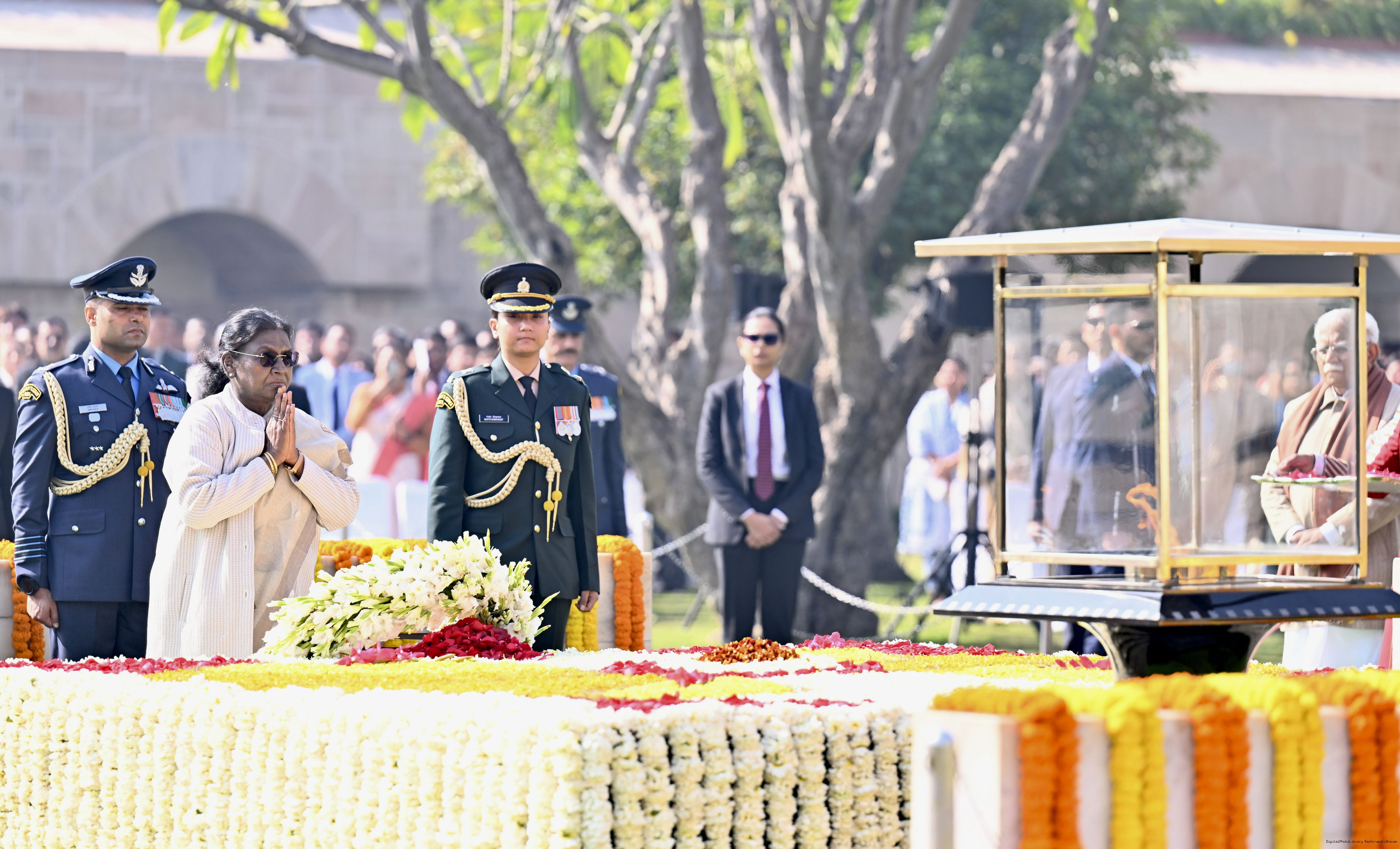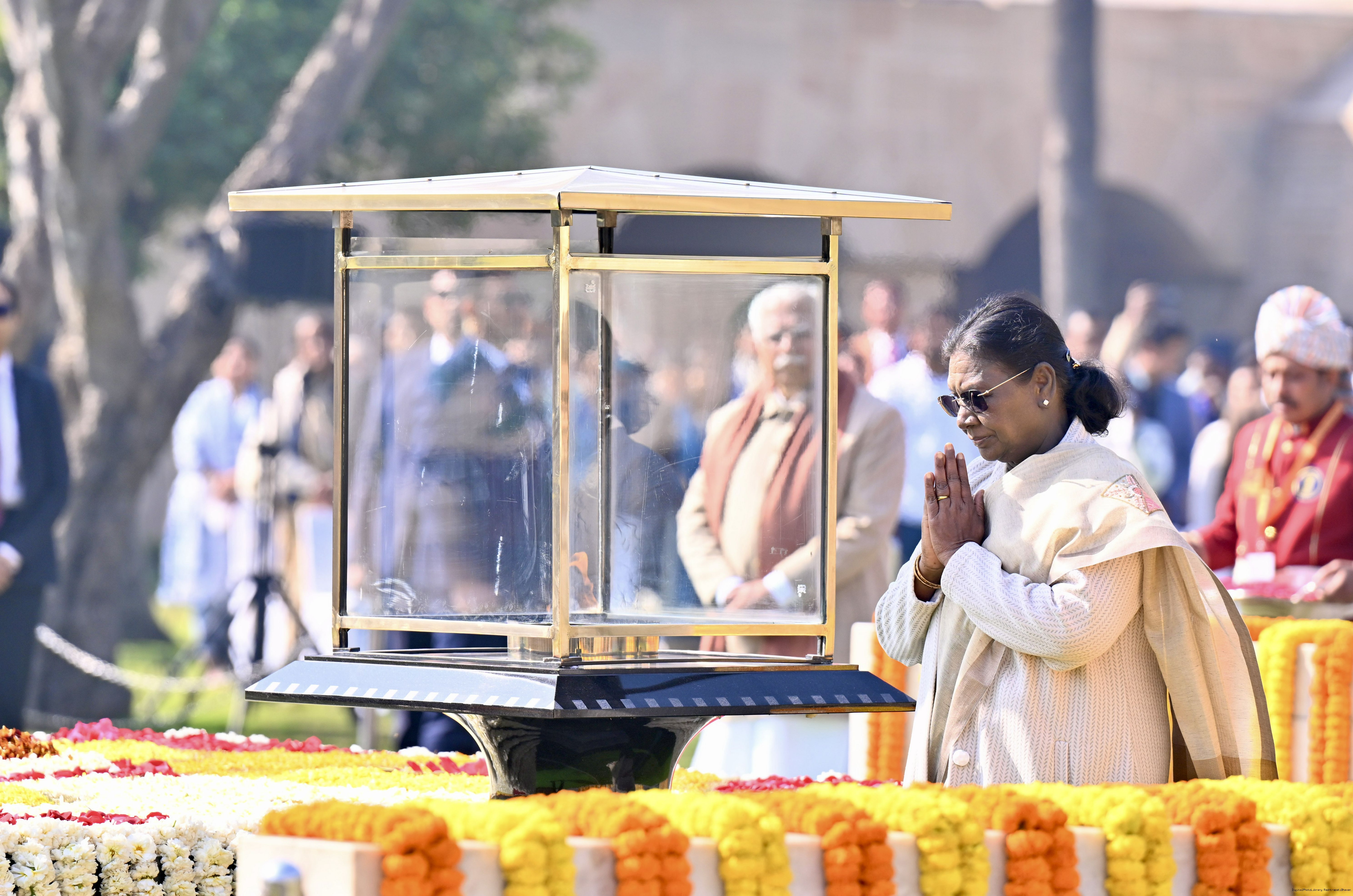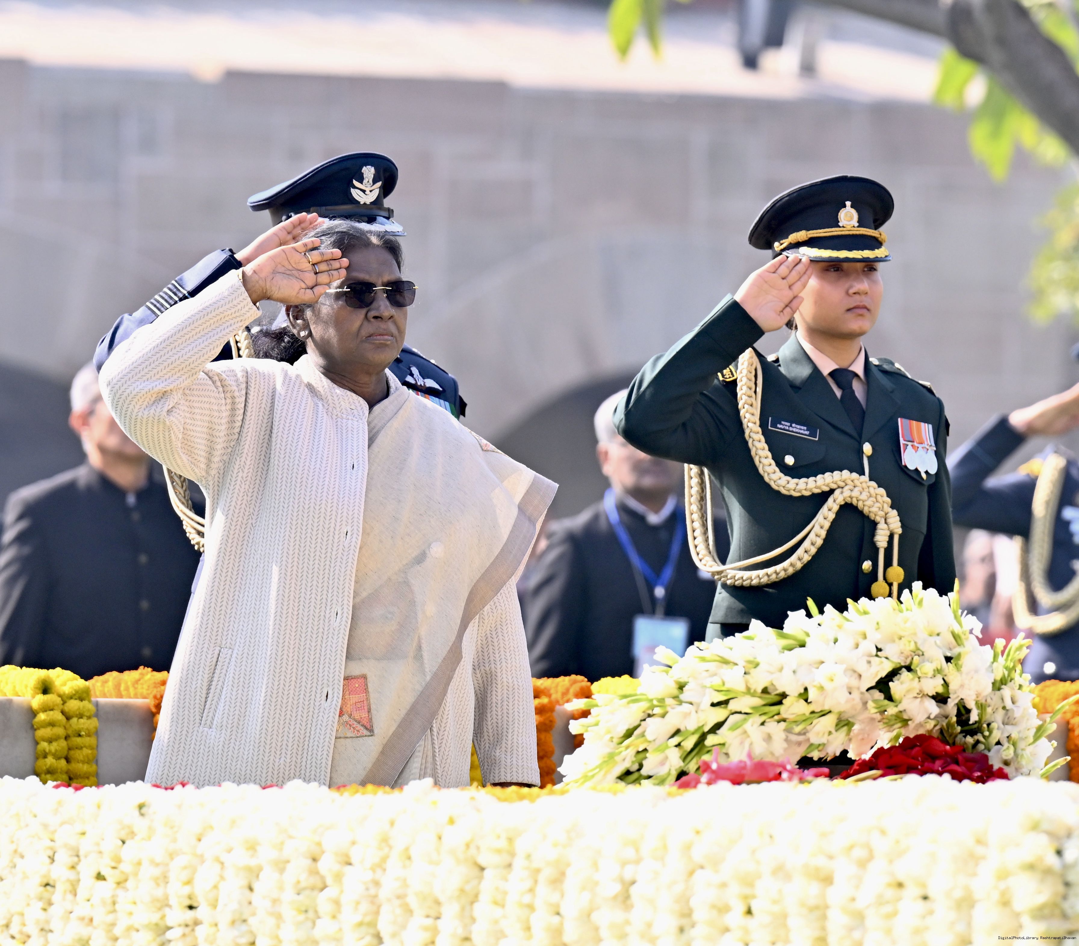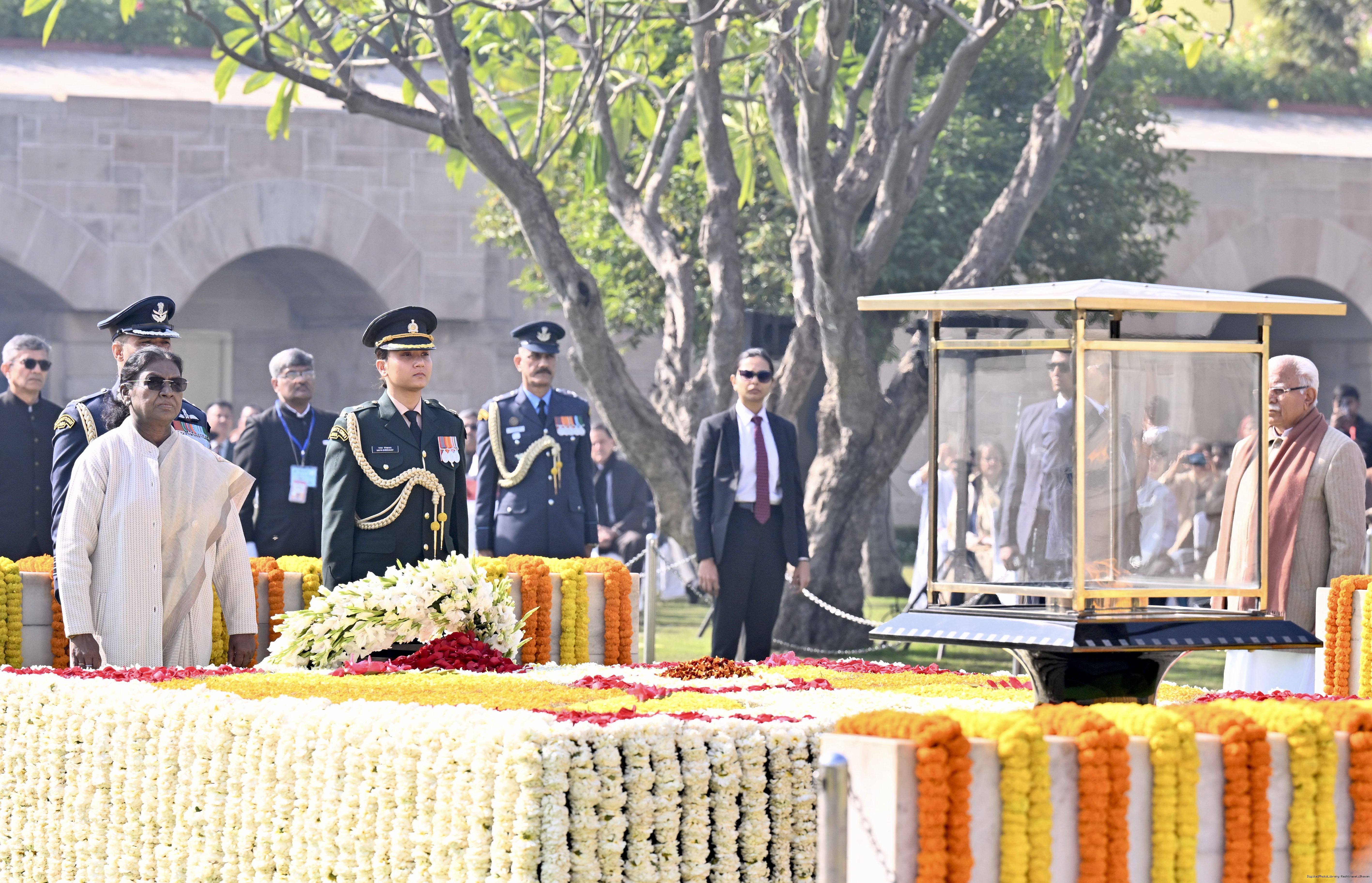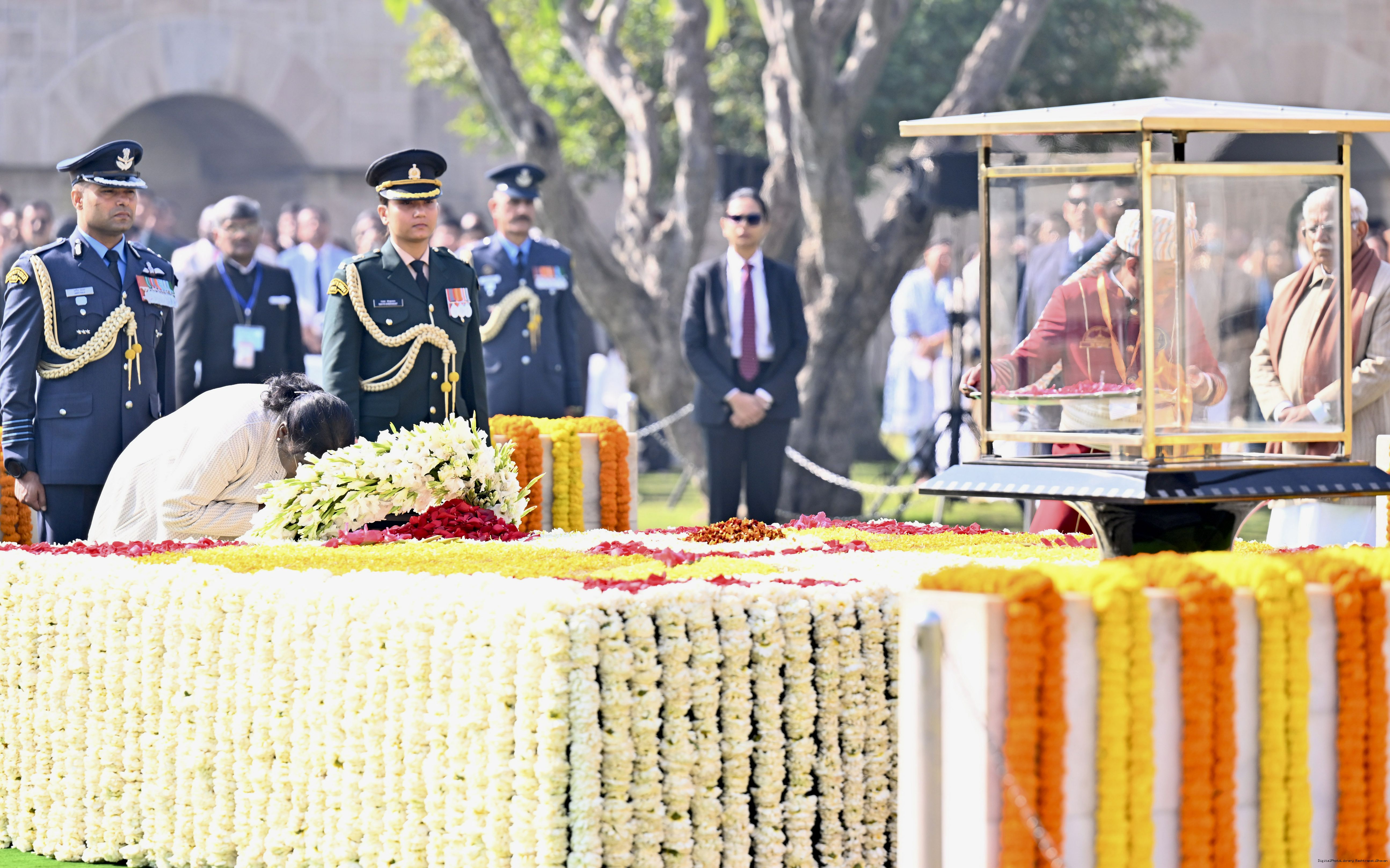 | Caption: | The President of India, Smt Droupadi Murmu paid homage to Mahatma Gandhi on his 78th Punyatithi and attended a Sarva Dharma Prarthana at Rajghat, New Delhi on January 30, 2026. |