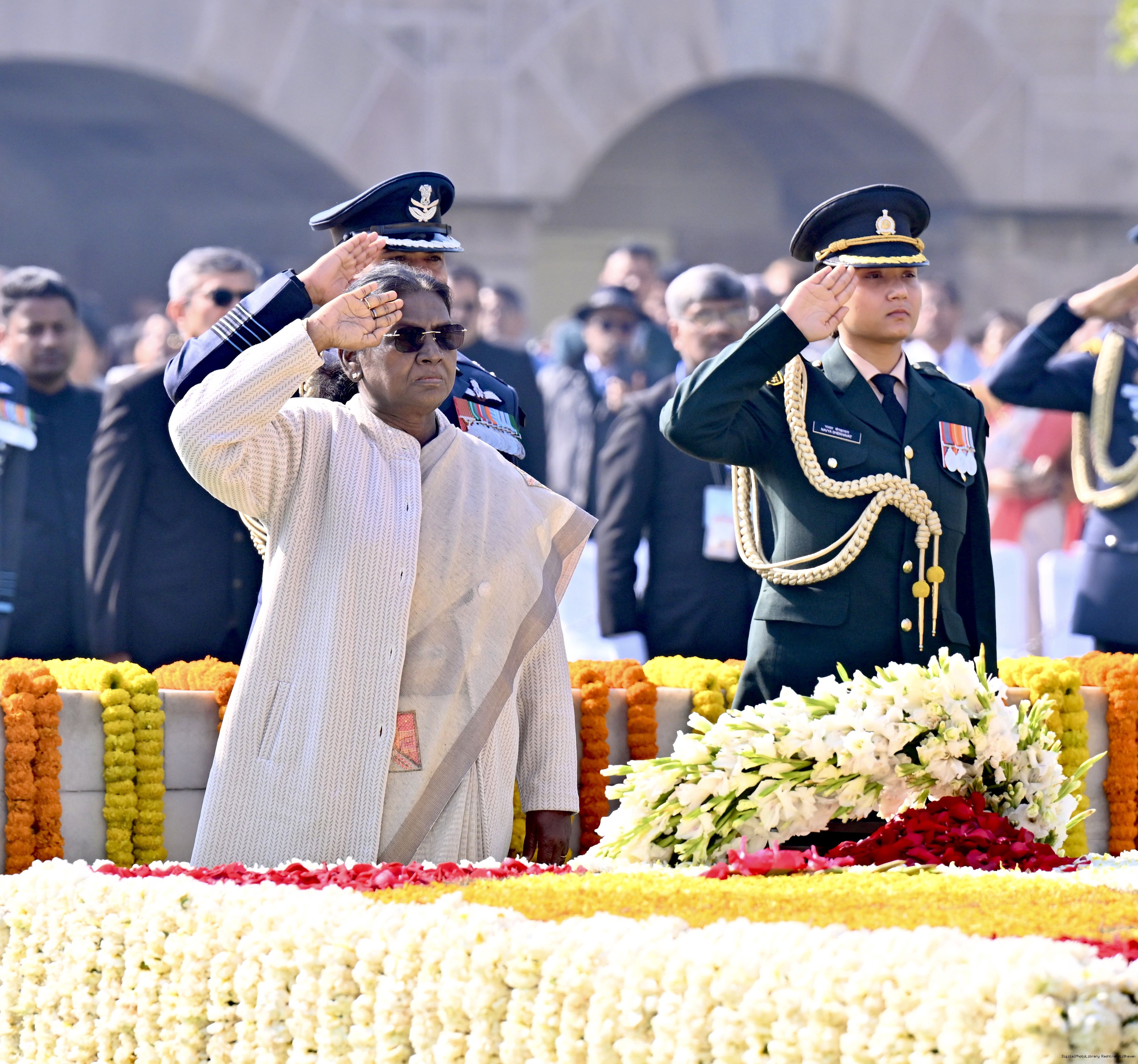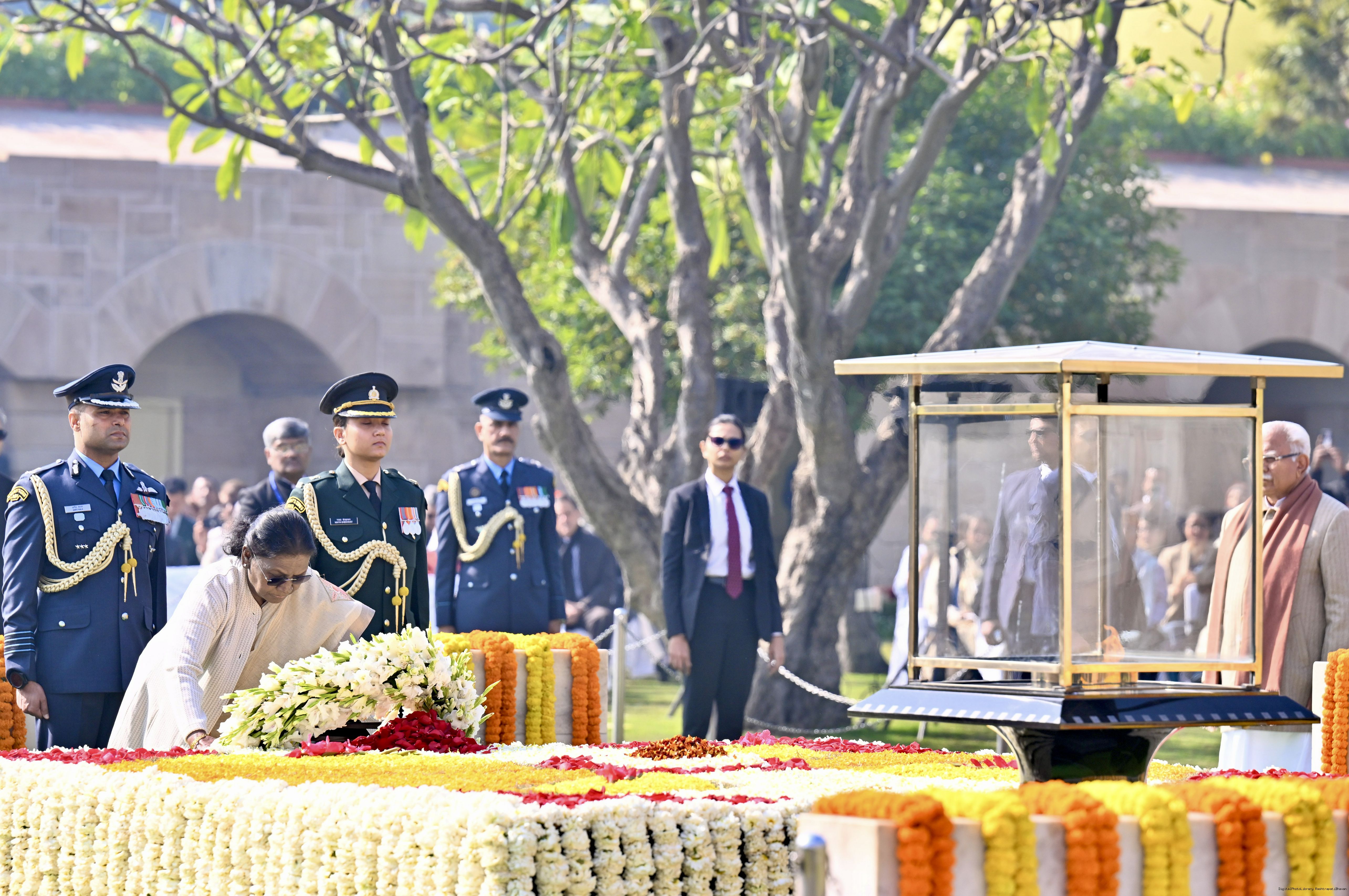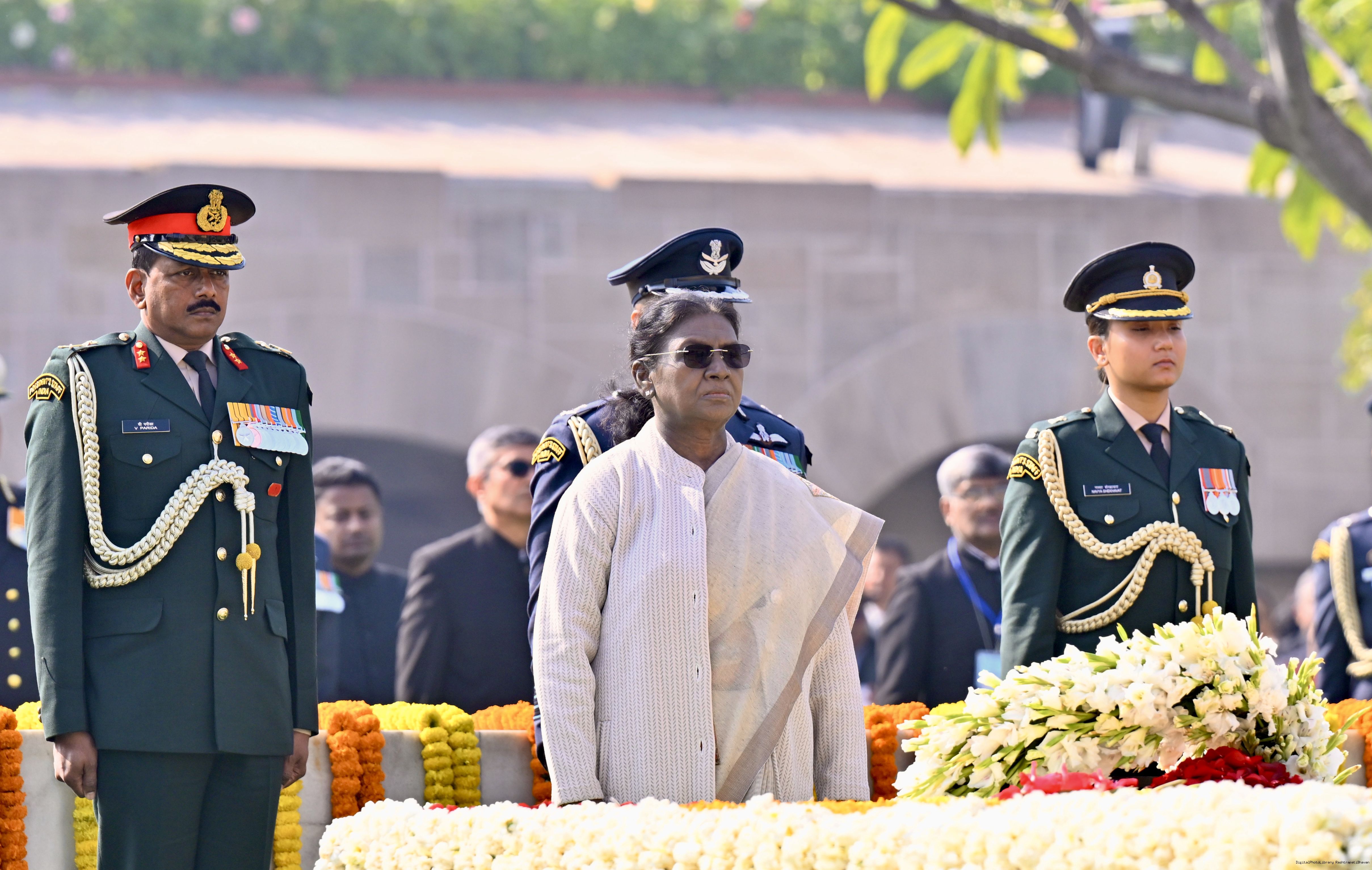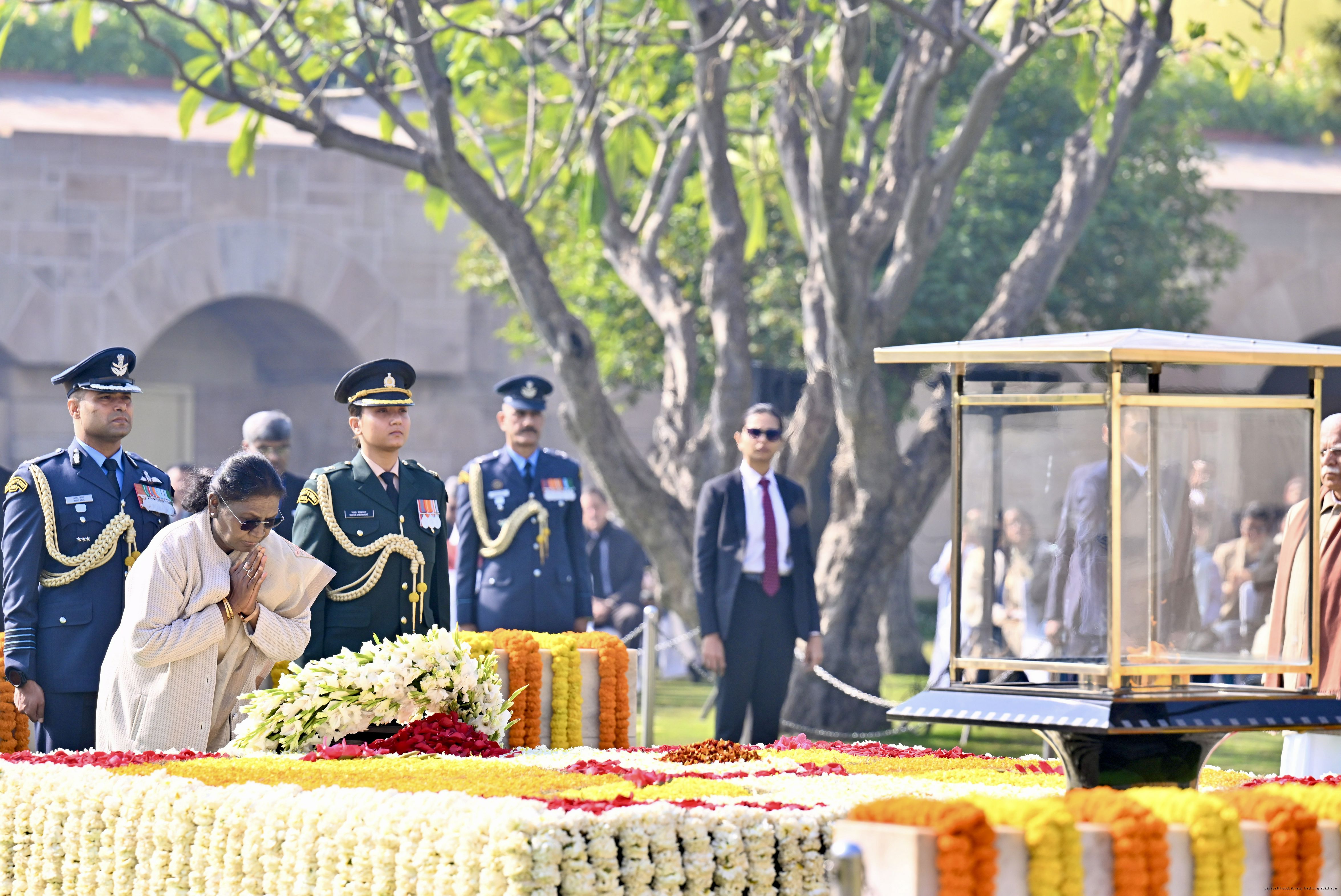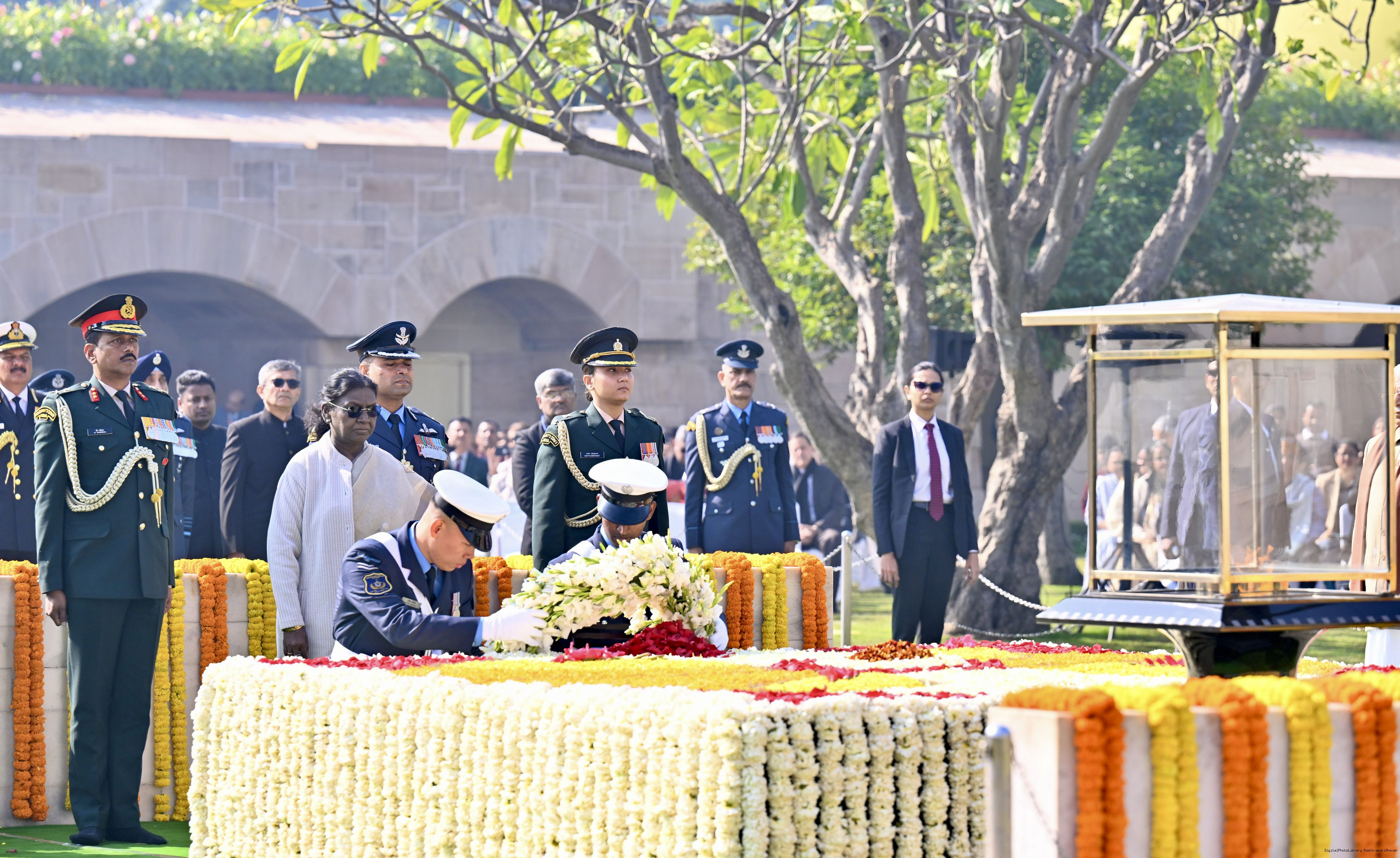 | Caption: | The President of India, Smt Droupadi Murmu paid homage to Mahatma Gandhi on his 78th Punyatithi and attended a Sarva Dharma Prarthana at Rajghat, New Delhi on January 30, 2026. |