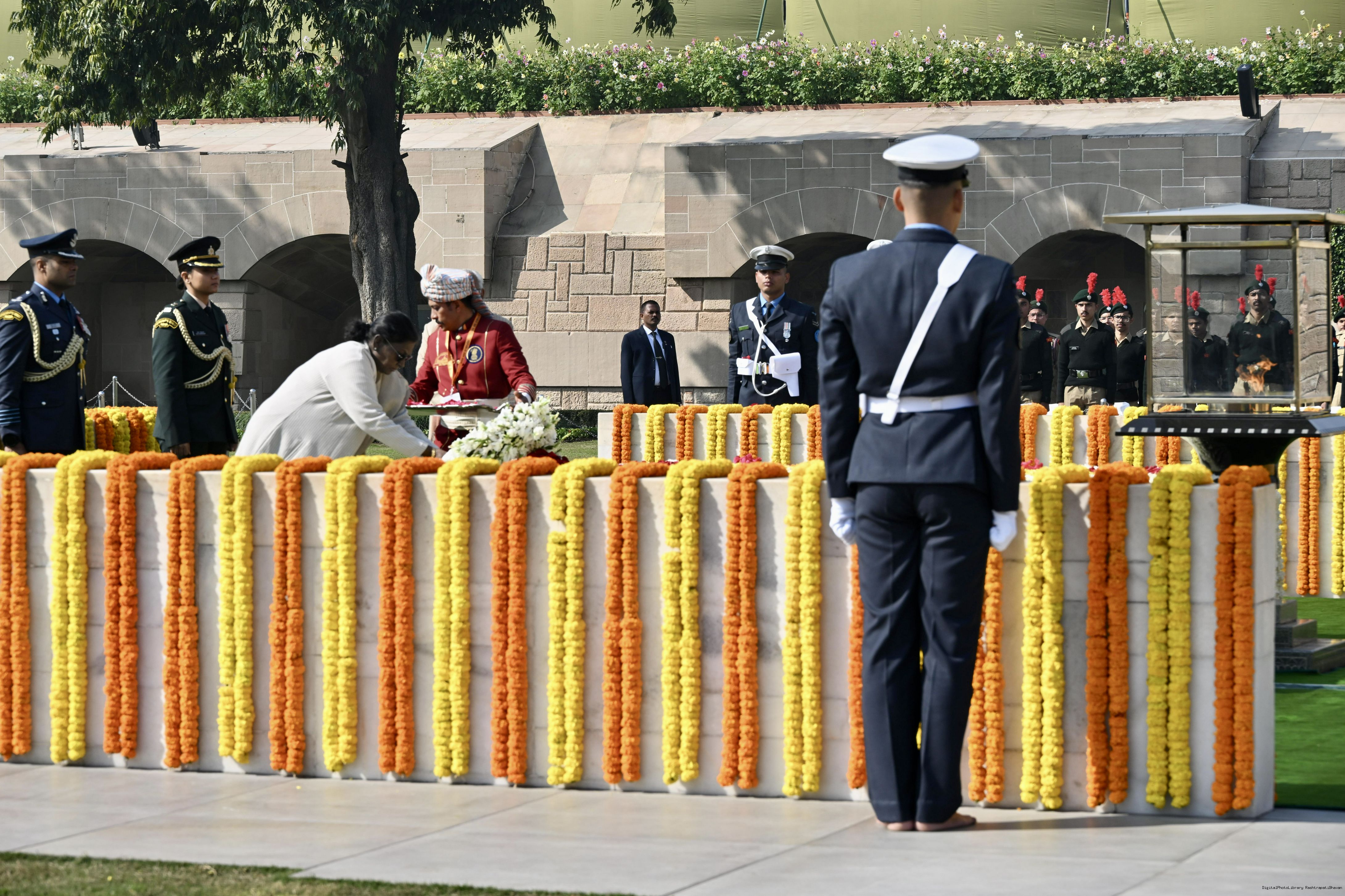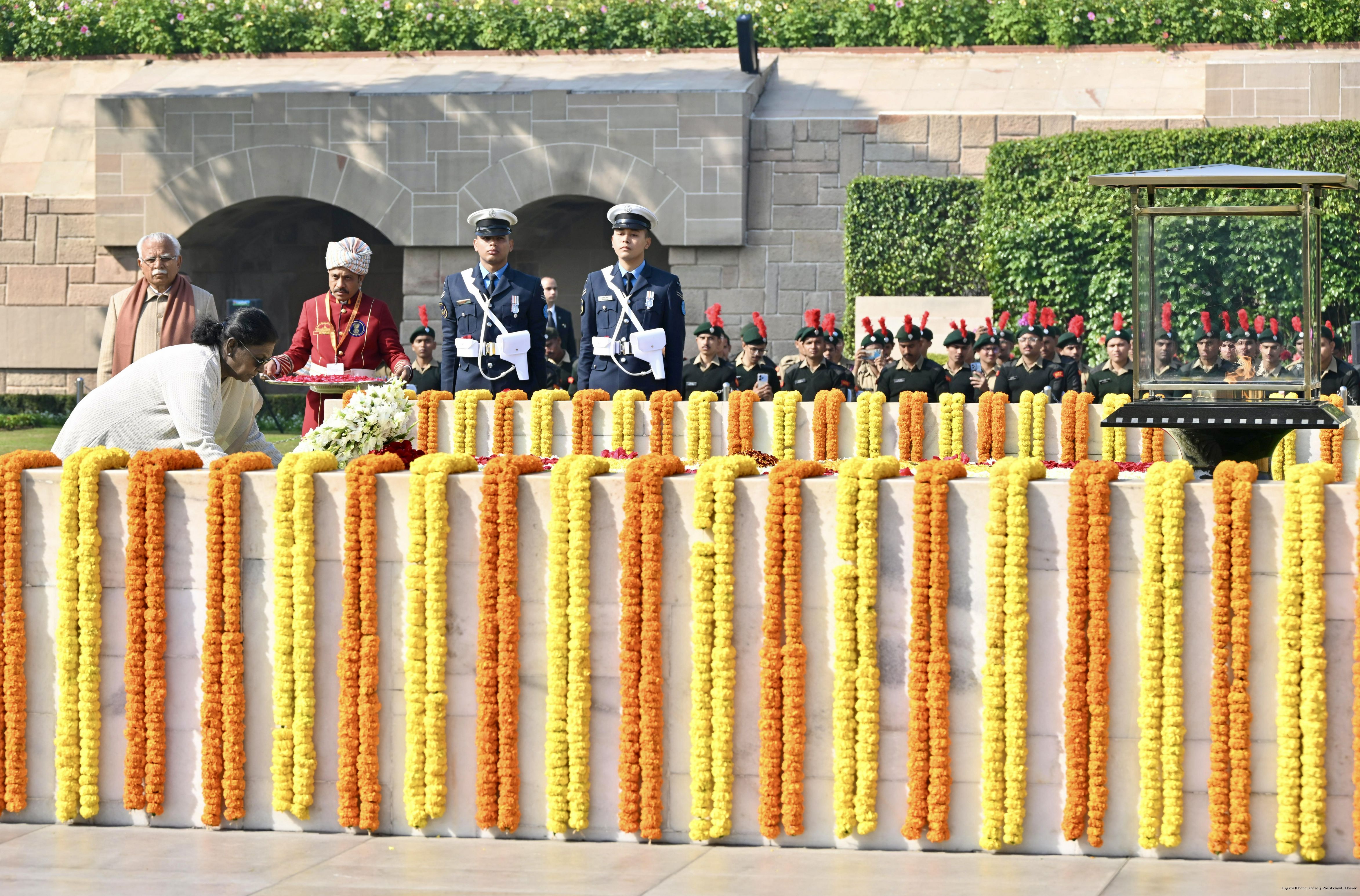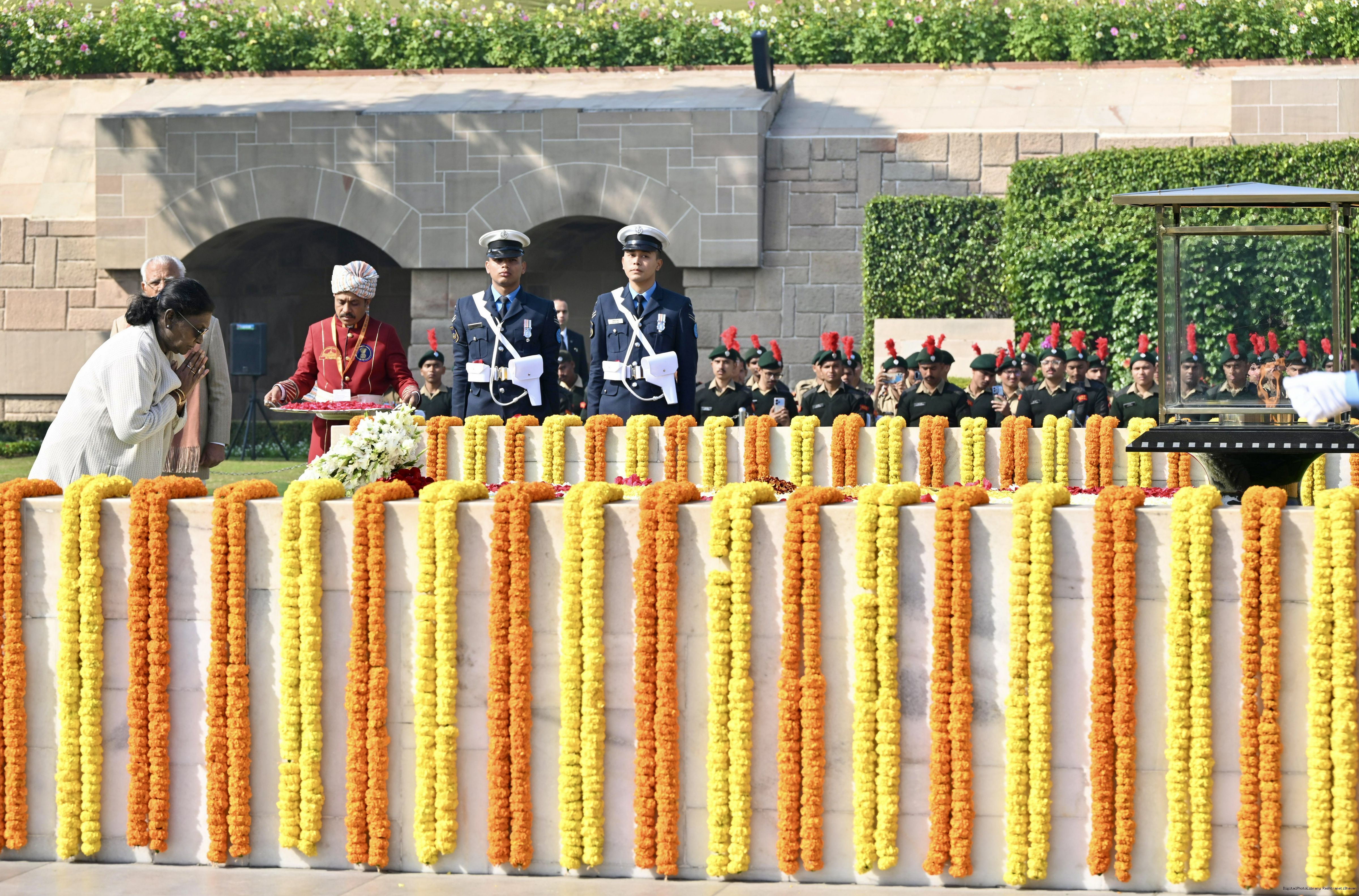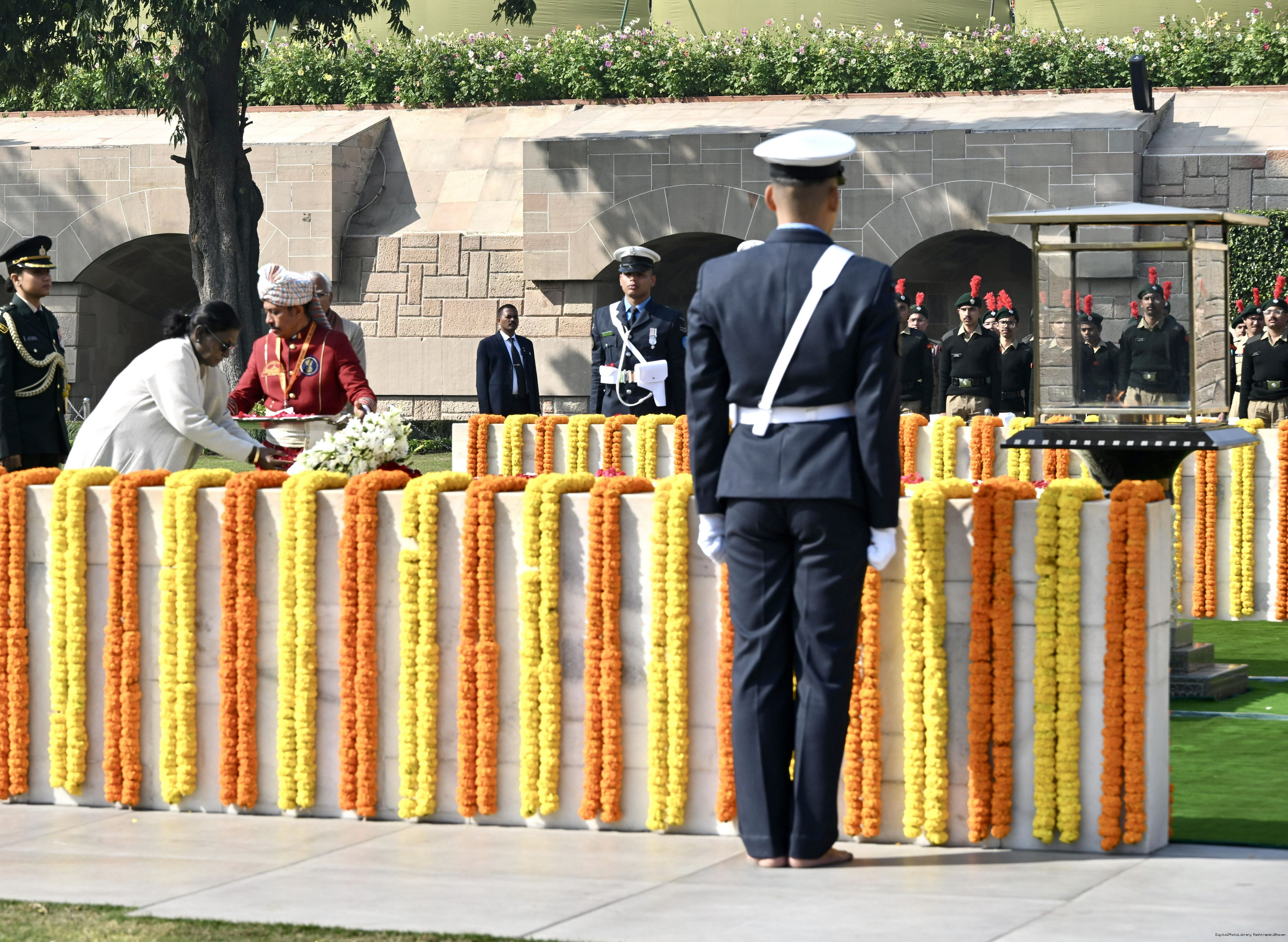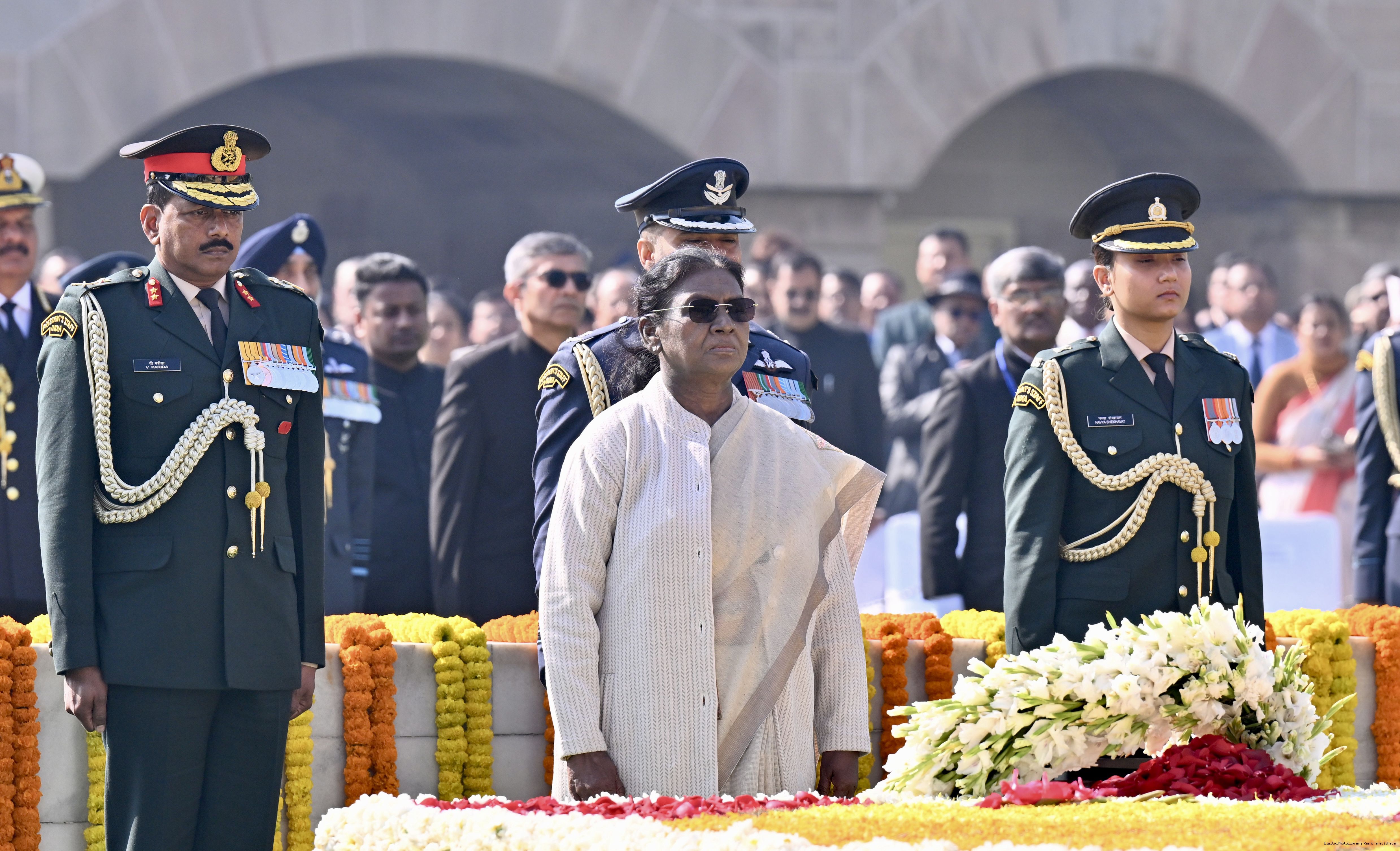 | Caption: | The President of India, Smt Droupadi Murmu paid homage to Mahatma Gandhi on his 78th Punyatithi and attended a Sarva Dharma Prarthana at Rajghat, New Delhi on January 30, 2026. |