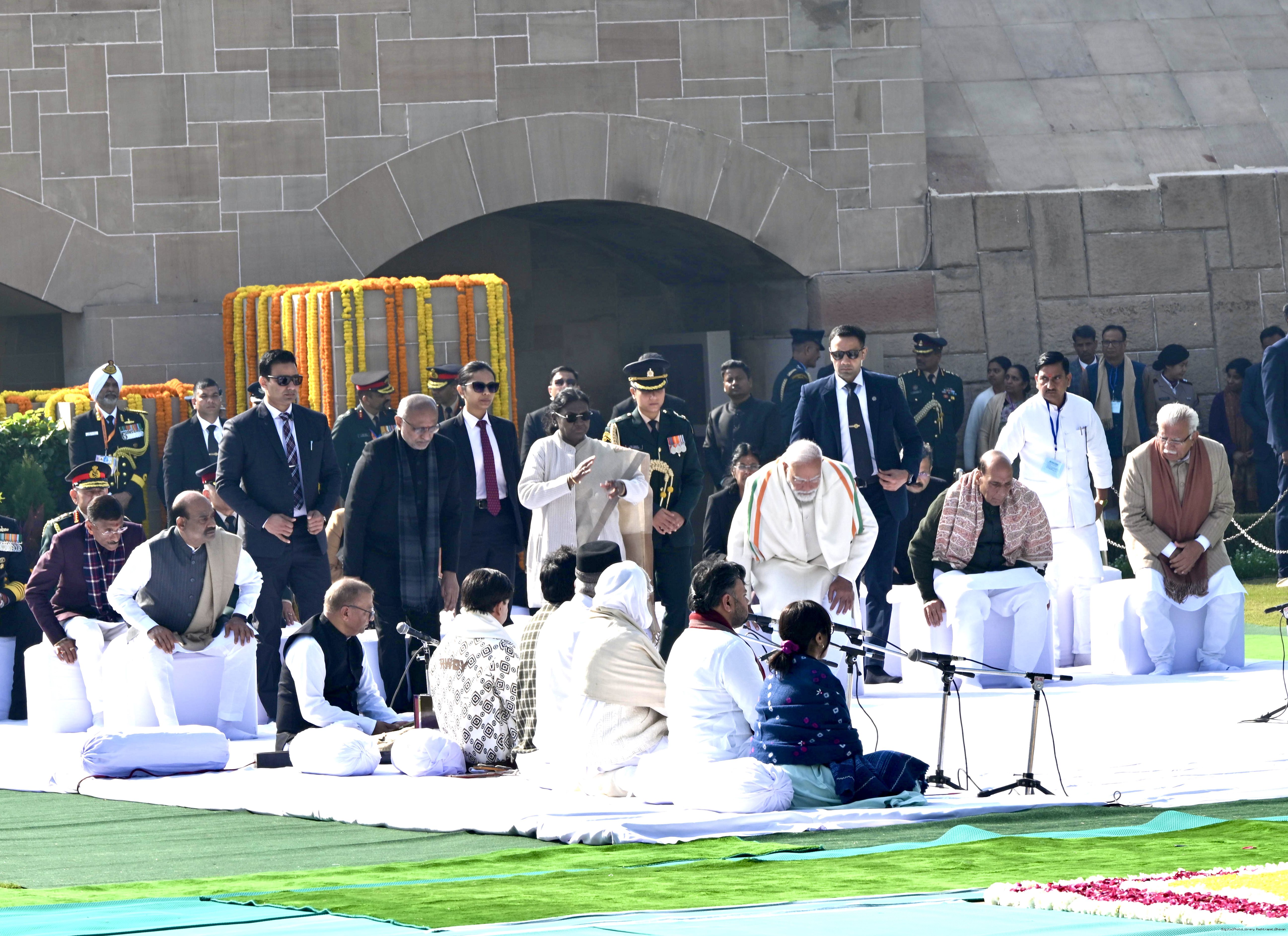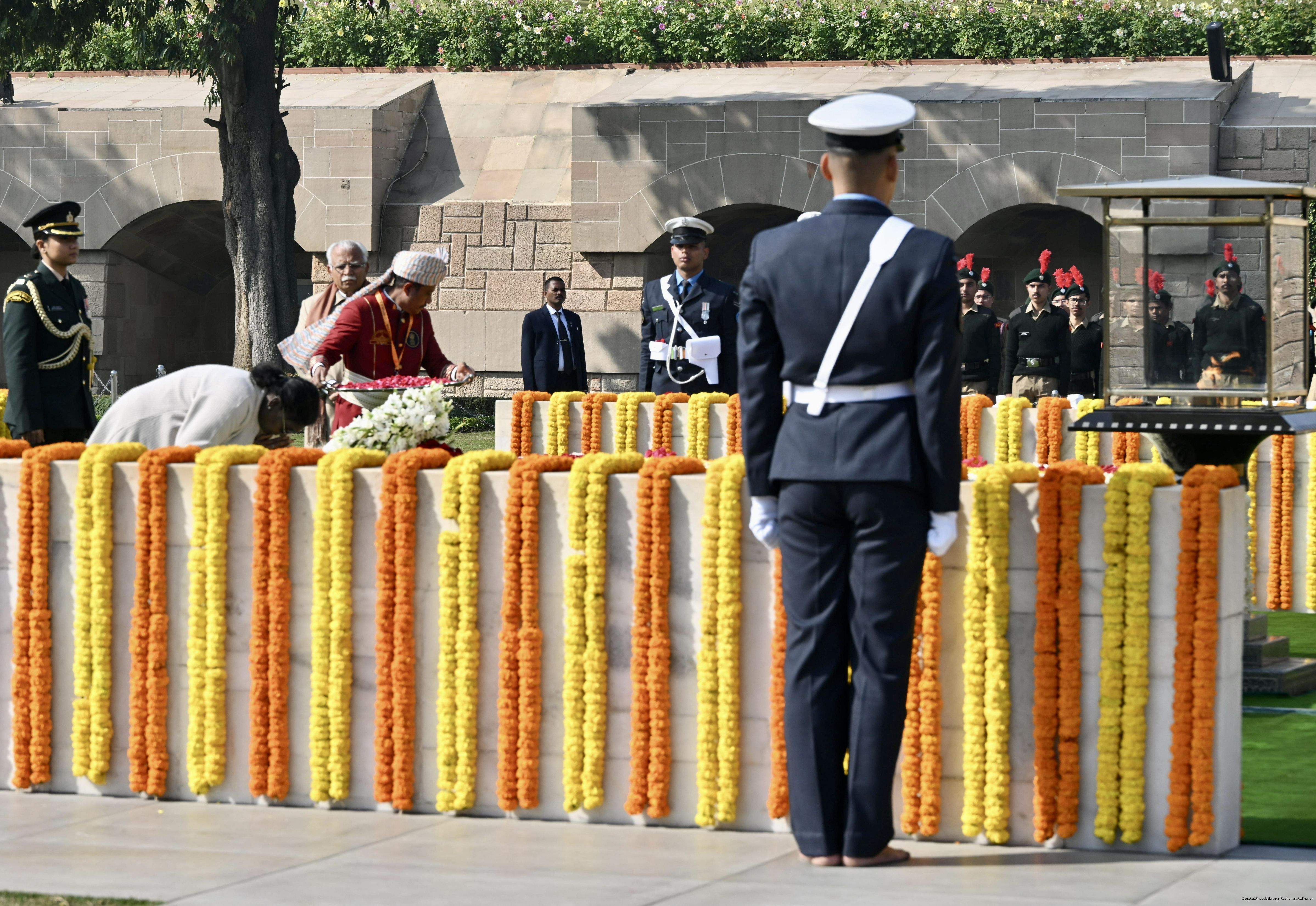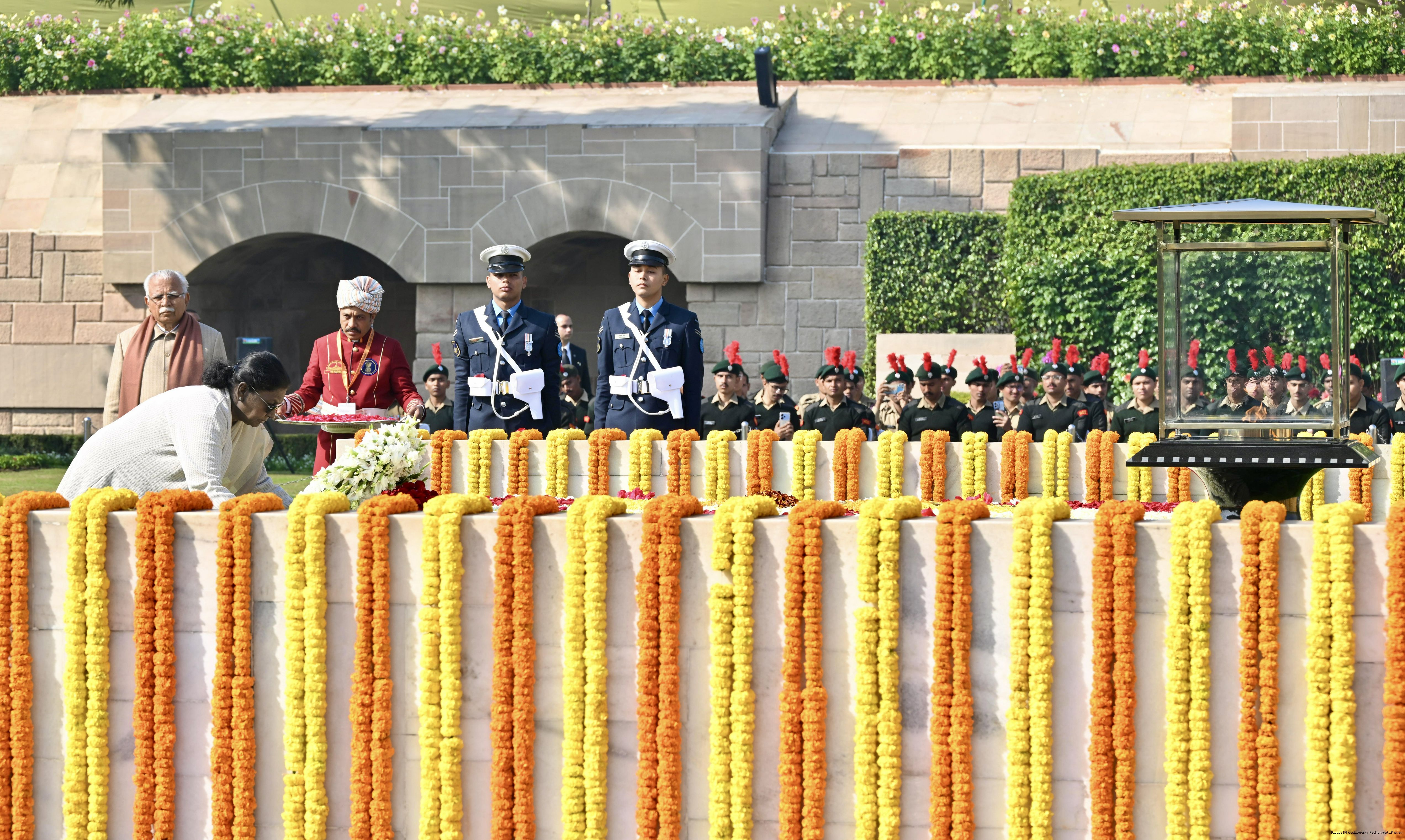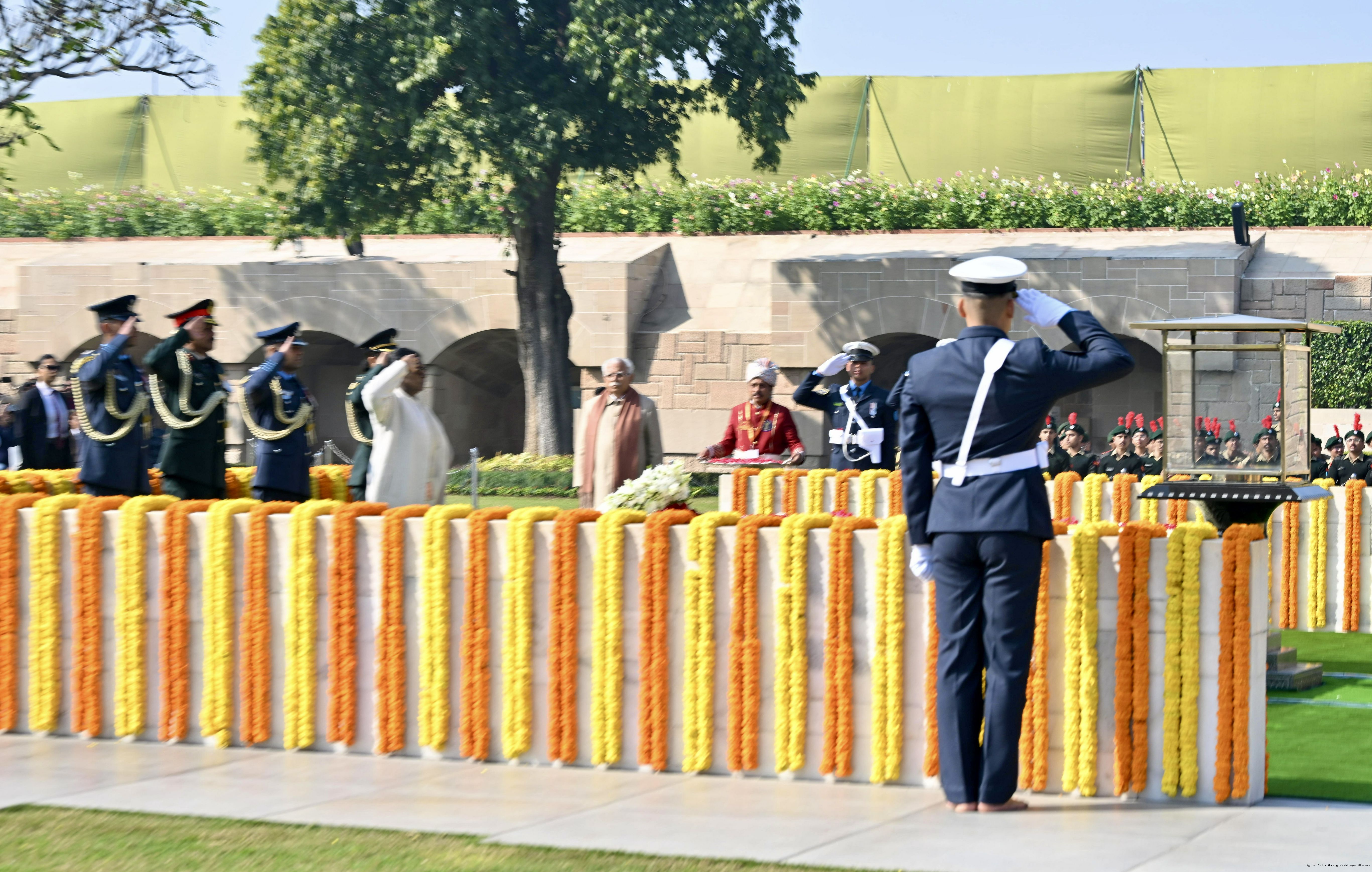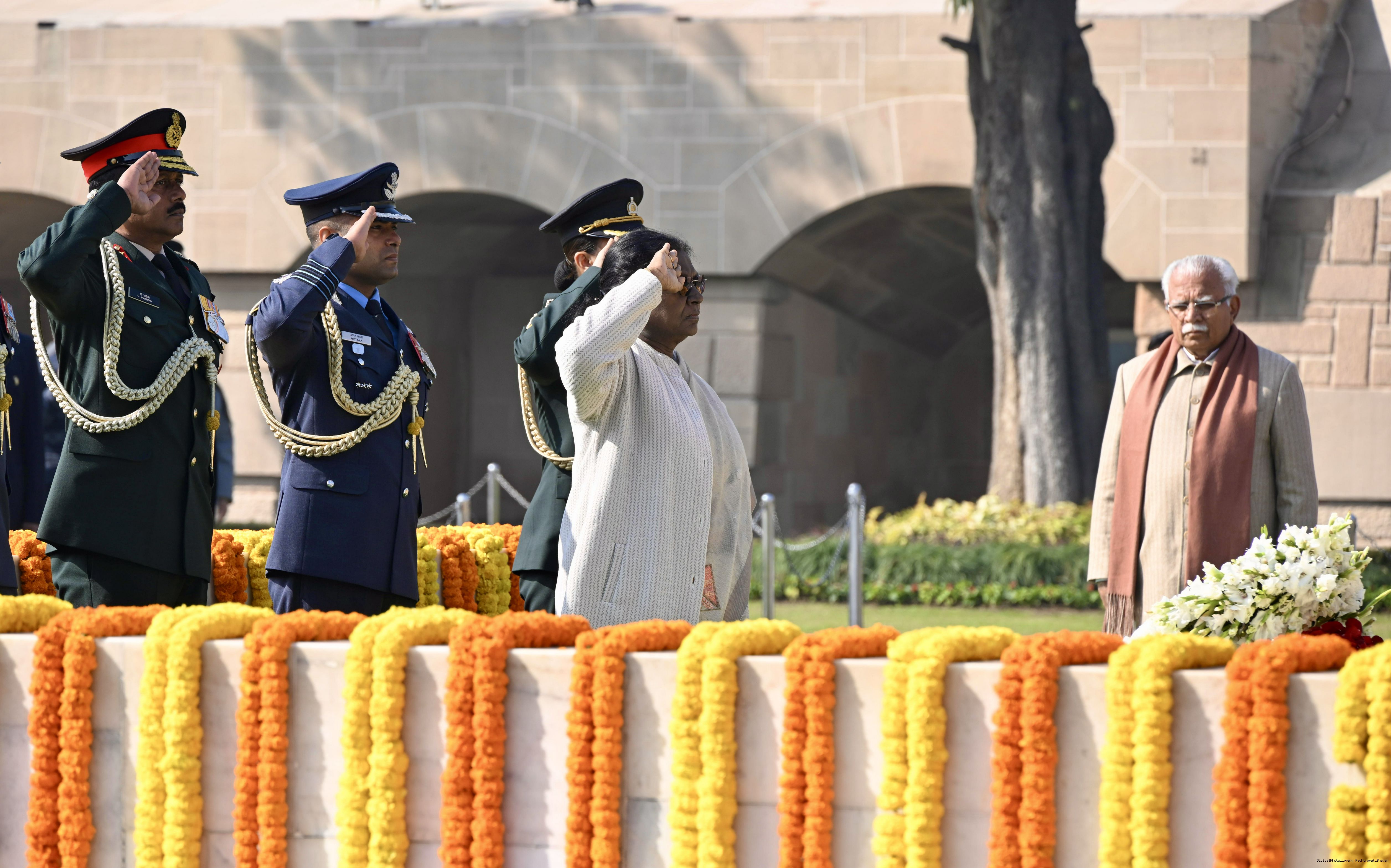 | Caption: | The President of India, Smt Droupadi Murmu paid homage to Mahatma Gandhi on his 78th Punyatithi and attended a Sarva Dharma Prarthana at Rajghat, New Delhi on January 30, 2026. |