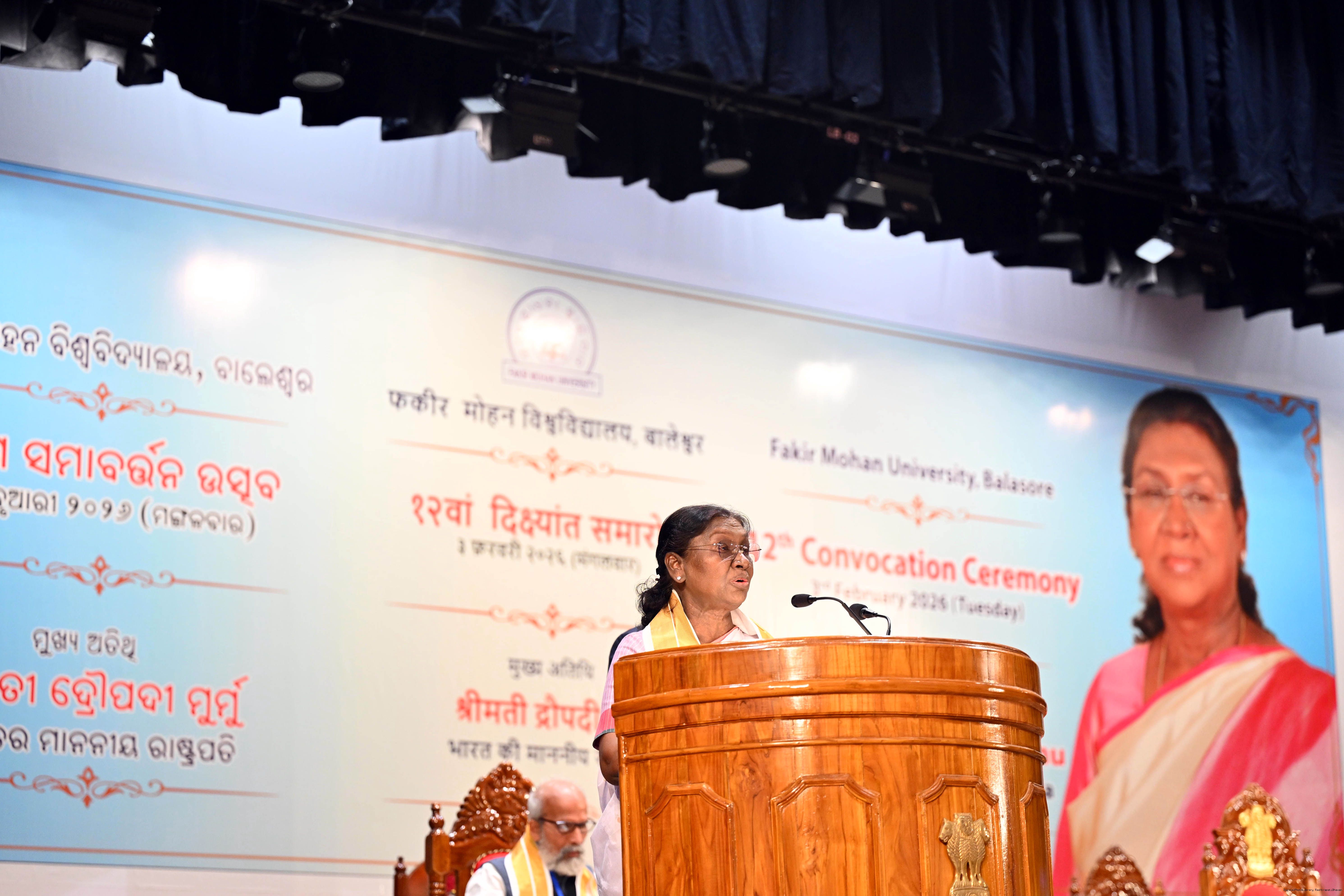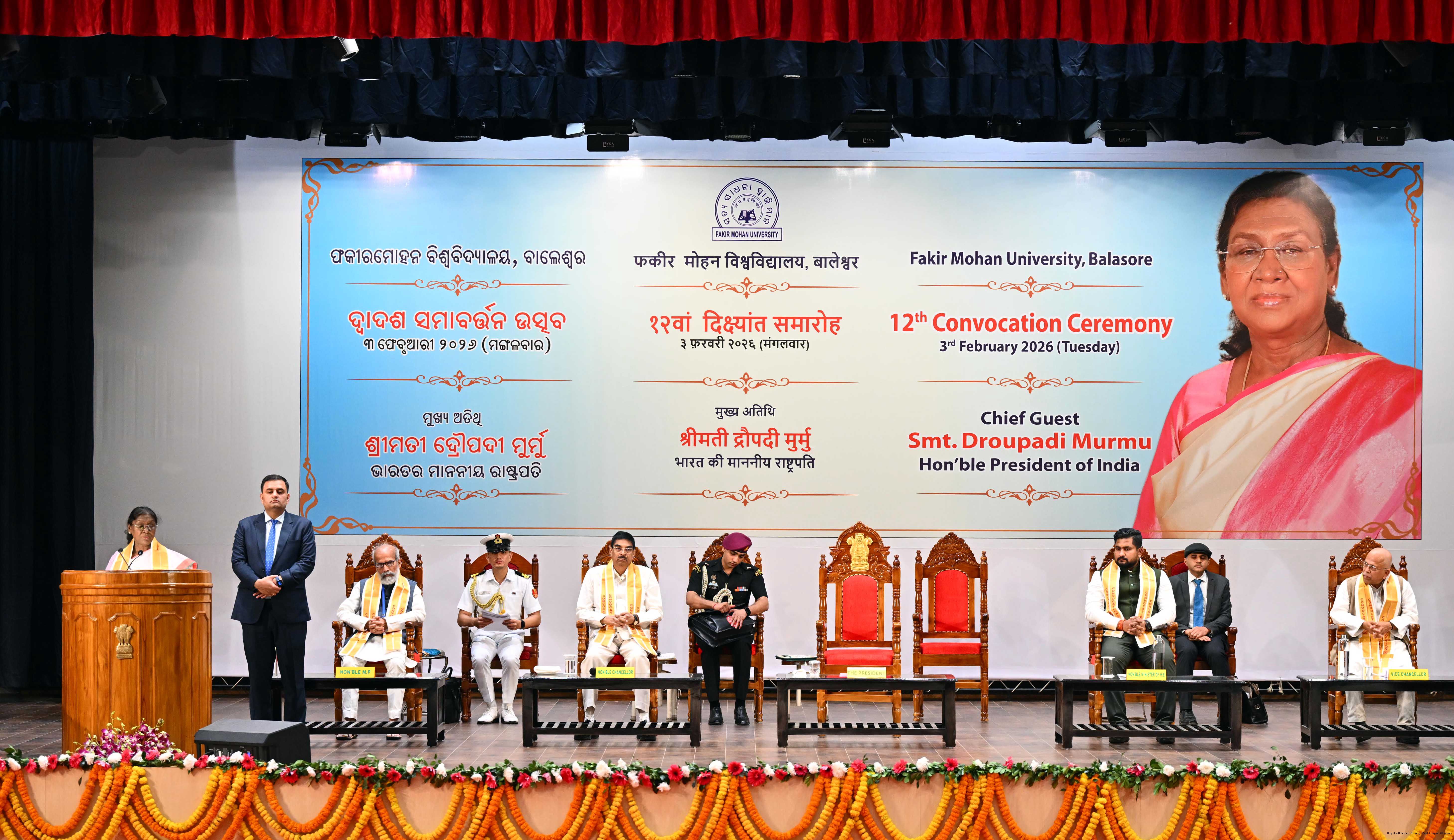 | Caption: | The President of India Smt Droupadi Murmu graced and addressed the convocation ceremony of Fakir Mohan University and inaugurated its new Auditorium at Balasore, Odisha on February 3, 2026. |