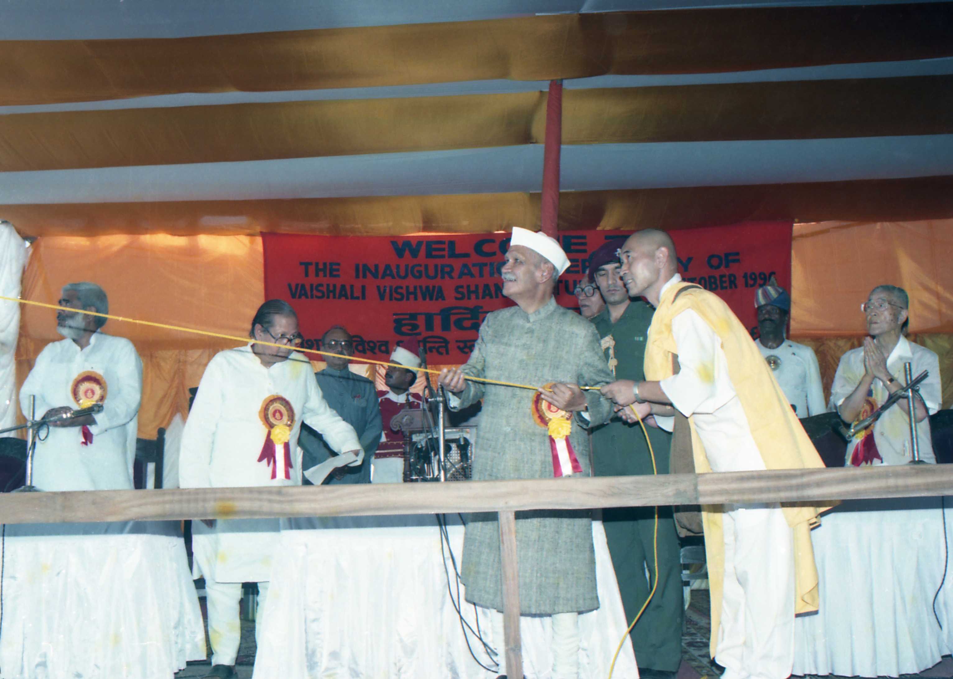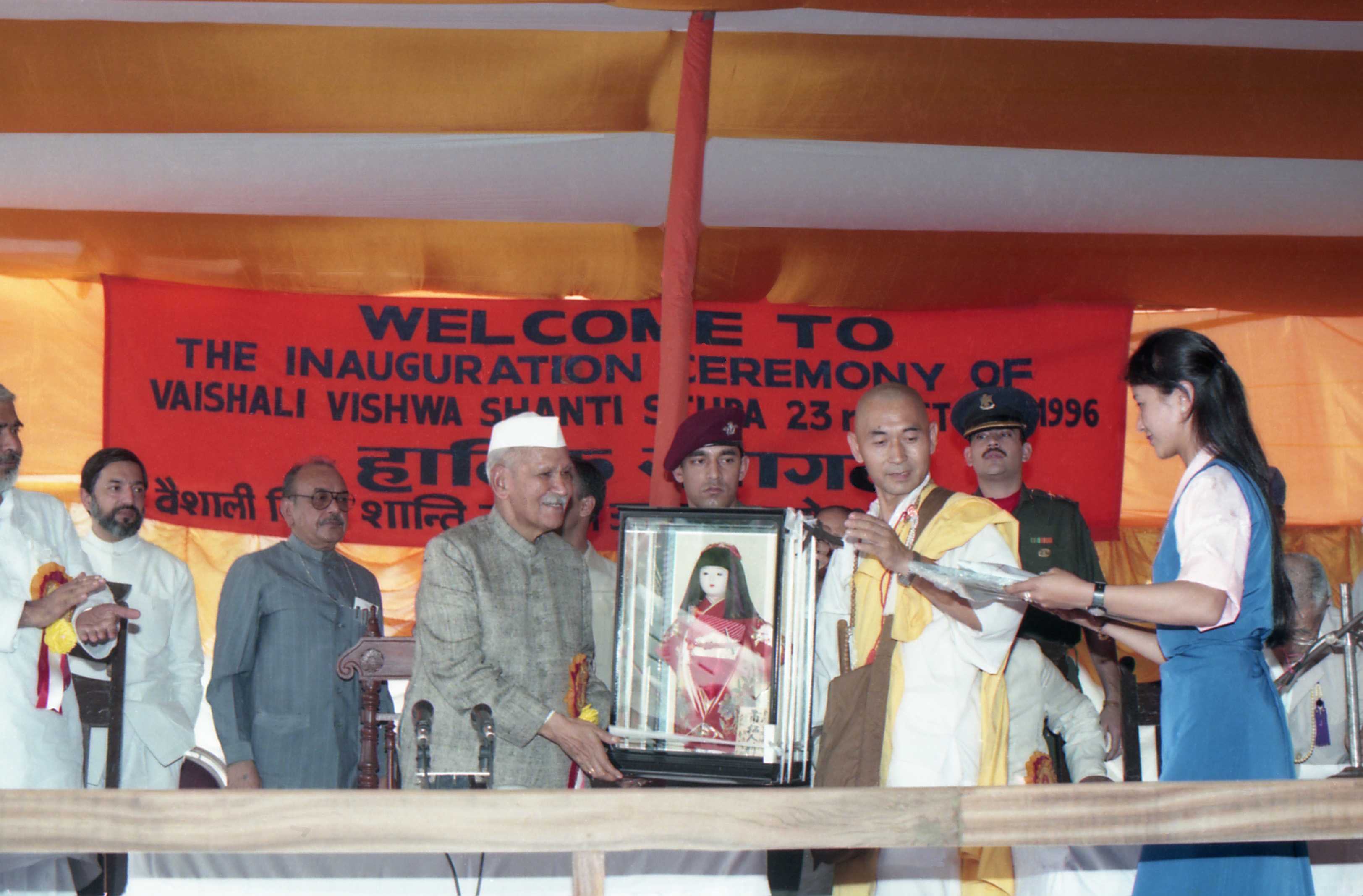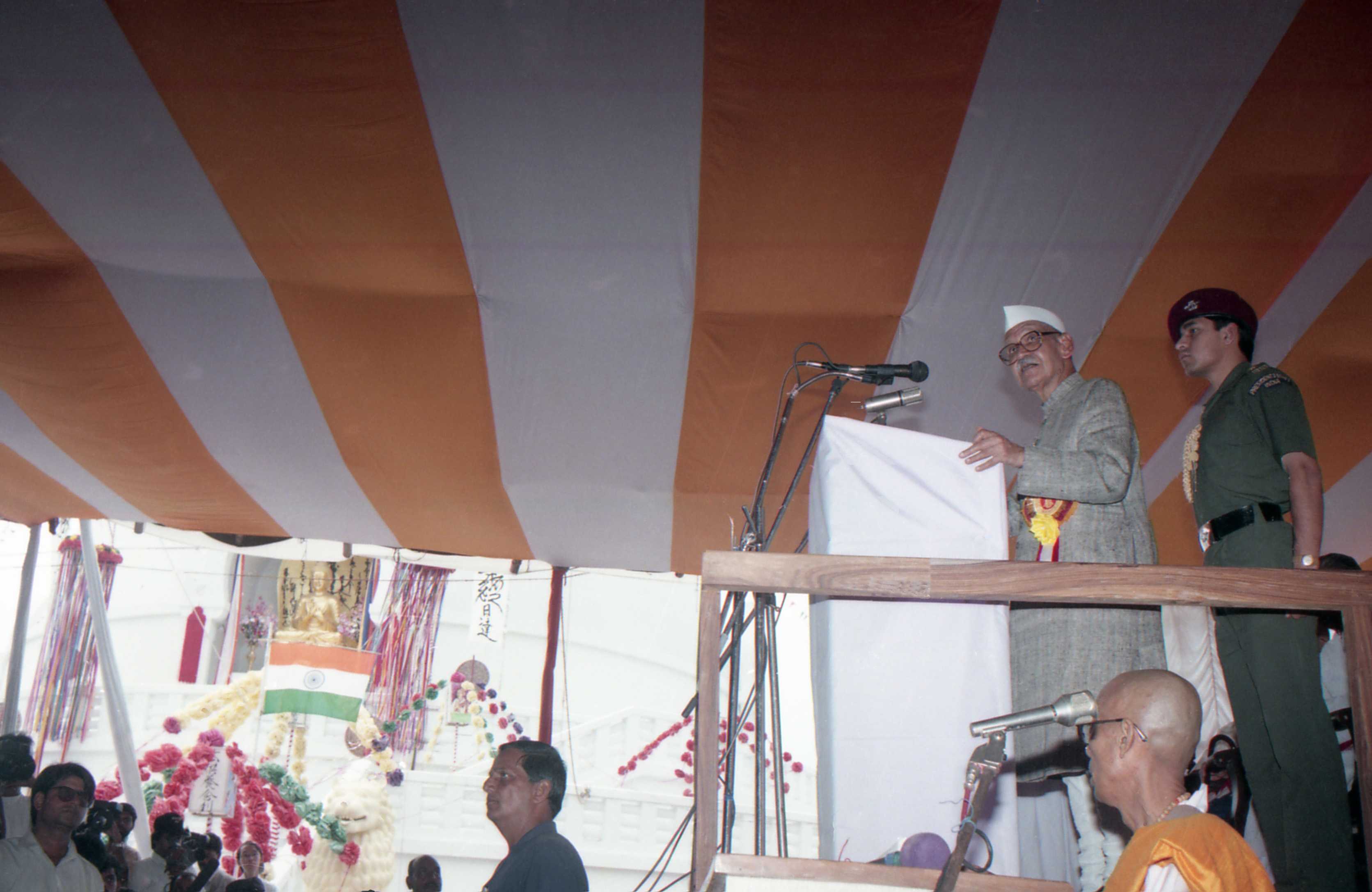 | Caption: | The President of India, Dr. Shankar Dayal Sharma unveils Buddha Statue at the inauguration of Vaishali Vishwa Shanti Stupa, at Vaishali, in Bihar on October 23, 1996. |