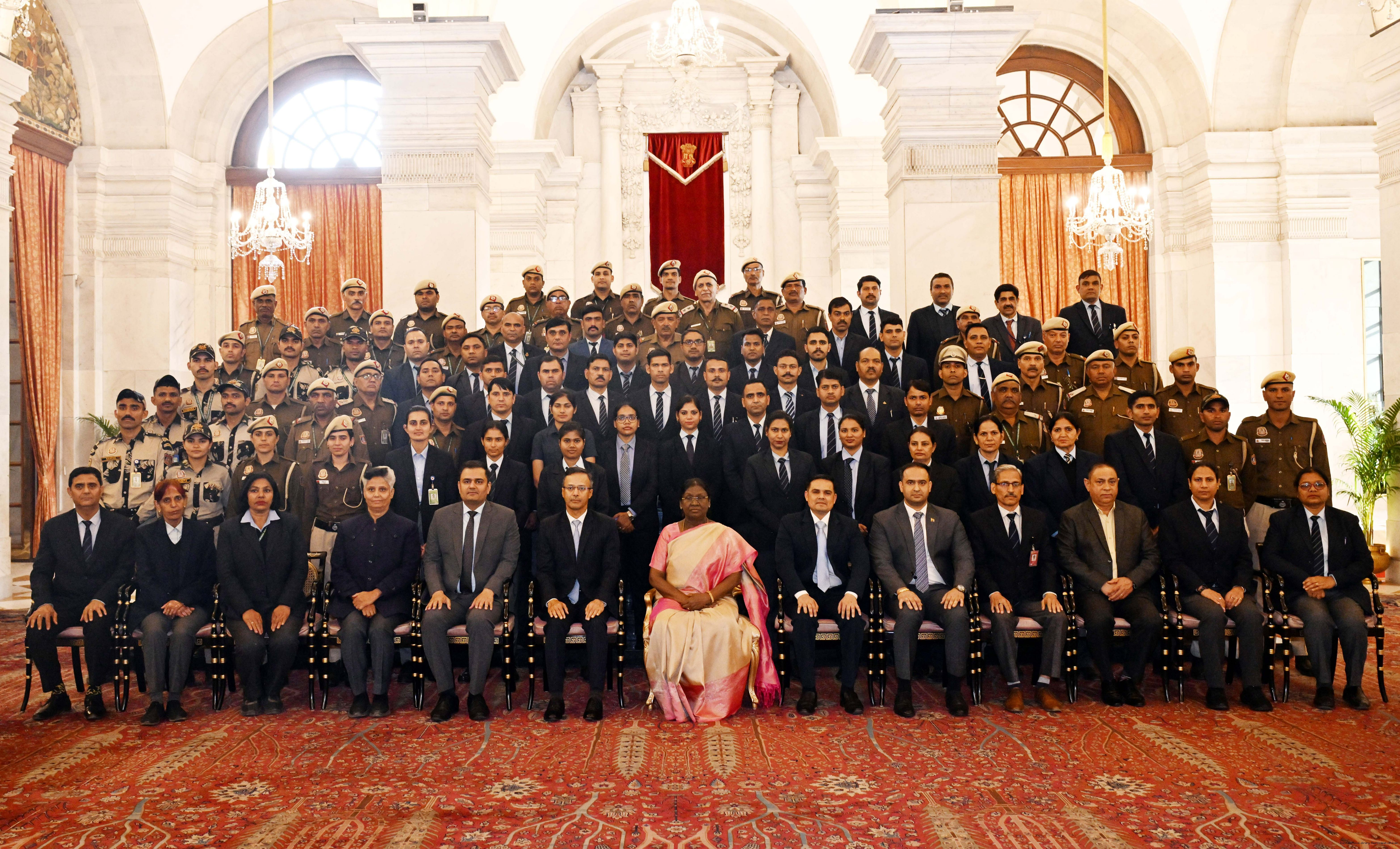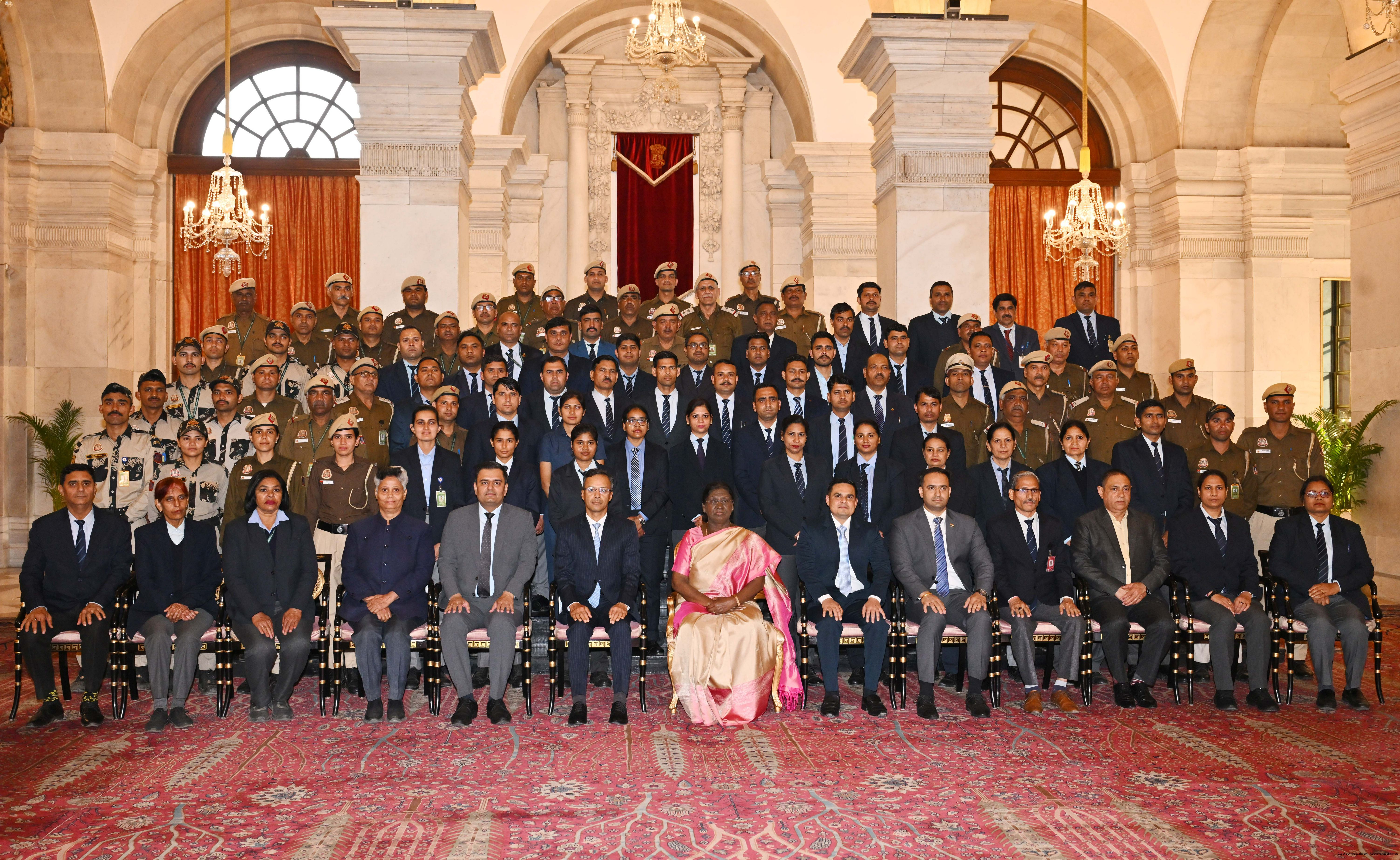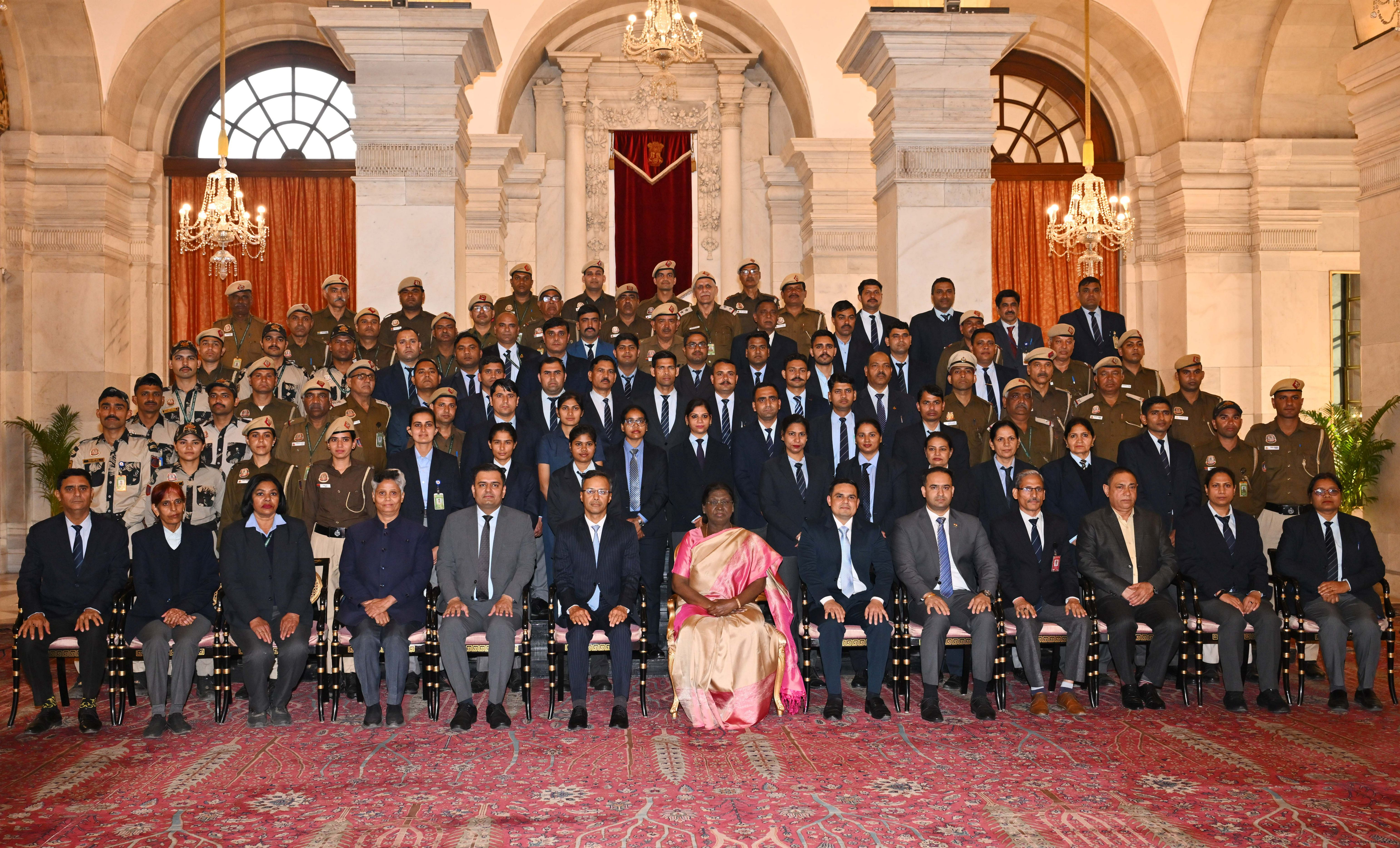 | Caption: | The President of India Smt. Droupadi Murmu posing a Group photograph with the Delhi Police personnel attached with the Rashtrapati Bhavan on the occasion of Raising Day of Delhi Police at Rashtrapati Bhavan on February 20, 2026. |