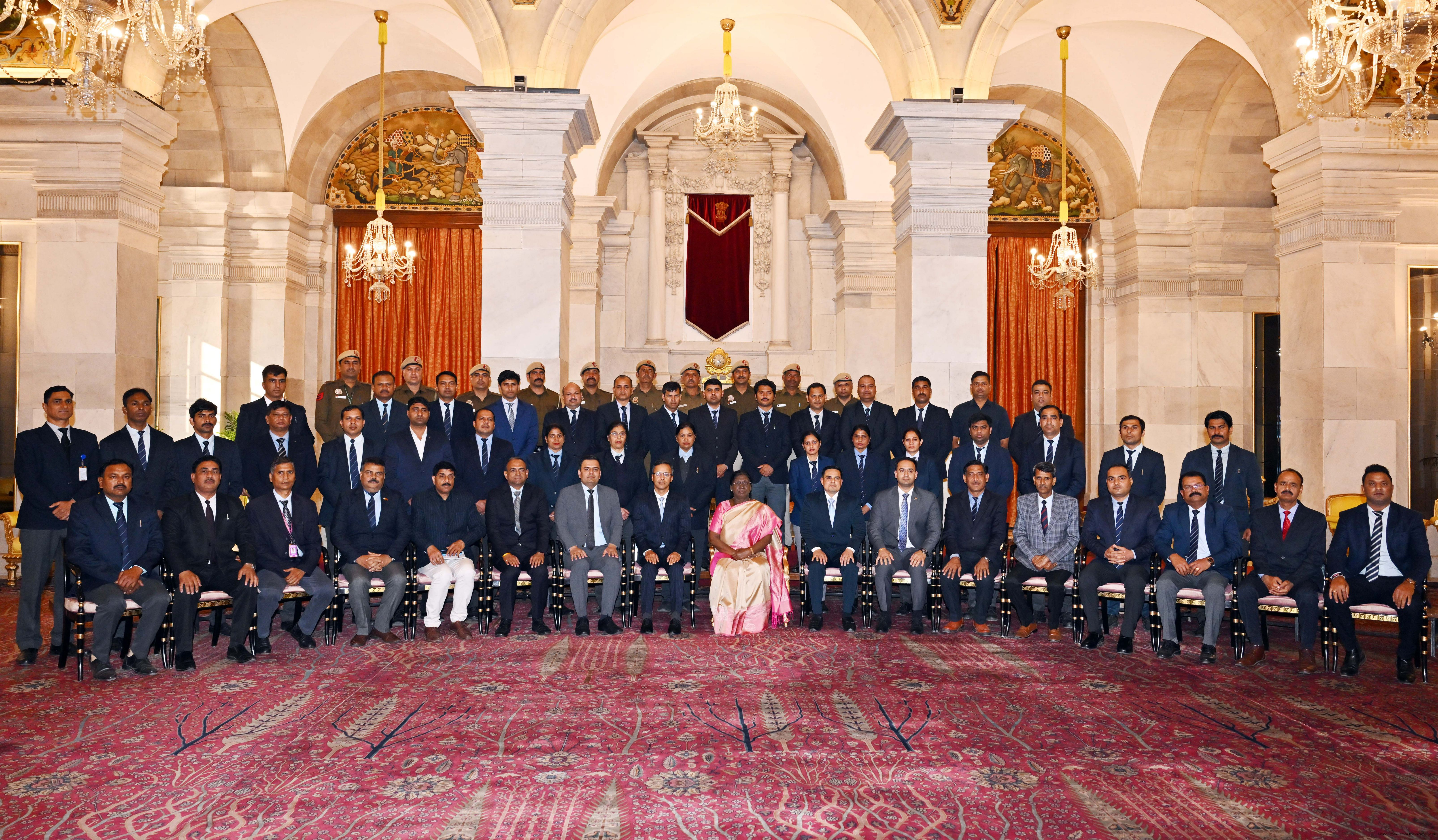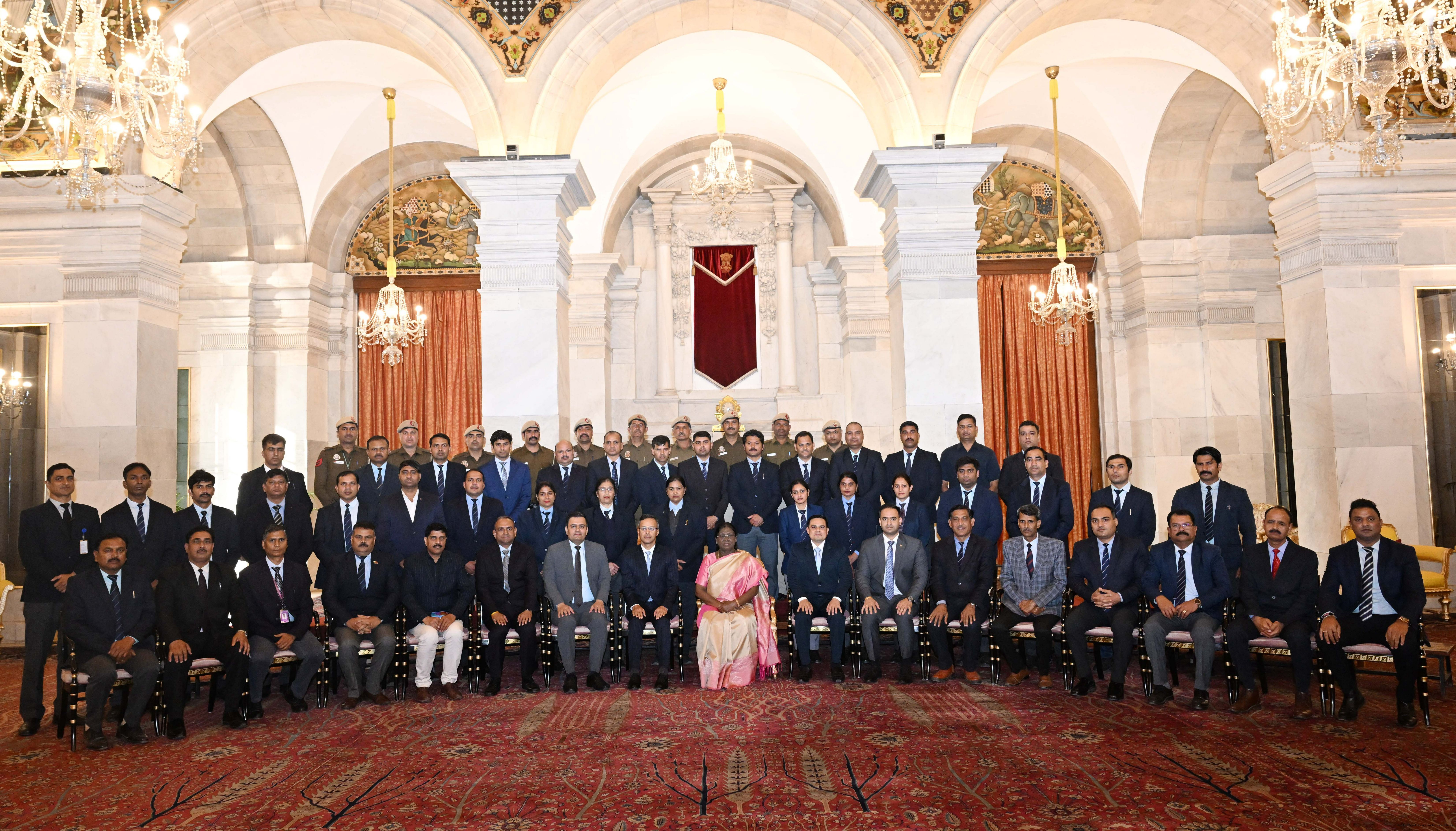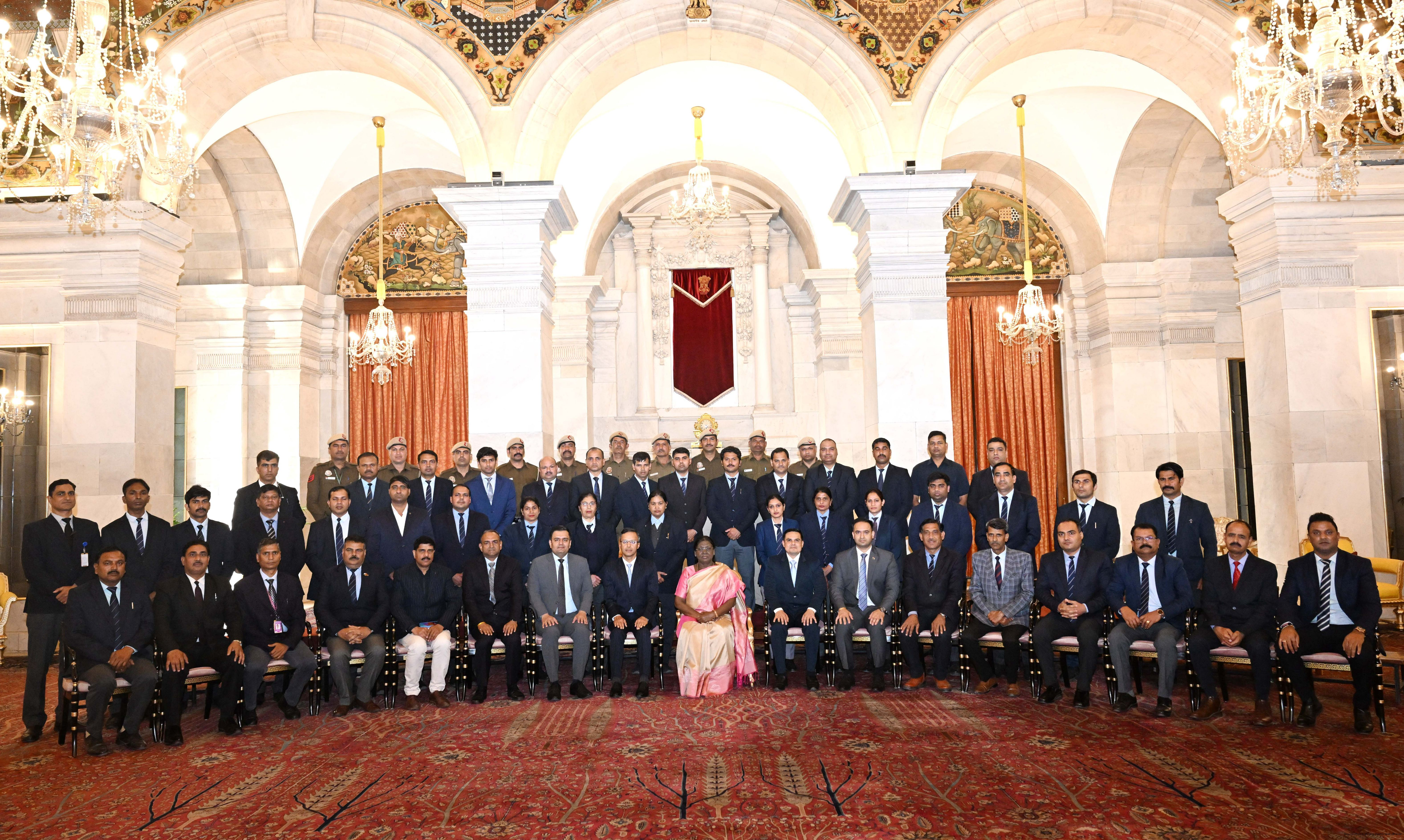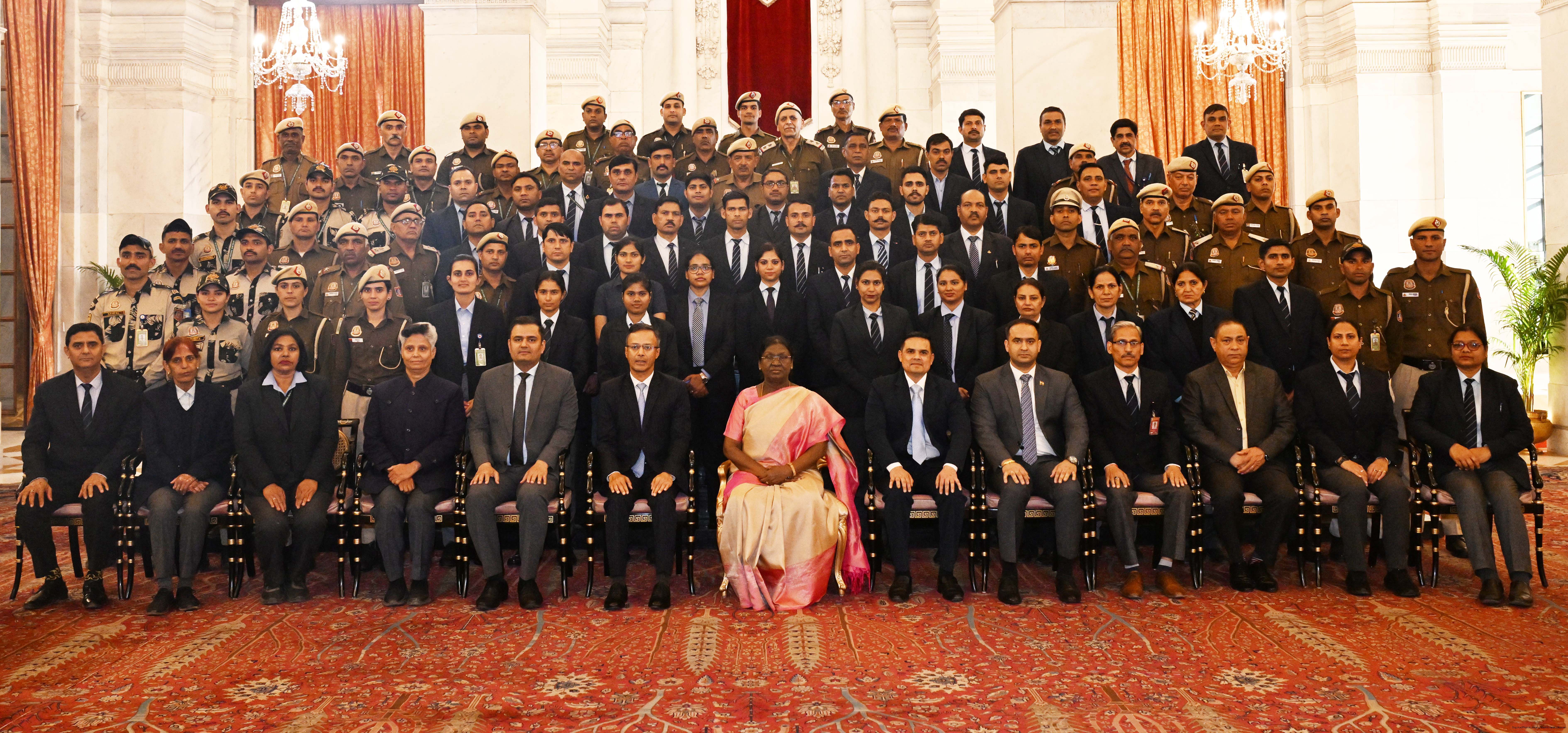 | Caption: | The President of India Smt. Droupadi Murmu posing a Group photograph with the Delhi Police personnel attached with the Rashtrapati Bhavan on the occasion of Raising Day of Delhi Police at Rashtrapati Bhavan on February 20, 2026. |