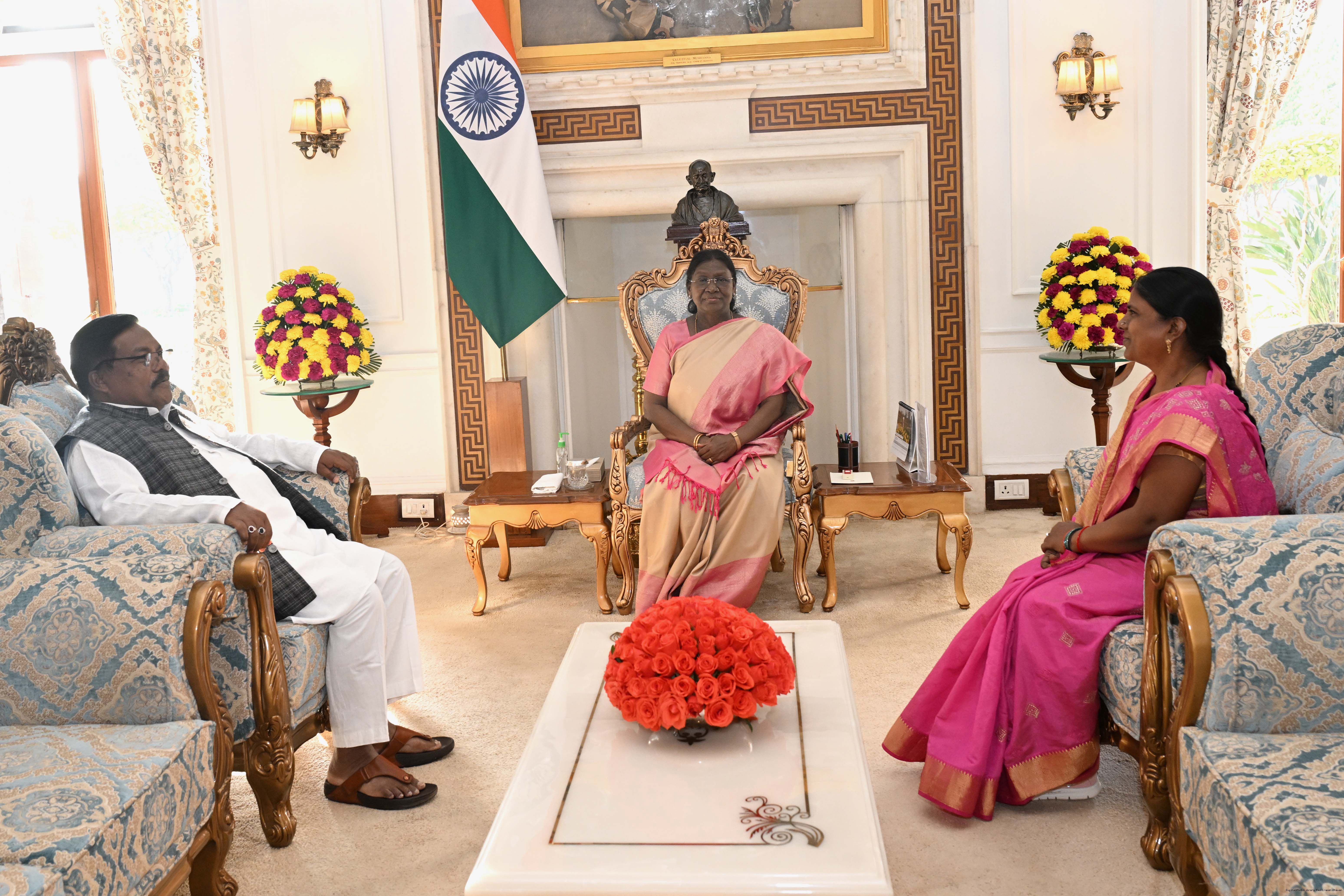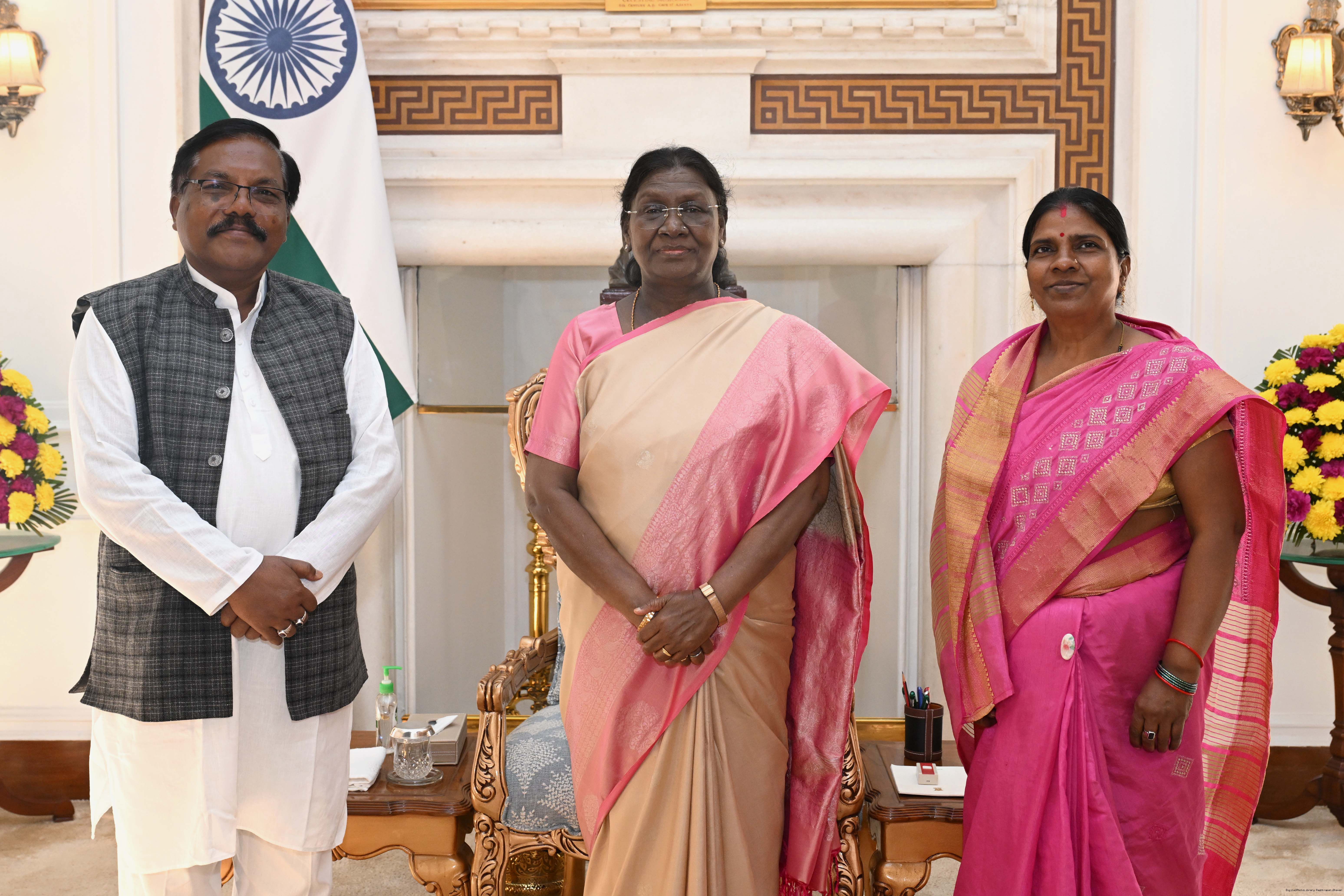| Caption: | Shri Parsuram Majhi, former MP along with spouse Smt. Kusum Majhi meeting with the President of India, Smt Droupadi Murmu at Rashtrapati Bhavan on February 20, 2026. |