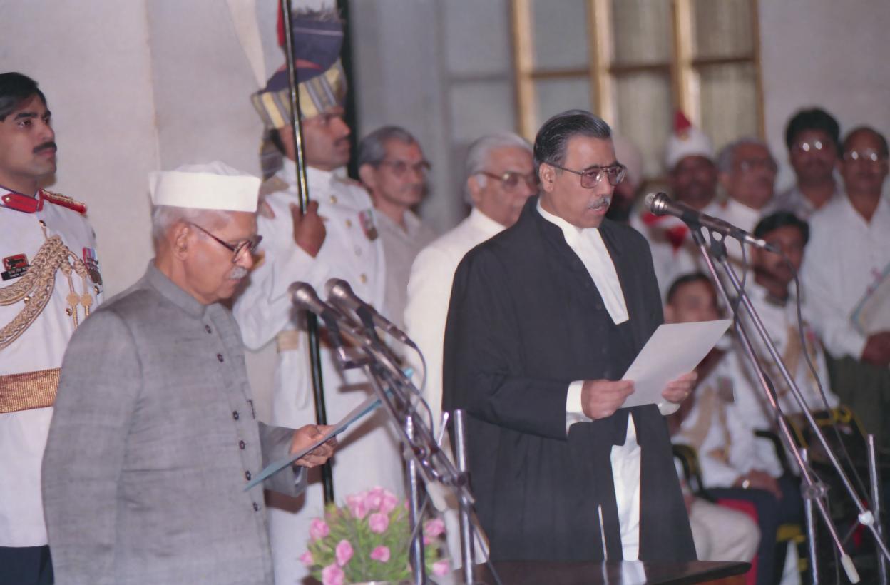 | Caption: | The President of India, Dr. Shankar Dayal Sharma administering Oath to Shri Aziz Mushabber Ahmadi as Chief Justice of India, at a Swearing-in Ceremony, at Rashtrapati Bhavan in New Delhi on October 25, 1994. |