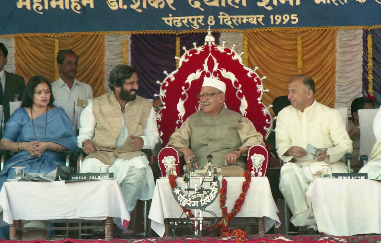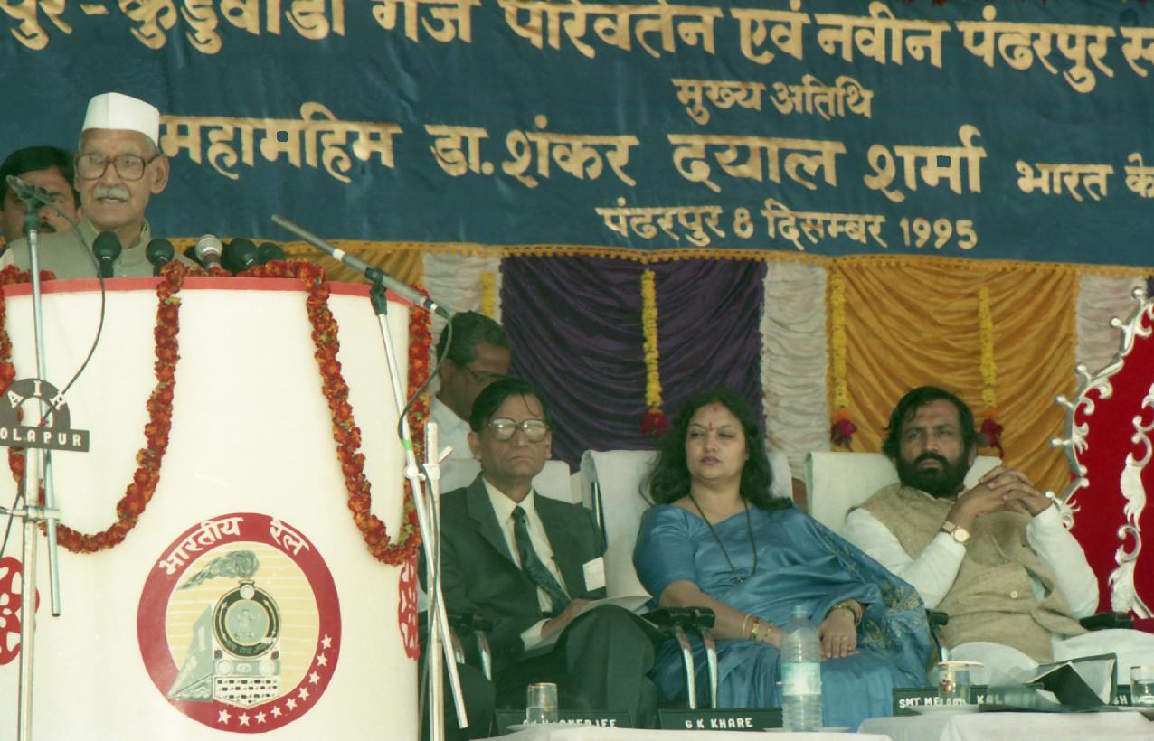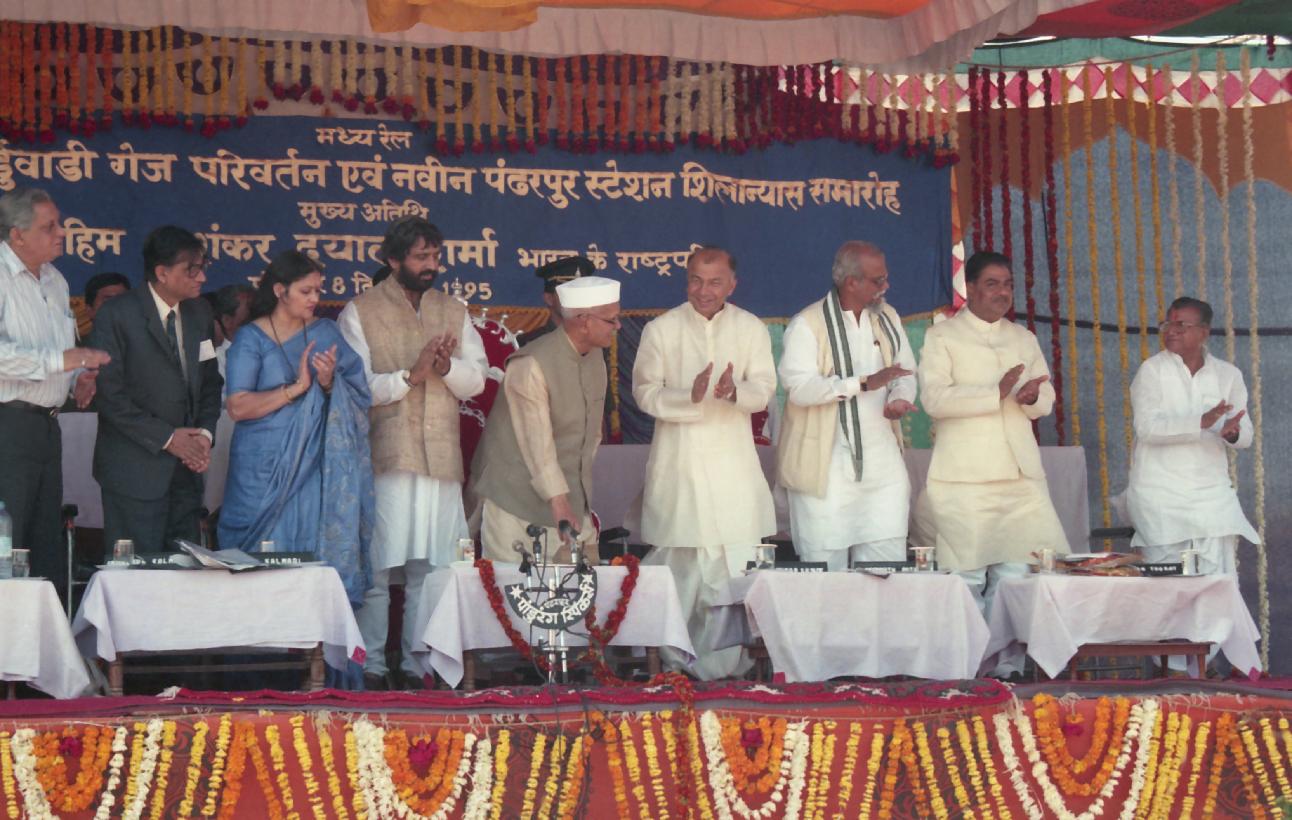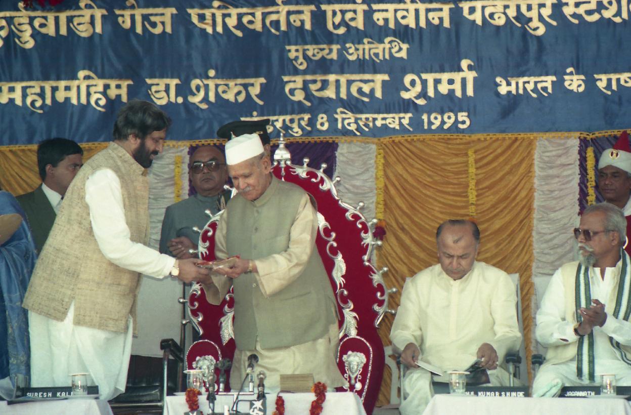 | Caption: | The President of India, Dr. Shankar Dayal Sharma laying the foundation stone for the Conversion Project from Miraj to Kurduvadi and new Station Building, at Pandharpur, in Maharashtra on December 08, 1995. |
