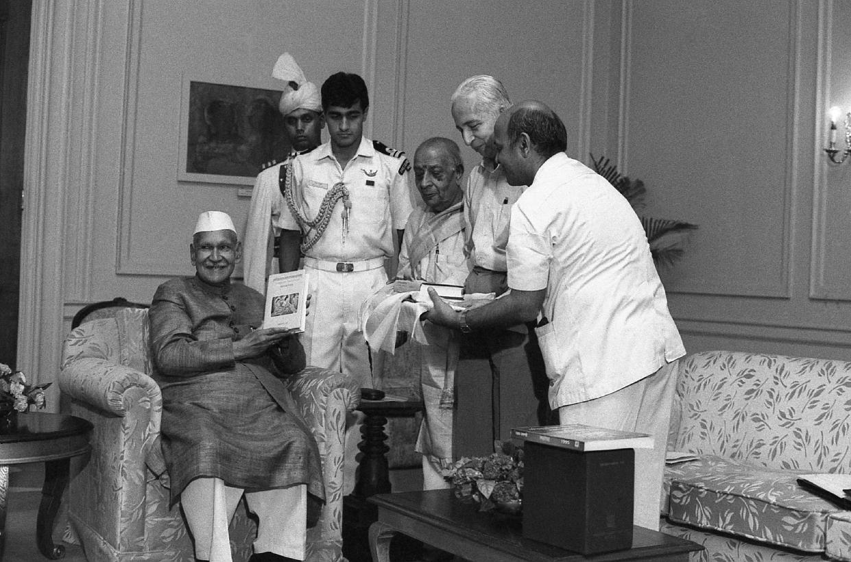 | Caption: | The President of India, Dr. Shankar Dayal Sharma receiving a copy of the book "Tamil Kambaramayan Ka Balkand" (Translated in Hindi) from Shri Aadya Charan Jha at Rashtrapati Bhavan in New Delhi on August 01, 1996. |