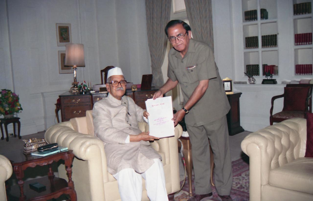 | Caption: | The President of India, Dr. Shankar Dayal Sharma receiving a copy of the book from Prof. Laxmi Narayan Dubey of Sagar University at Rashtrapati Bhavan in New Delhi on October 26, 1994. |
