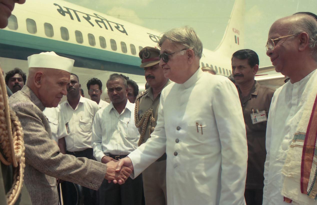 | Caption: | The President of India, Dr. Shankar Dayal Sharma arrives at Bangalore airport to attend the funeral of former President, Shri N Sanjiva Reddy, at Bangalore, Karnataka on June 02, 1996. |