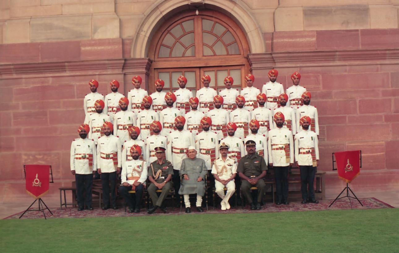| Caption: | The President of India, Dr. Shankar Dayal Sharma in Group Photograph with the Sikh Light Infantry Centre Brass Band at Rashtrapati Bhavan in New Delhi on June 13, 1996. |