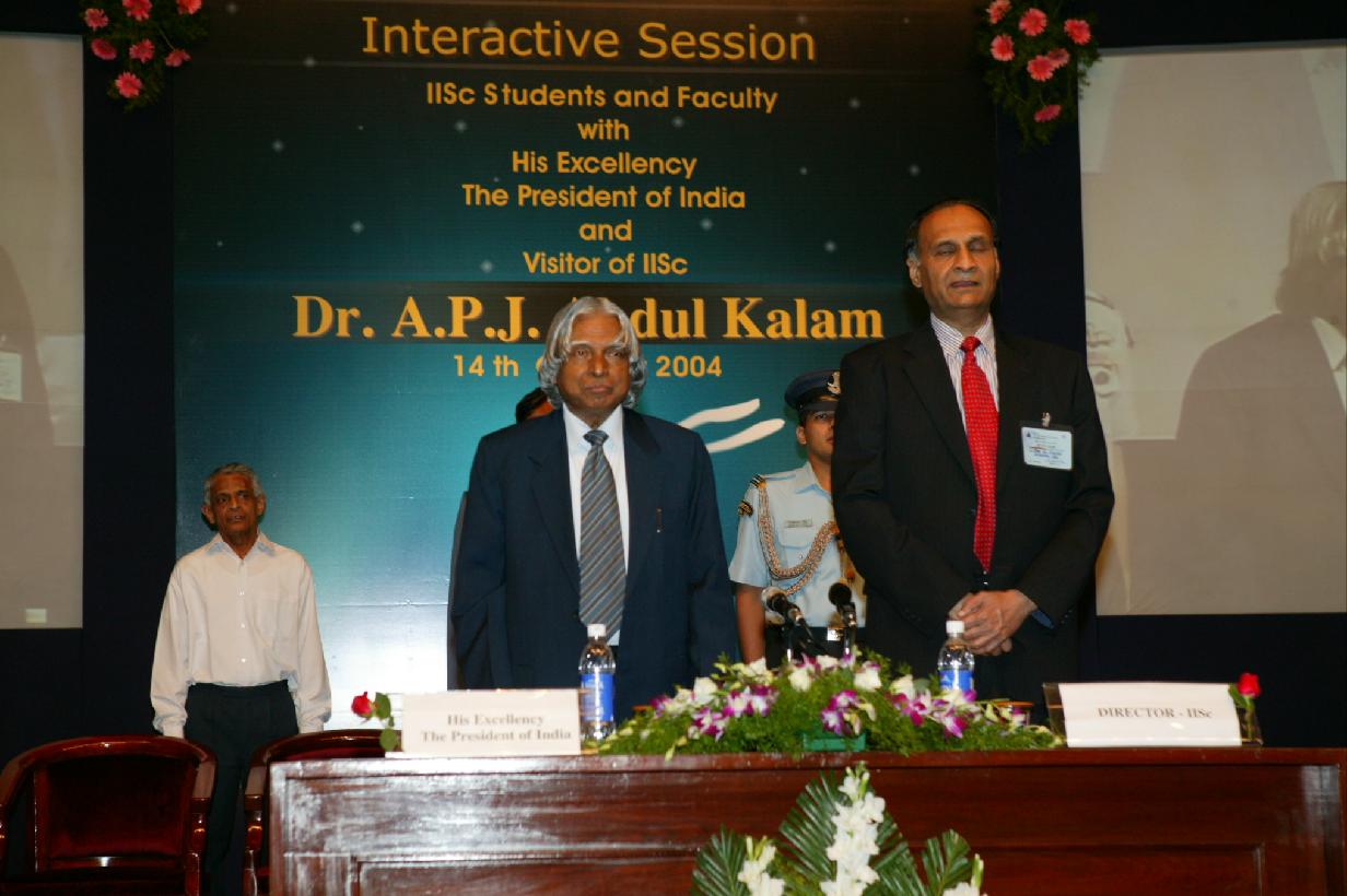 | Caption: | The President of India, Dr A P J Abdul Kalam addressing and interacting with the Student and Faculty at India Institute of Sciences at Bangalore in Karnataka on Oct 14, 2004 |