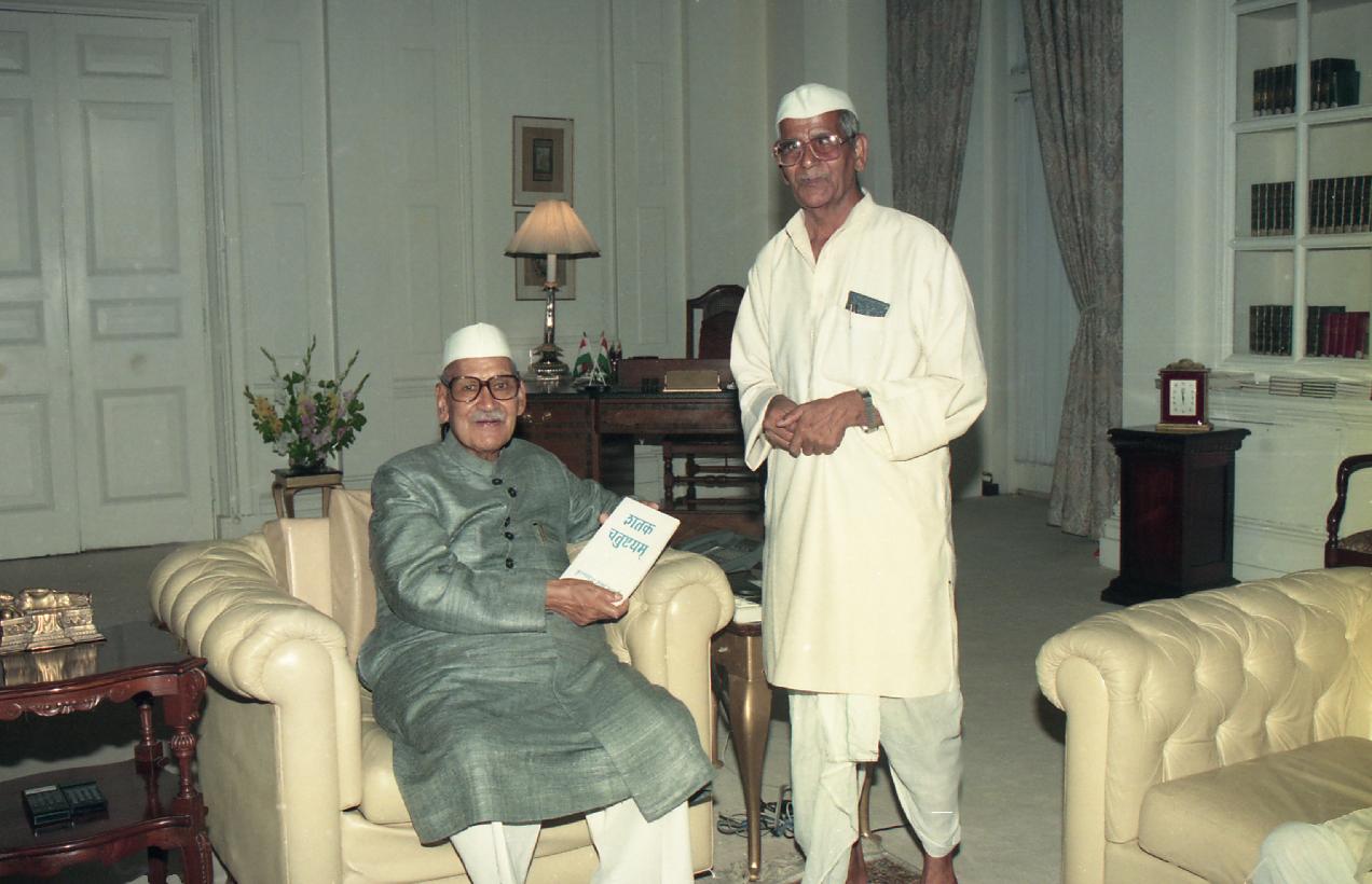 | Caption: | The President of India, Dr. Shankar Dayal Sharma receiving a copy of the book "Shatak Chatushtayam" from Shri Krishna Dutt Sharma Shastri with others at Rashtrapati Bhavan in New Delhi on July 25, 1996. |