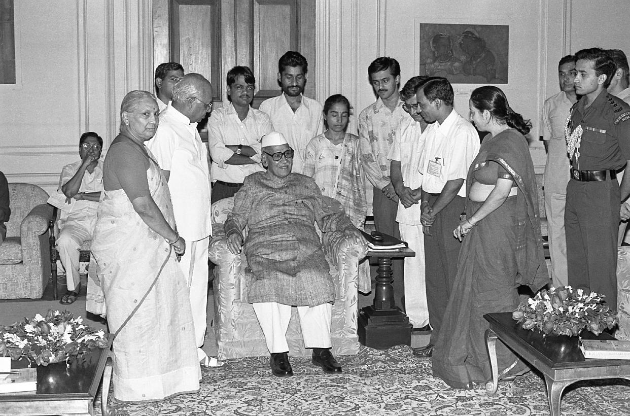 | Caption: | The President of India, Dr. Shankar Dayal Sharma receiving a copy of the books "Discovering Human Potential Energy Kundalini" from Dr. Lajpat Rai at Rashtrapati Bhavan in New Delhi on July 19, 1996. |