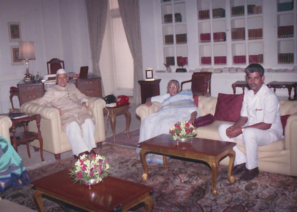 | Caption: | The President of India, Dr. Shankar Dayal Sharma meeting with Smt. Maragatham Chandrasekhar, MP (LS) with Dr. Dharmalingam at Rashtrapati Bhavan in New Delhi on October 22, 1994. |