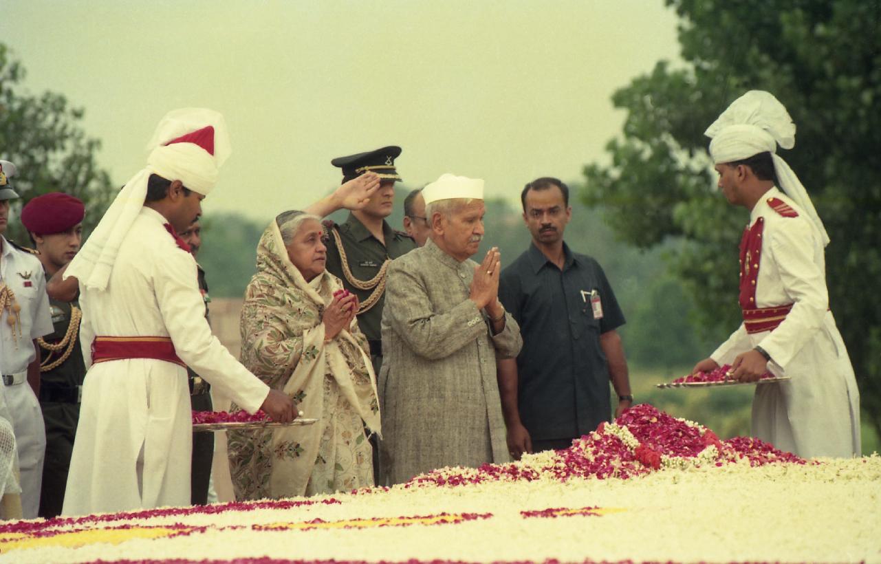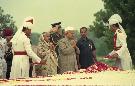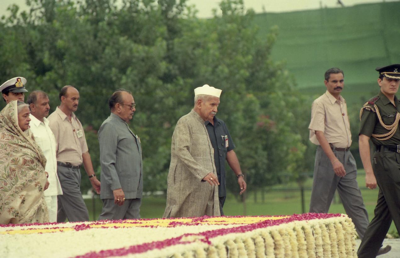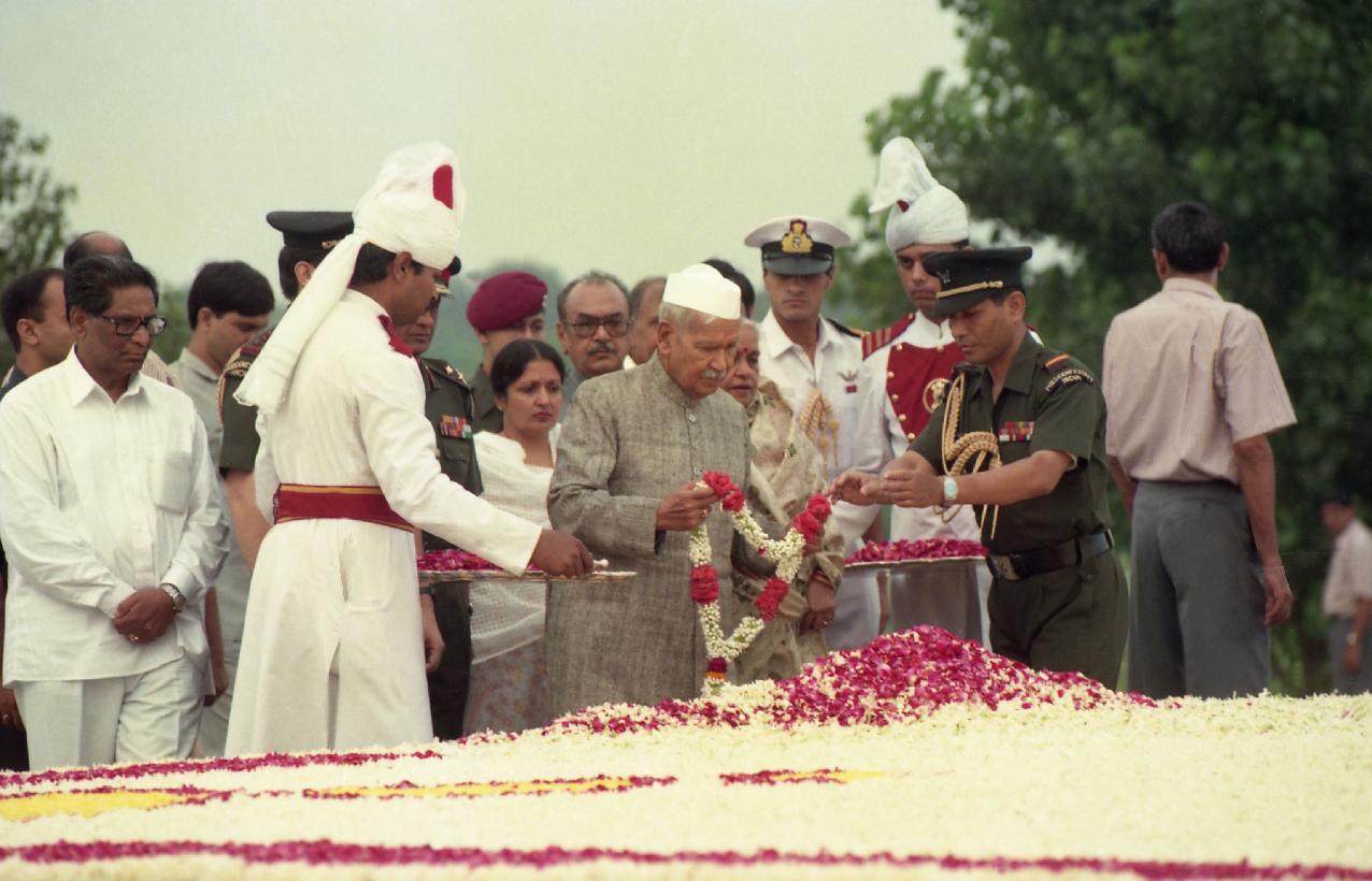 | Caption: | The President of India, Dr. Shankar Dayal Sharma paying floral tributes to late Shri Rajiv Gandhi at Vir Bhumi in New Delhi on August 20, 1996. |