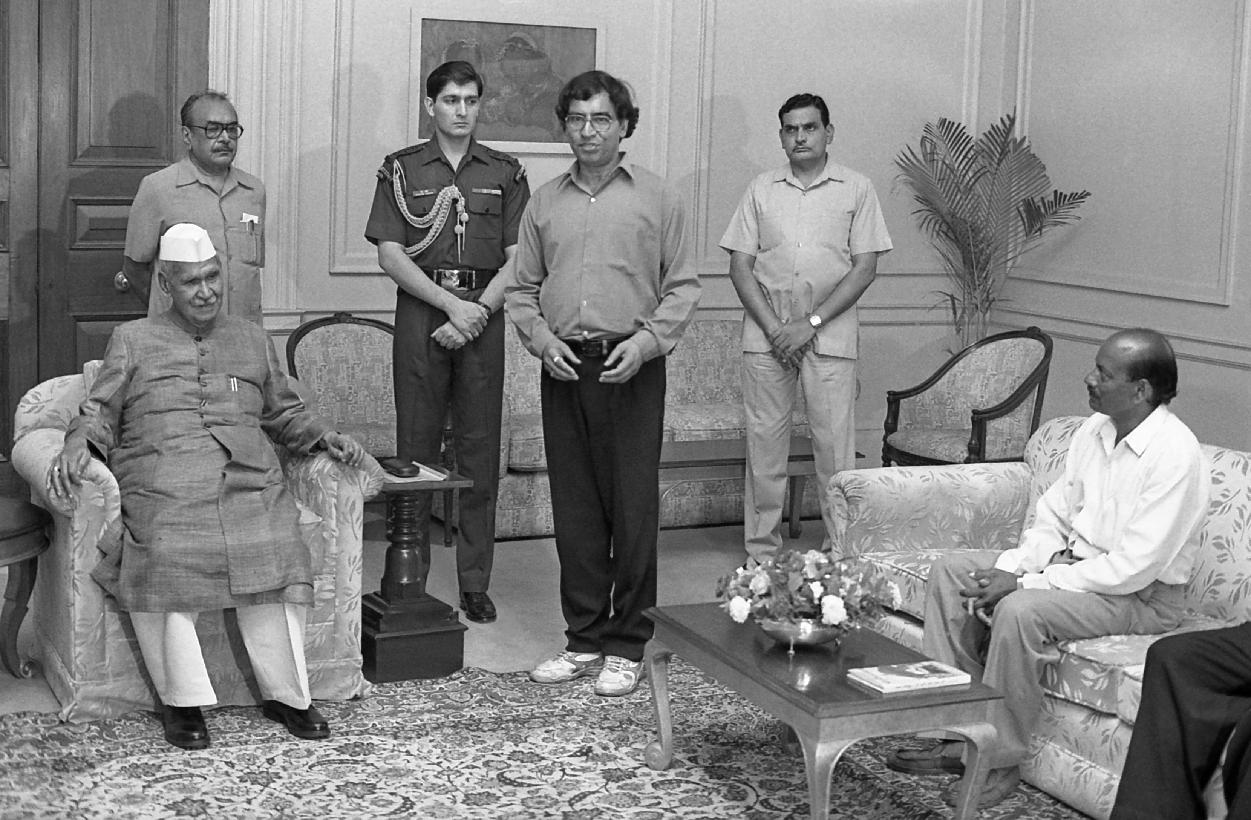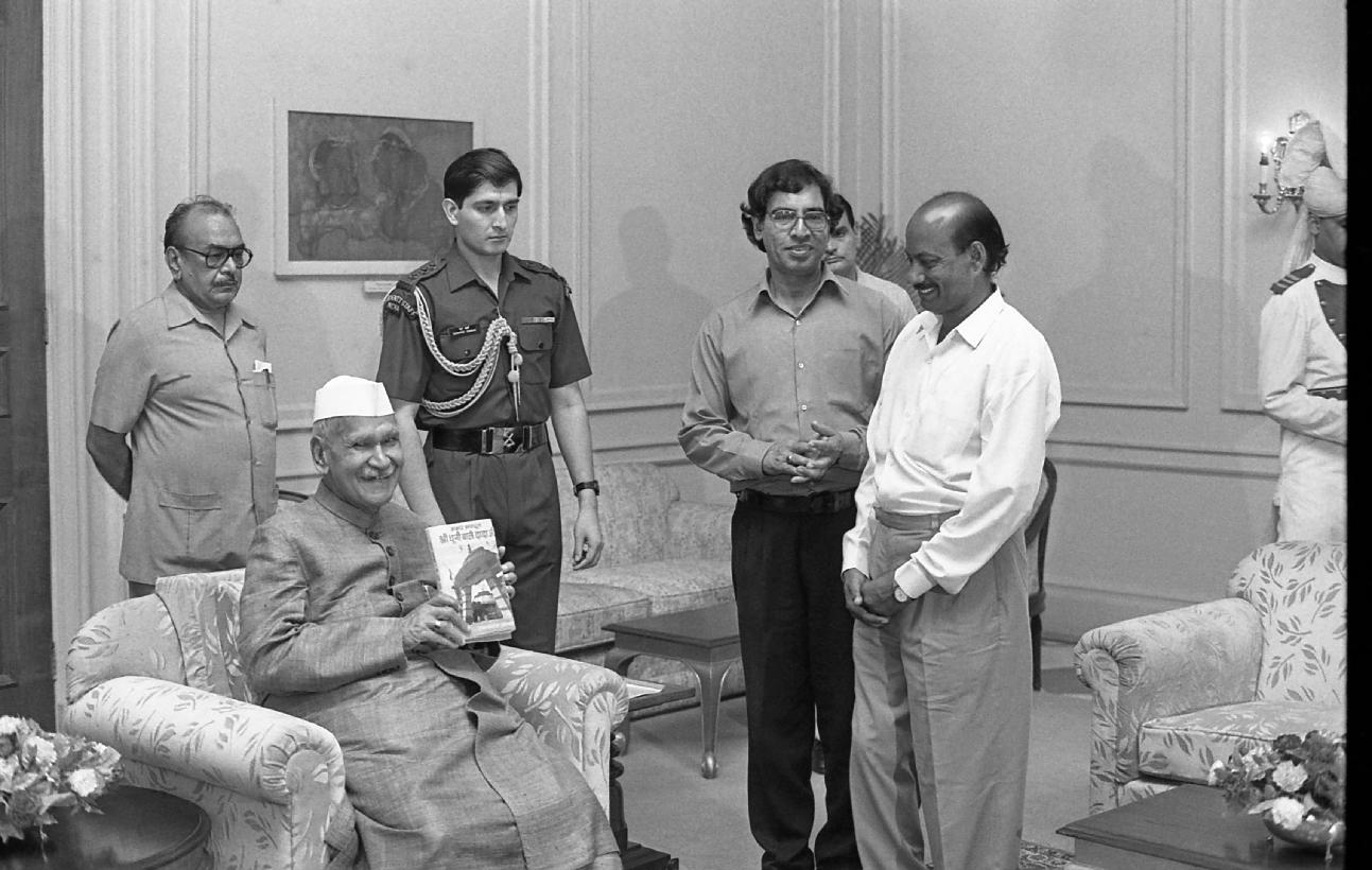 | Caption: | The President of India, Dr. Shankar Dayal Sharma receiving a copy of the book "Amar Awadhoot: Dhuniwale Baba" from Shri Ramvaran Ojha at Rashtrapati Bhavan in New Delhi on August 17, 1996. |