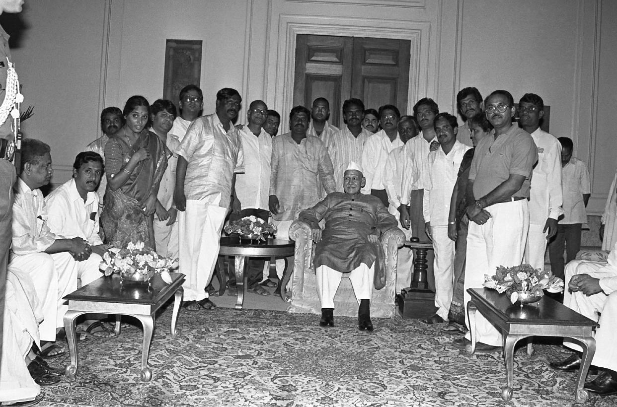 | Caption: | The President of India, Dr. Shankar Dayal Sharma meeting with Members of Committee on Estimates of Andhra Pradesh Legislative Assembly at Rashtrapati Bhavan in New Delhi on August 10, 1996. |