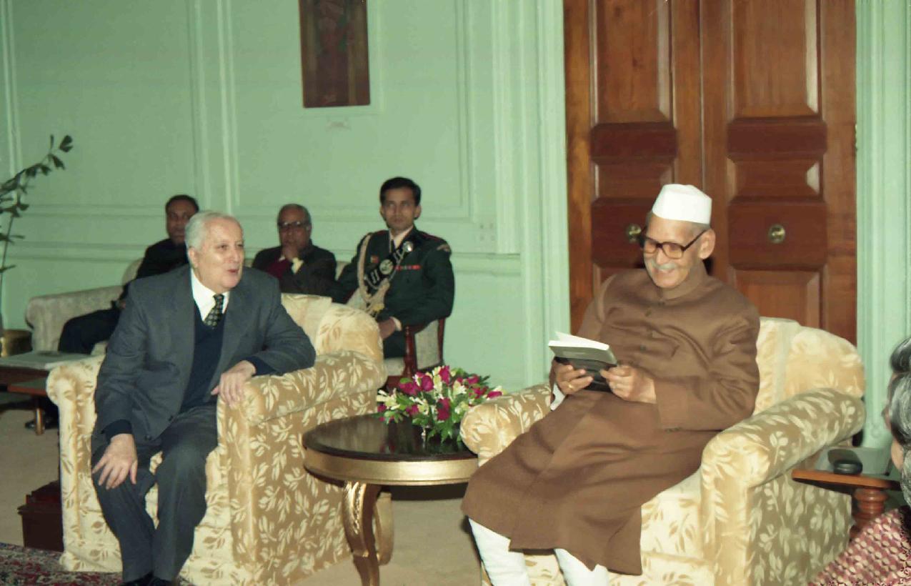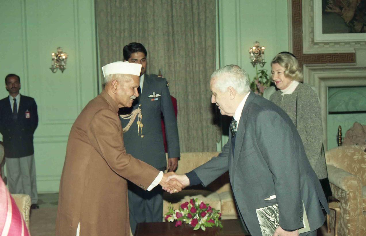 | Caption: | The President of India, Dr. Shankar Dayal Sharma meeting with Prof. Ilya Prigogine, Nobel Laureate from Belgium and his wife, at Rashtrapati Bhavan in New Delhi on December 22, 1995. |