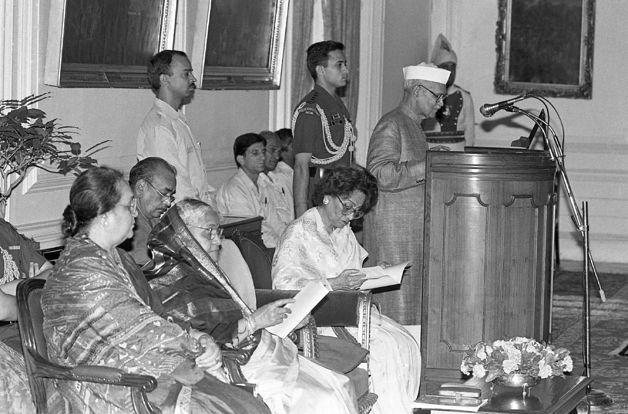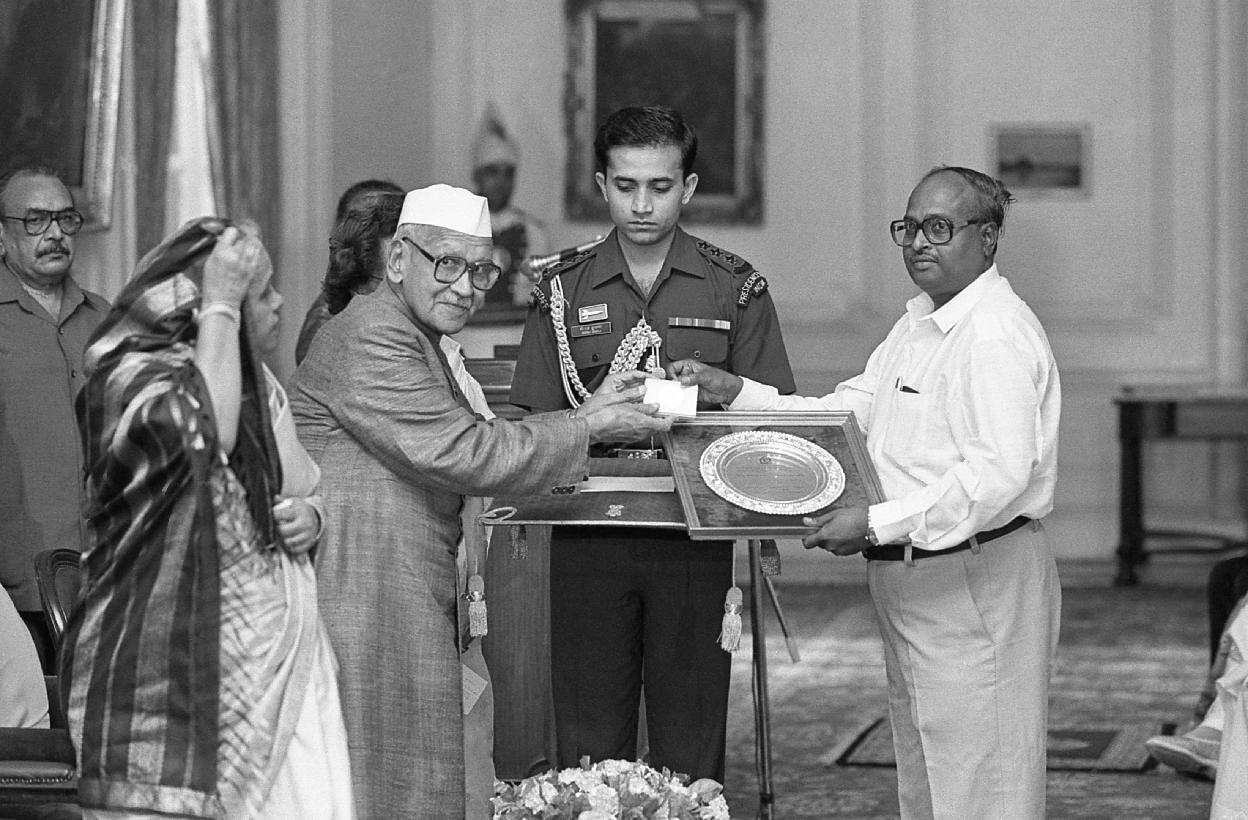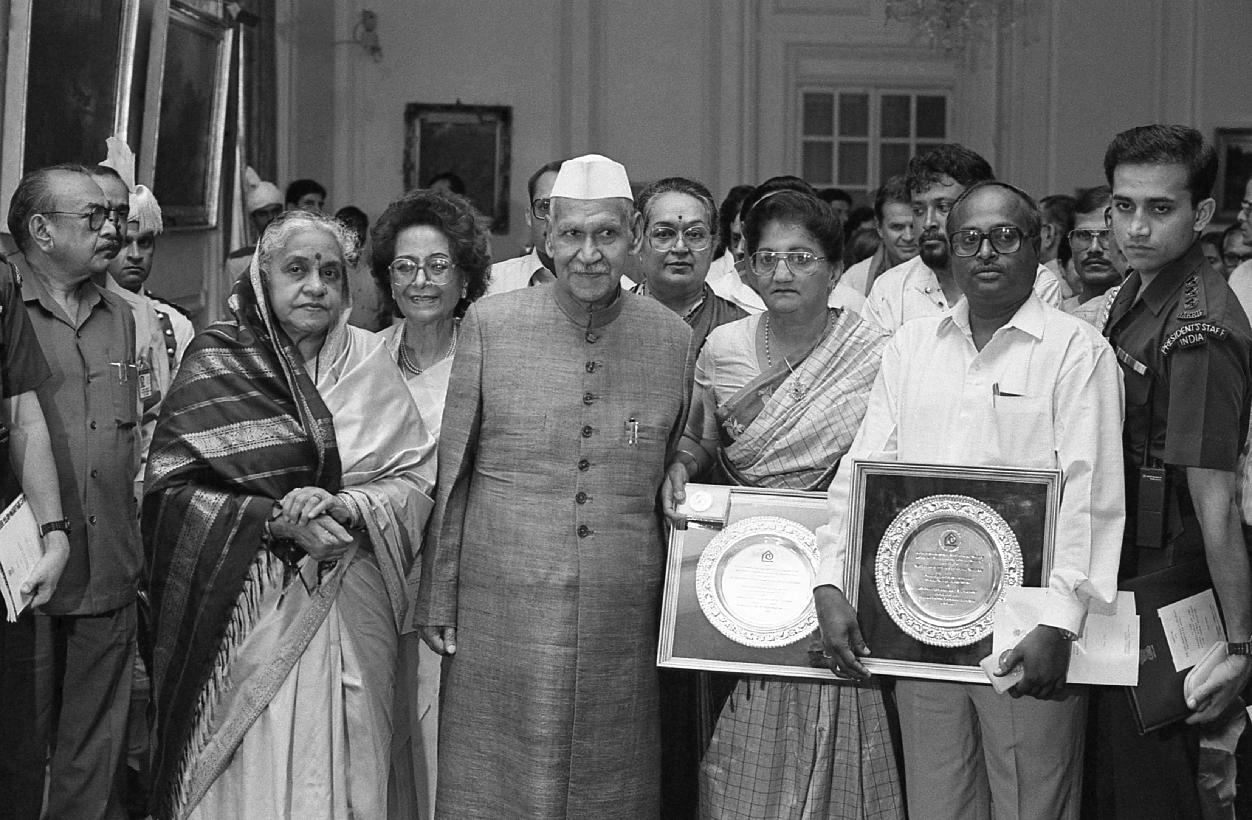 | Caption: | The President of India, Dr. Shankar Dayal Sharma presenting of the Radha Raman Memorial Award to Karnataka State Council and West Bengal State Council for Child Welfare at Rashtrapati Bhavan in New Delhi on August 05, 1996. |