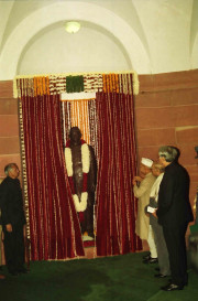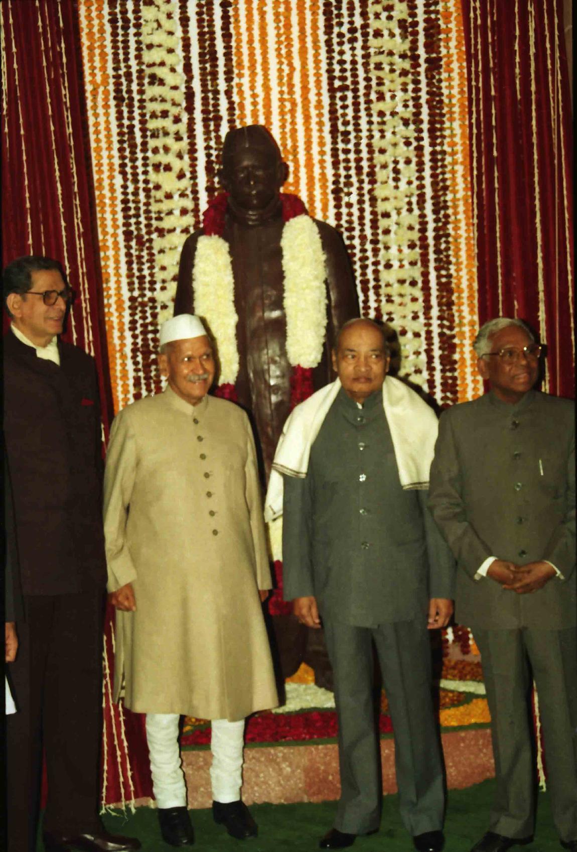 | Caption: | The President of India, Dr. Shankar Dayal Sharma unveiling the statue of Pt. Ravi Shankar Shukla at Parliament House in New Delhi on December 22, 1995. |