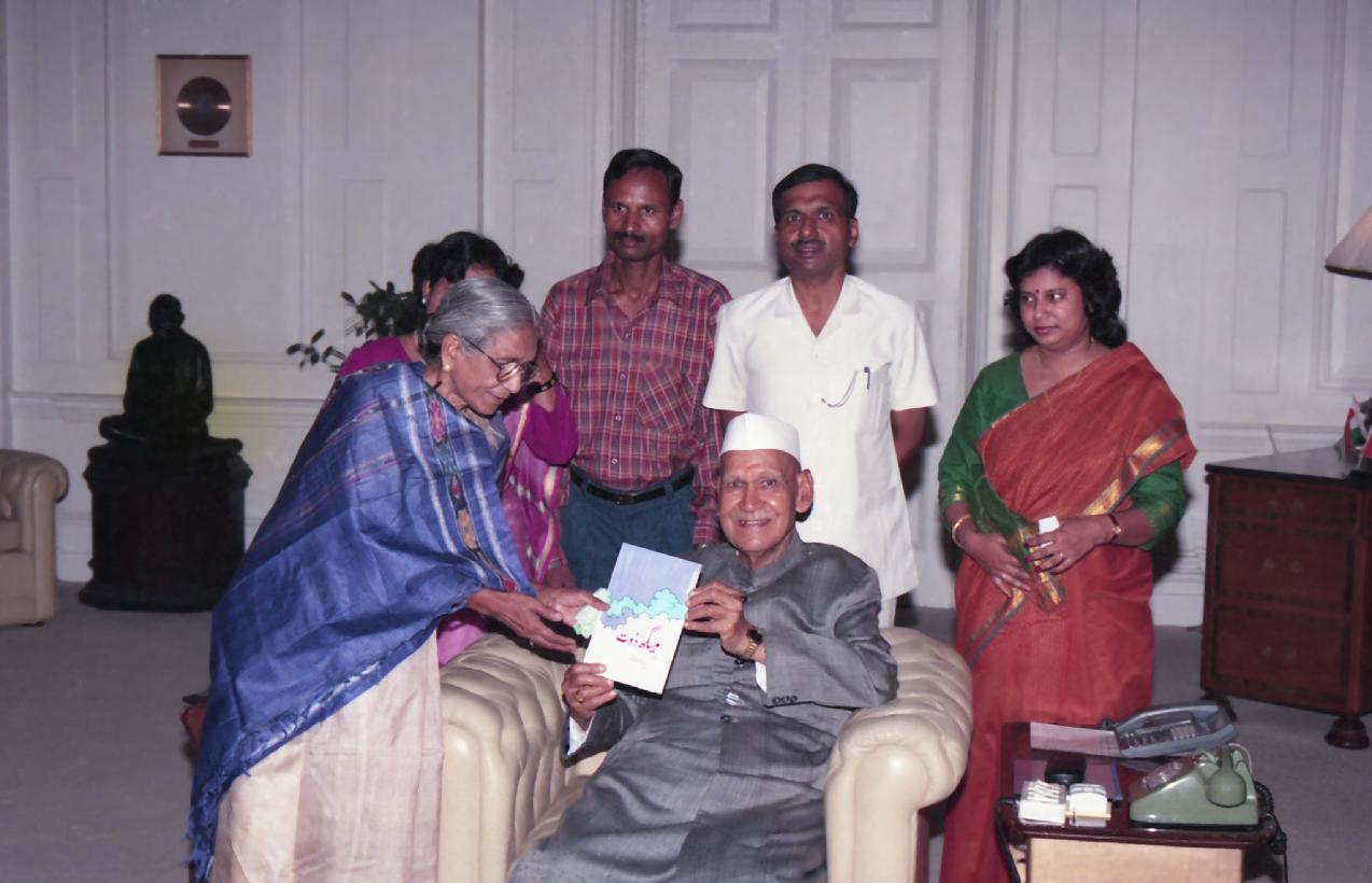 | Caption: | The President of India, Dr. Shankar Dayal Sharma receiving a copy of the book from Smt. Vandini Devi Saxena with others at Rashtrapati Bhavan in New Delhi on June 04, 1996. |