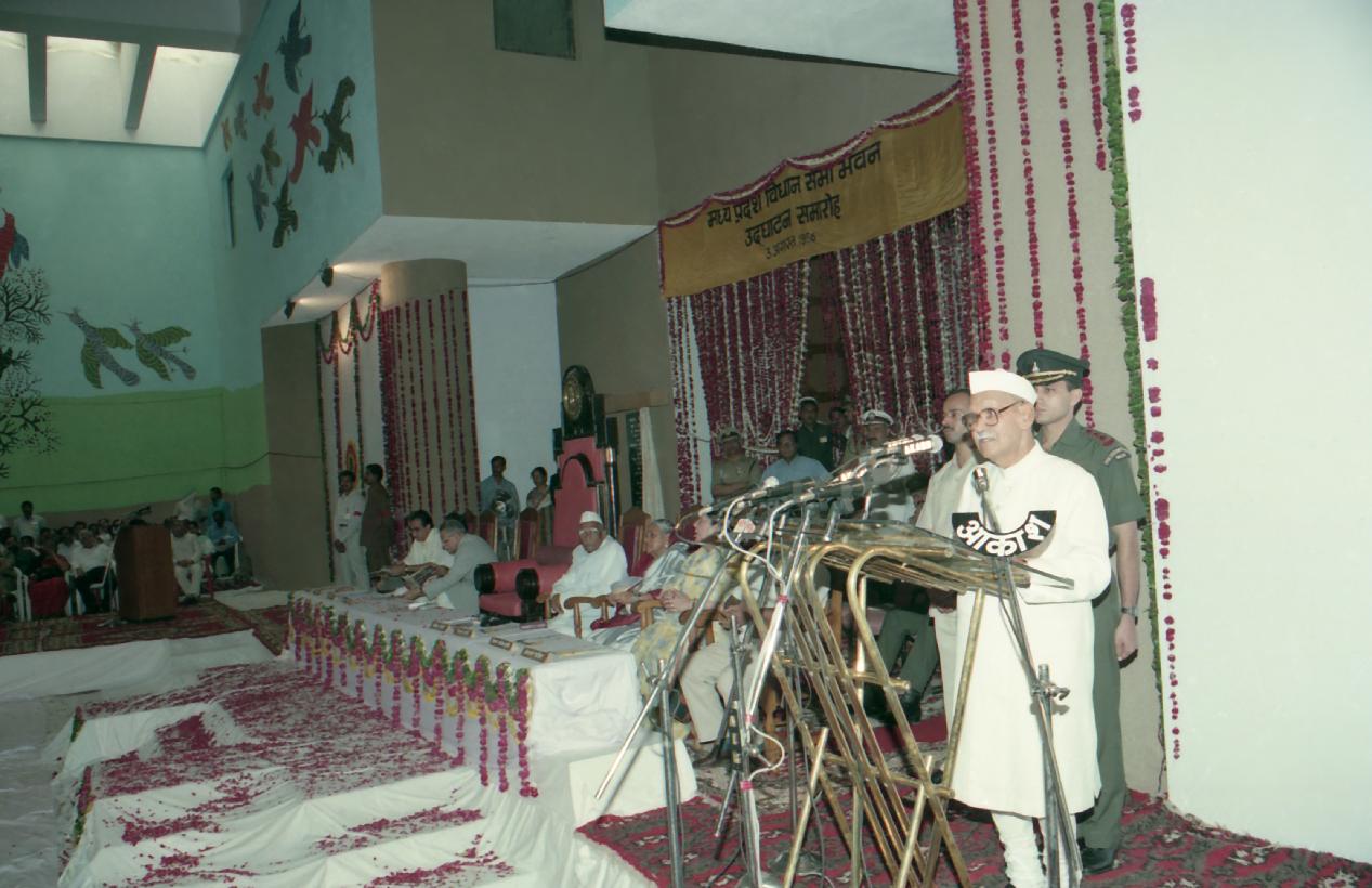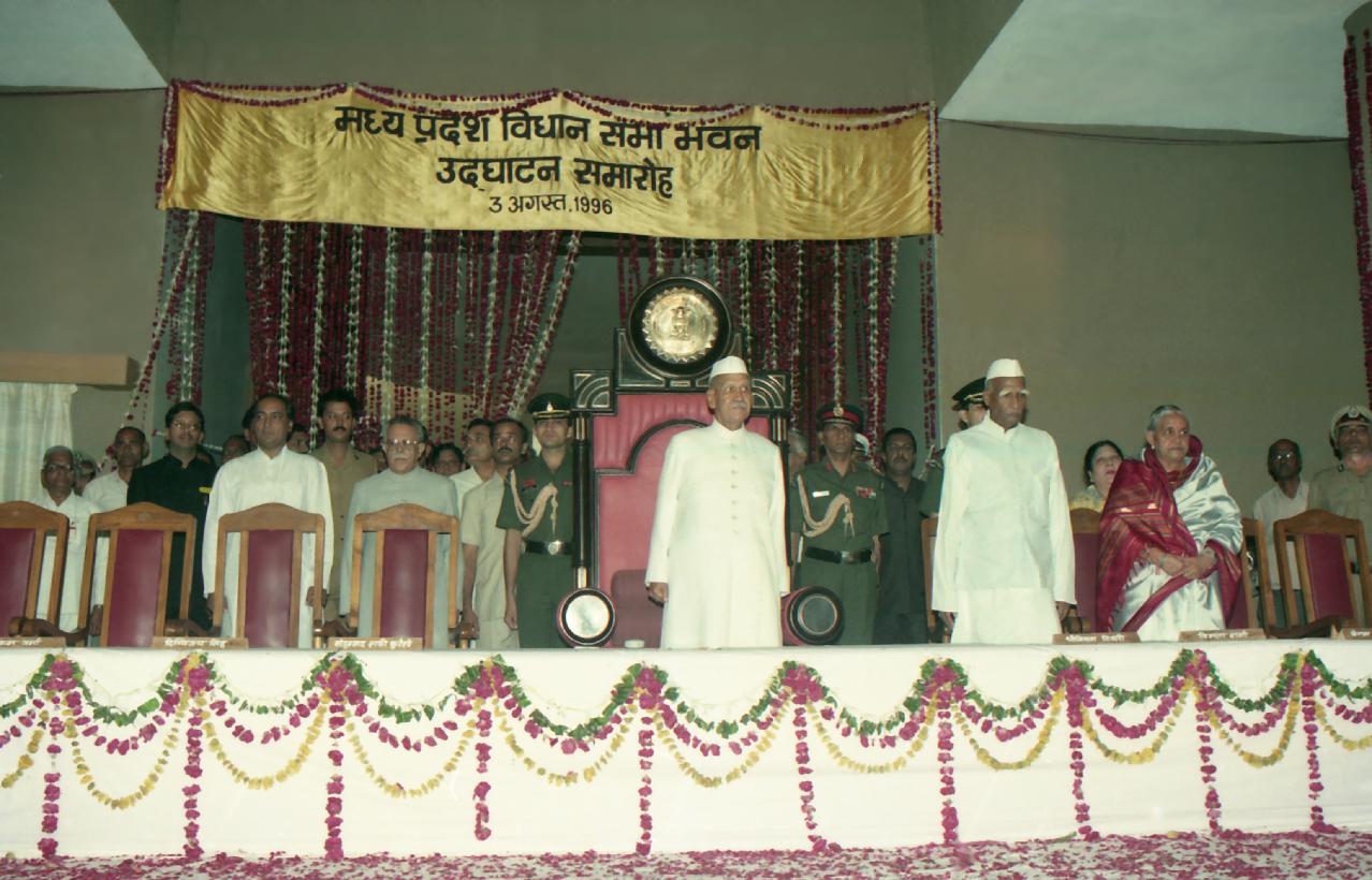 | Caption: | The President of India, Dr. Shankar Dayal Sharma inaugurating the new building of the Madhya Pradesh Vidhan Sabha by unveiling plaque, at Bhopal, Madhya Pradesh on August 03, 1996. |