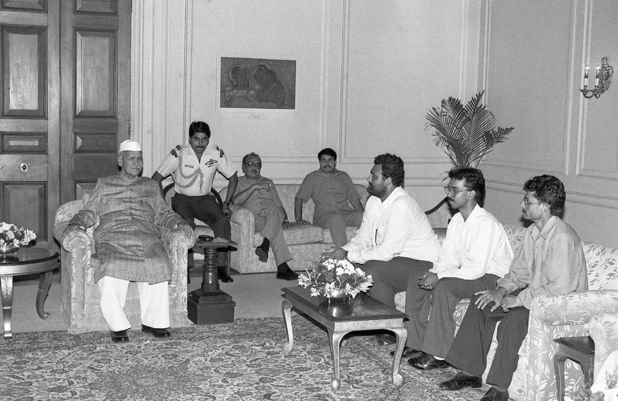 | Caption: | The President of India, Dr. Shankar Dayal Sharma meeting with Teachers and Students of Doctor Harisingh Gour Vishwavidyalaya, Sagar, at Rashtrapati Bhavan in New Delhi on August 16, 1996. |