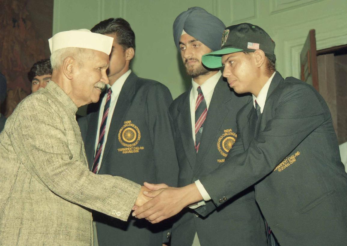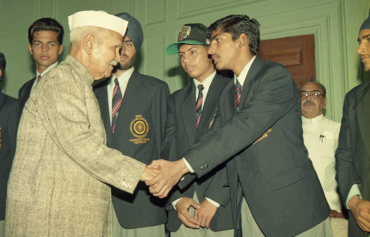 | Caption: | The President of India, Dr. Shankar Dayal Sharma meeting with Members of the under 15 World cup Cricket Team at Rashtrapati Bhavan in New Delhi on August 24, 1996. |