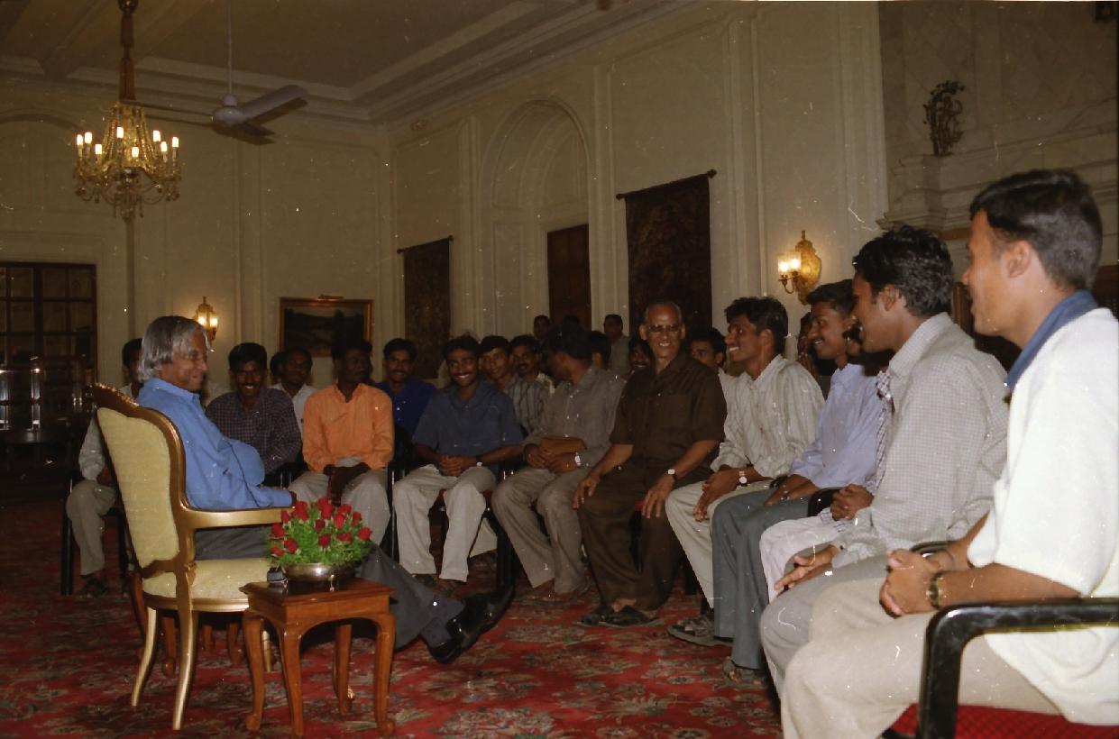 | Caption: | The President of India, Dr A P J Abdul Kalam with M Sc and B Sc (Physics) Students from Sri Ramakrishna Mission Vidyalaya College of Arts and Sciences, Coimbatore at the Yellow Drawing Room of Rashtrapati Bhavan in New Delhi on Sep 30, 2002 |