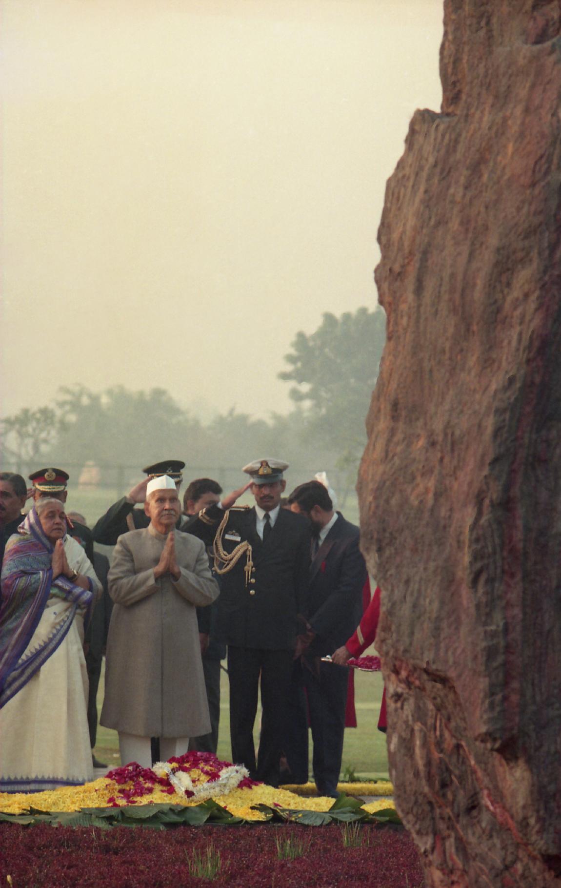 | Caption: | The President of India, Dr. Shankar Dayal Sharma paying floral tributes to late Smt. Indira Gandhi on her birth anniversary, at Shakti Sthal in New Delhi on November 19, 1995. |