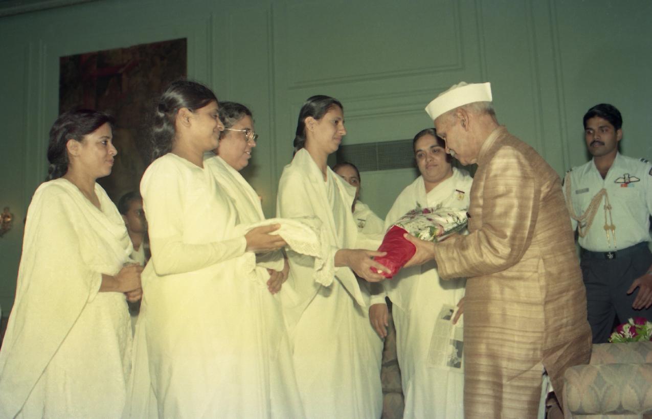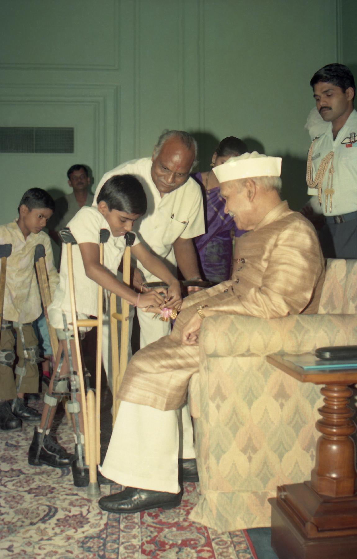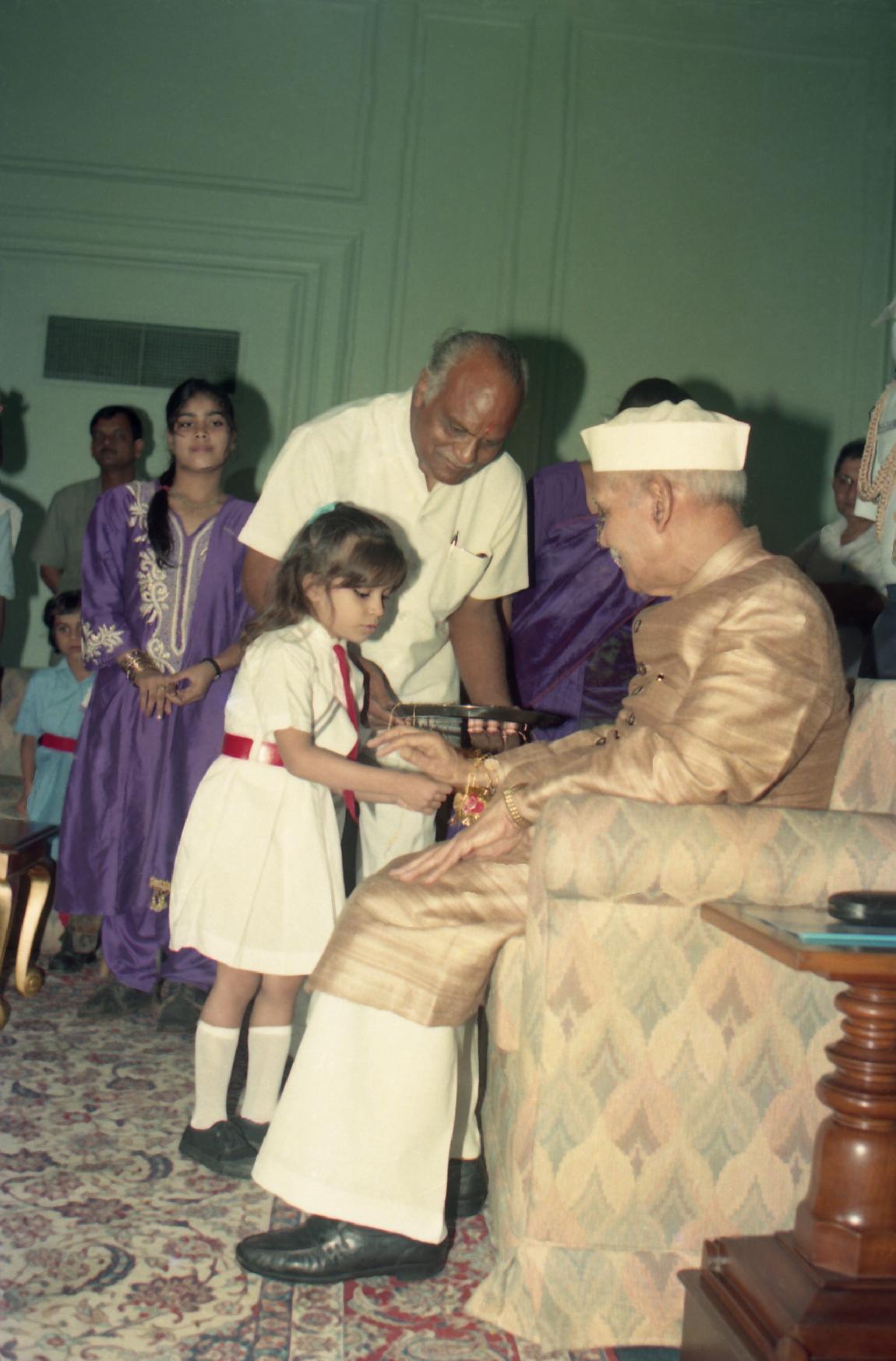 | Caption: | The President of India, Dr. Shankar Dayal Sharma receiving Raksha Bandhan Greetings at Rashtrapati Bhavan in New Delhi on August 10, 1995. |