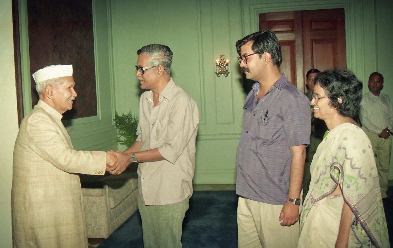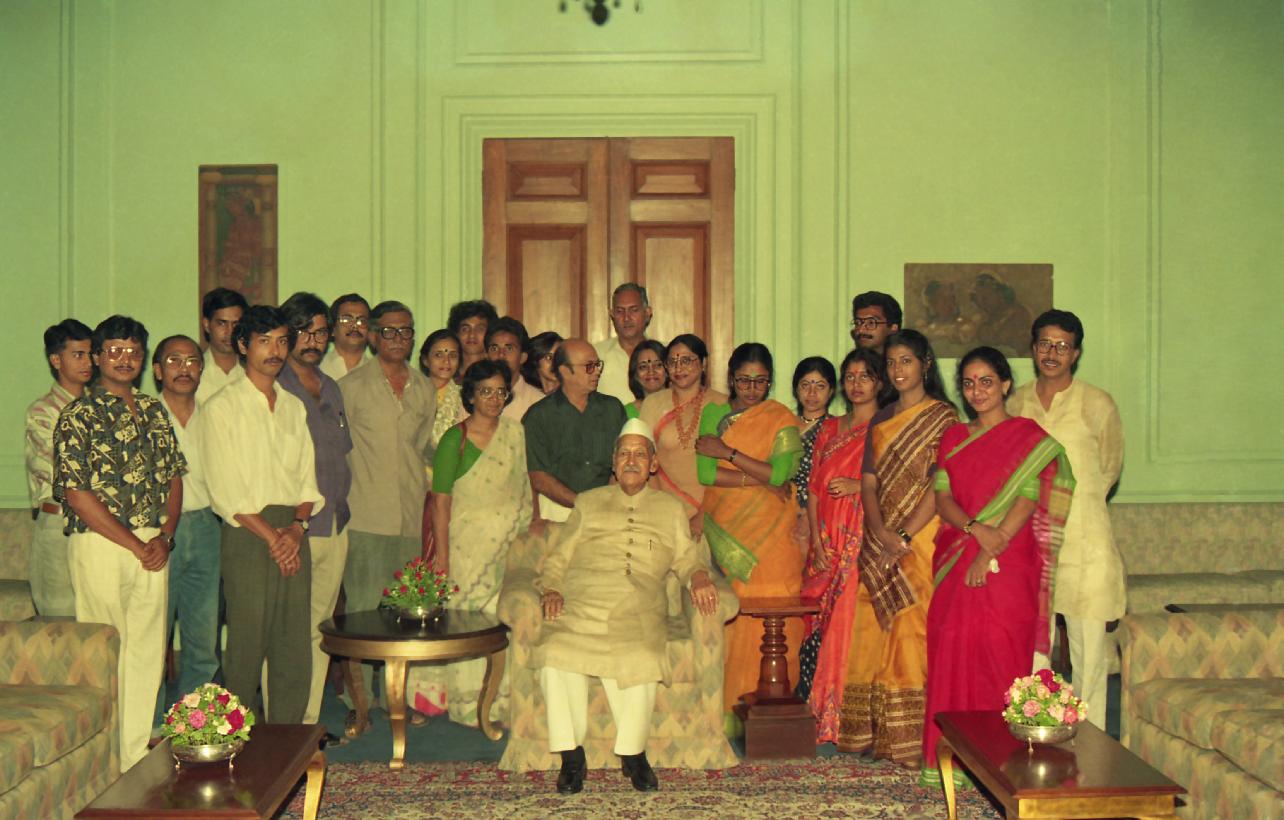 | Caption: | The President of India, Dr. Shankar Dayal Sharma meeting with A Group of Artists from Shanti Niketan at Rashtrapati Bhavan in New Delhi on May 10, 1995. |