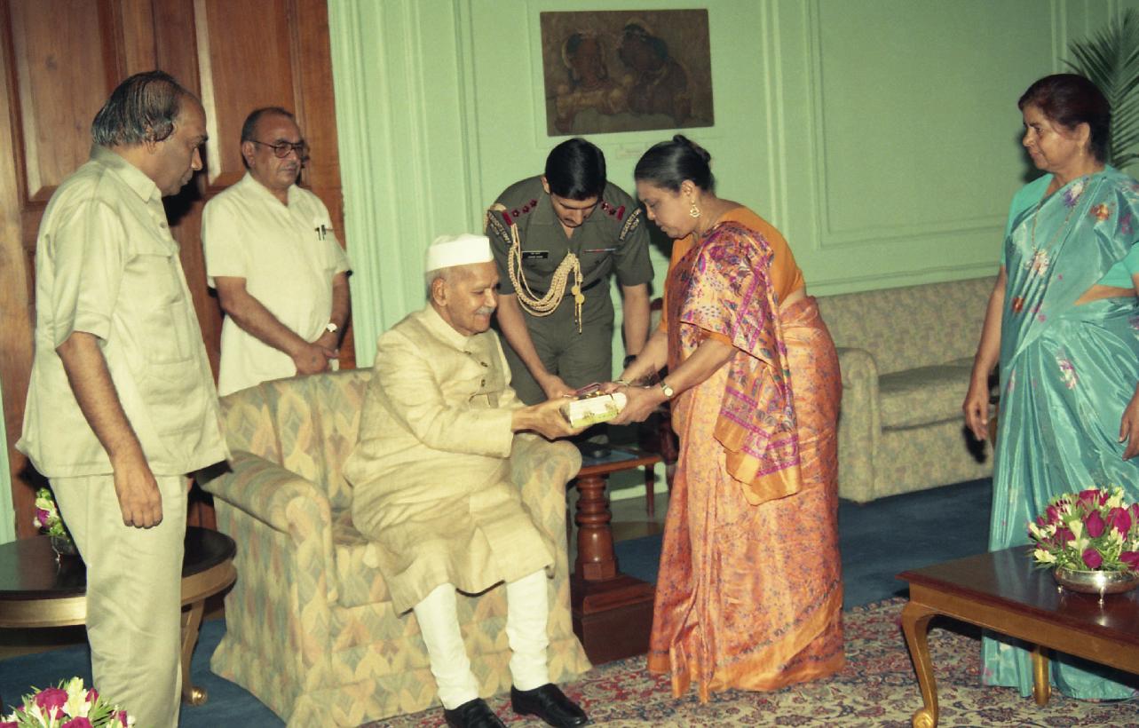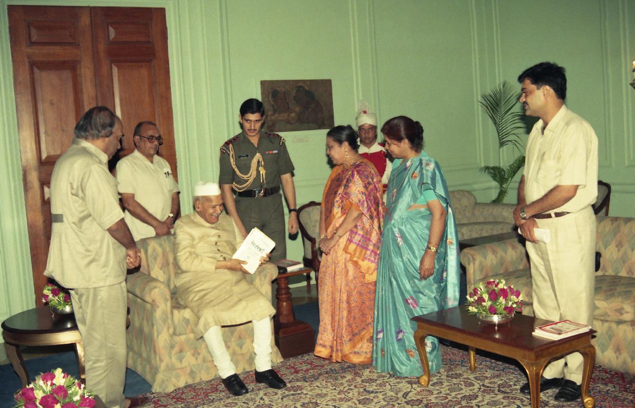 | Caption: | The President of India, Dr. Shankar Dayal Sharma receiving a copy of the book "Telugu Sahitya Visheshank" from Bhartiya Anuvad Parishad at Rashtrapati Bhavan in New Delhi on August 11, 1995. |