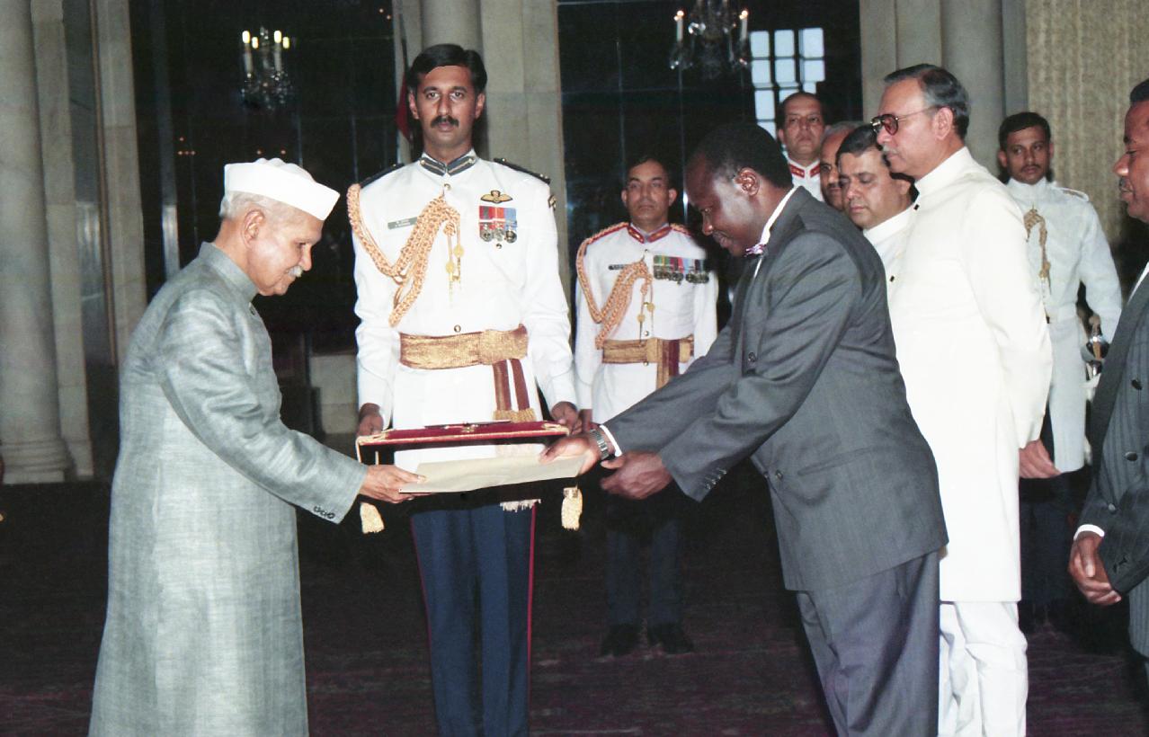 | Caption: | The High Commissioner-Designate of Namibia to India, H.E. Mr. Joel Kaapanda presenting his credentials to the President of India, Dr. Shankar Dayal Sharma at Rashtrapati Bhavan in New Delhi on May 12, 1995. |