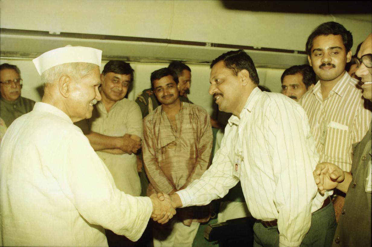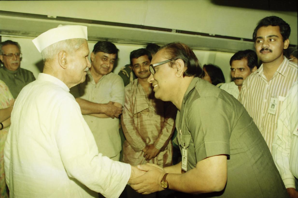 | Caption: | The President of India, Dr. Shankar Dayal Sharma interacting with the media persons onboard on his way to Trinidad and Tobago on May 27, 1995. |