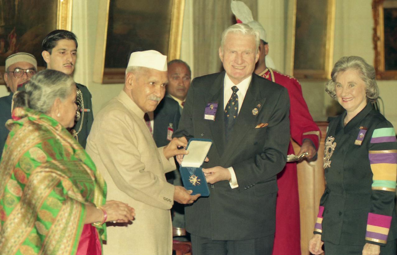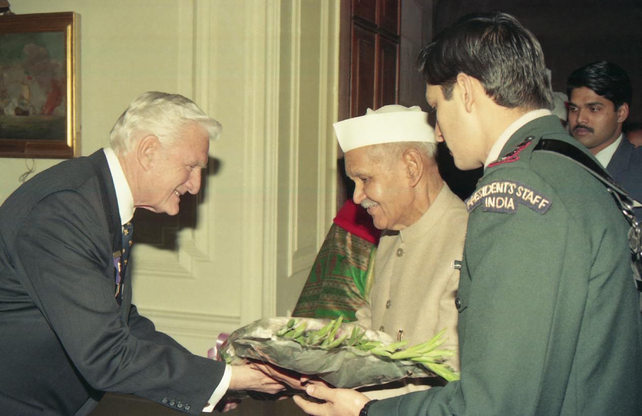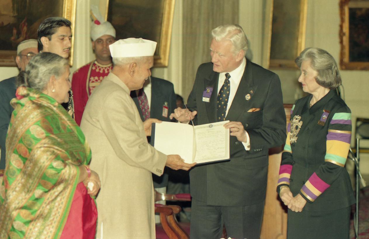| Caption: | The President of India, Dr. Shankar Dayal Sharma receiving the Rotary International's "Award of Honour" from Mr. Herbert G. Brown, President of Rotary International at Rashtrapati Bhavan in New Delhi on January 16, 1996. |