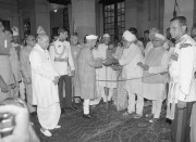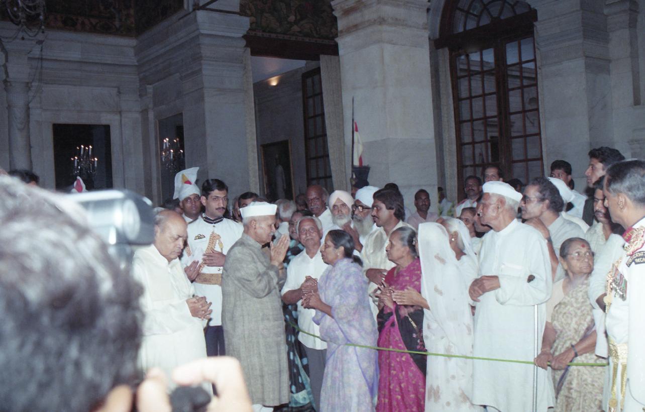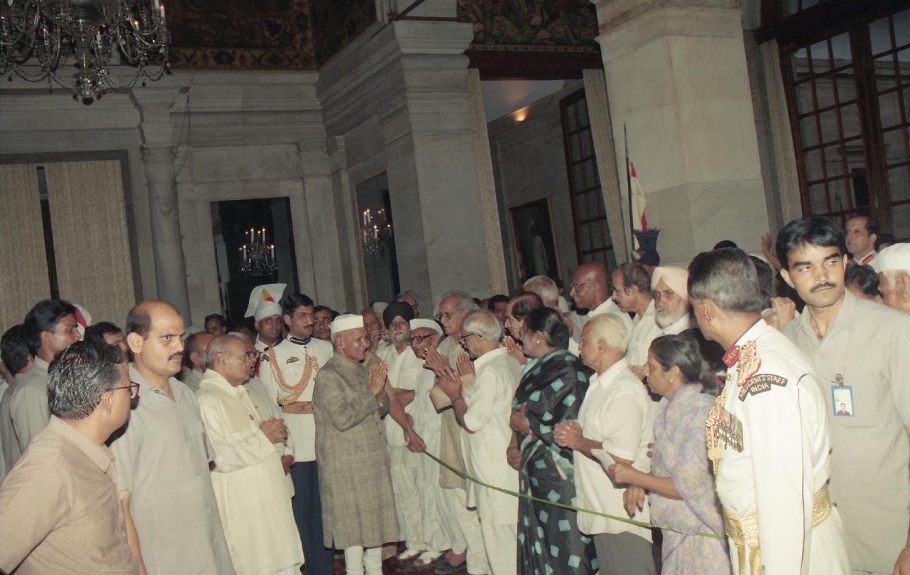 | Caption: | The President of India, Dr. Shankar Dayal Sharma meeting with Freedom Fighters during ''At Home'', at Rashtrapati Bhavan in New Delhi on August 09, 1995. |