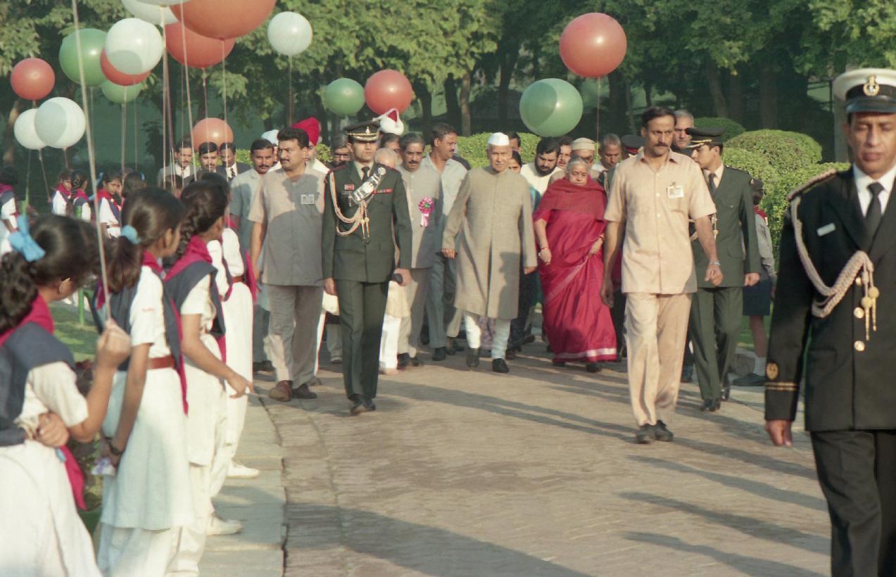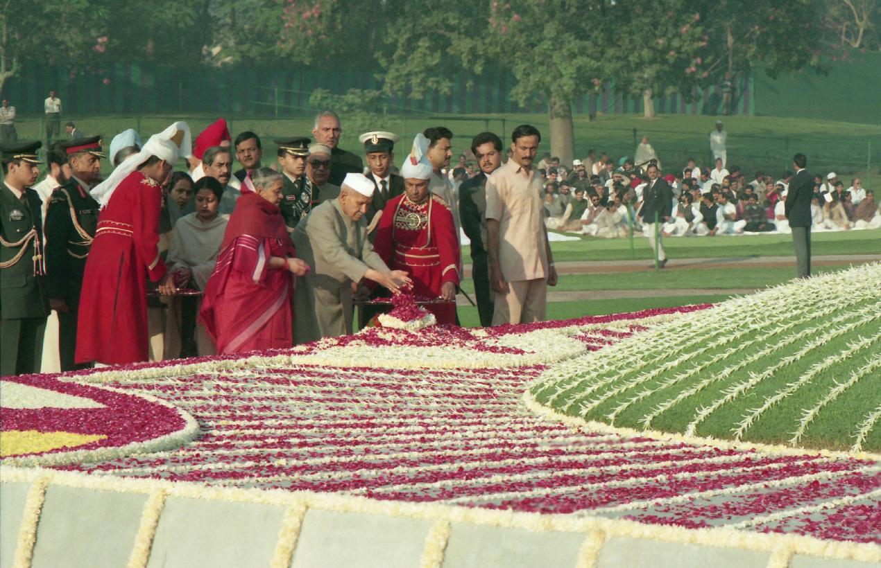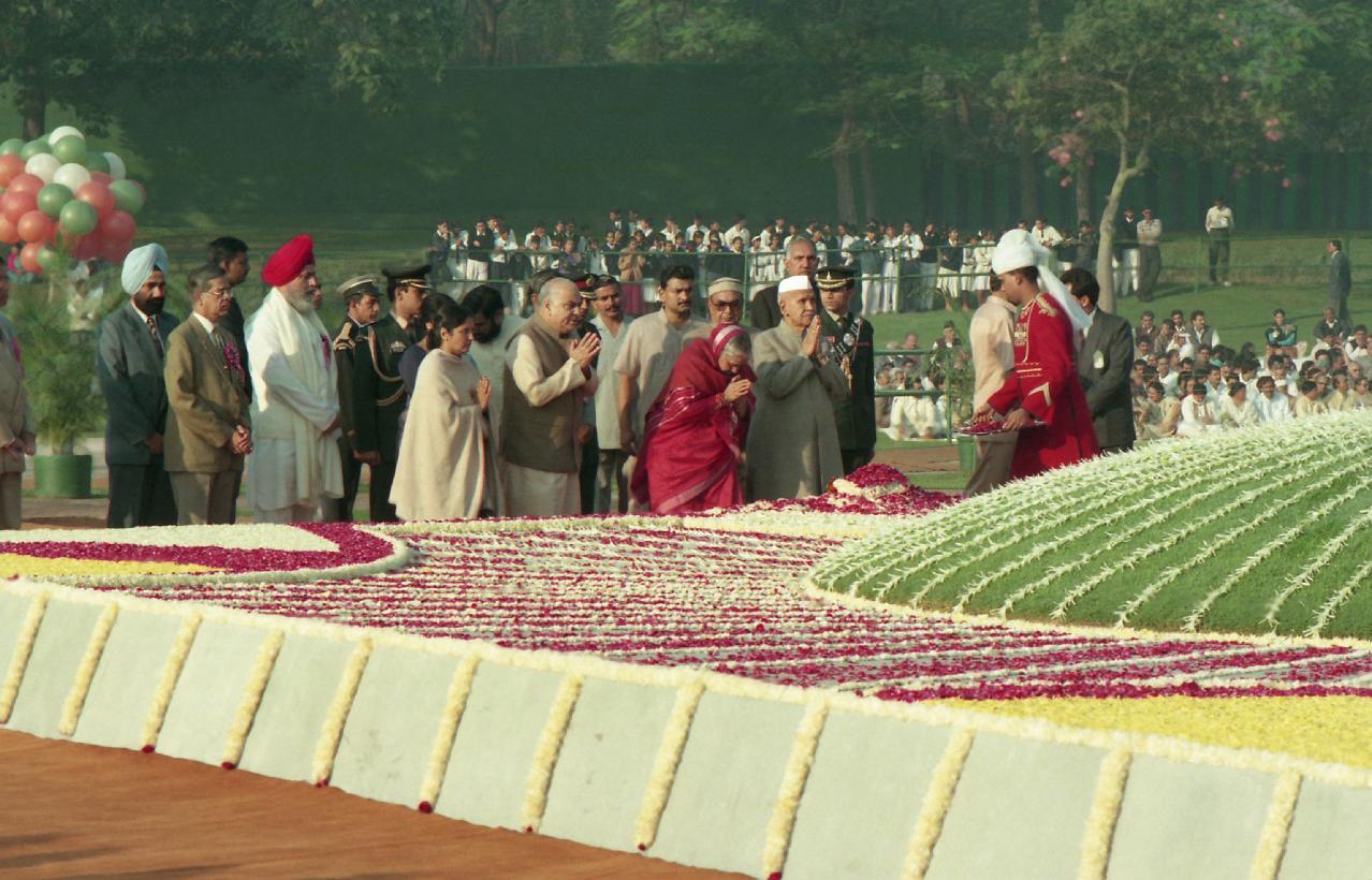 | Caption: | The President of India, Dr. Shankar Dayal Sharma paying floral tributes to late Pandit Jawaharlal Nehru on the occasion of his birth anniversary, at Shantivana, in Delhi on November 14, 1995. |