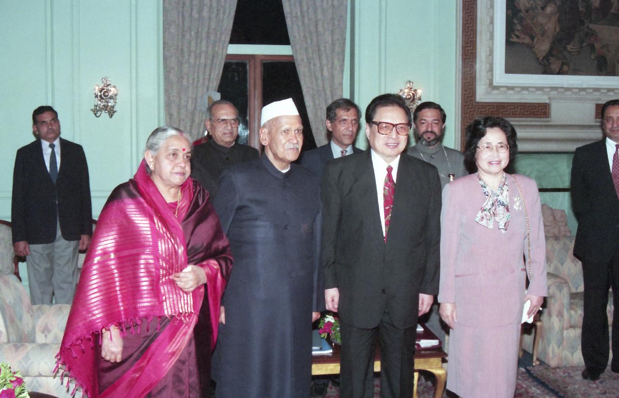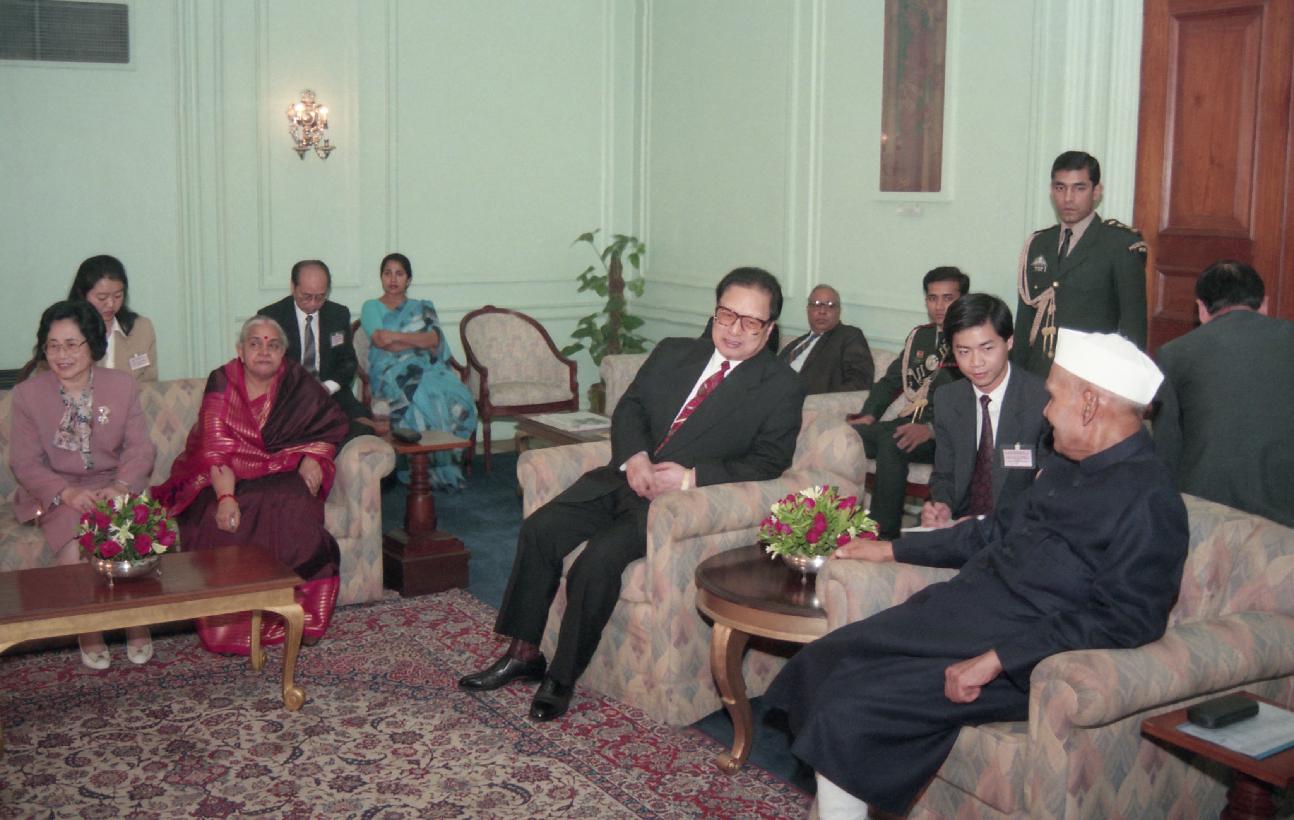 | Caption: | The President of India, Dr. Shankar Dayal Sharma meeting with H.E. Mr. Qiao Shi, Chairman of the Standing Committee of the National People's Congress of China and Mme. Yu Wen at Rashtrapati Bhavan in New Delhi on November 16, 1995. |