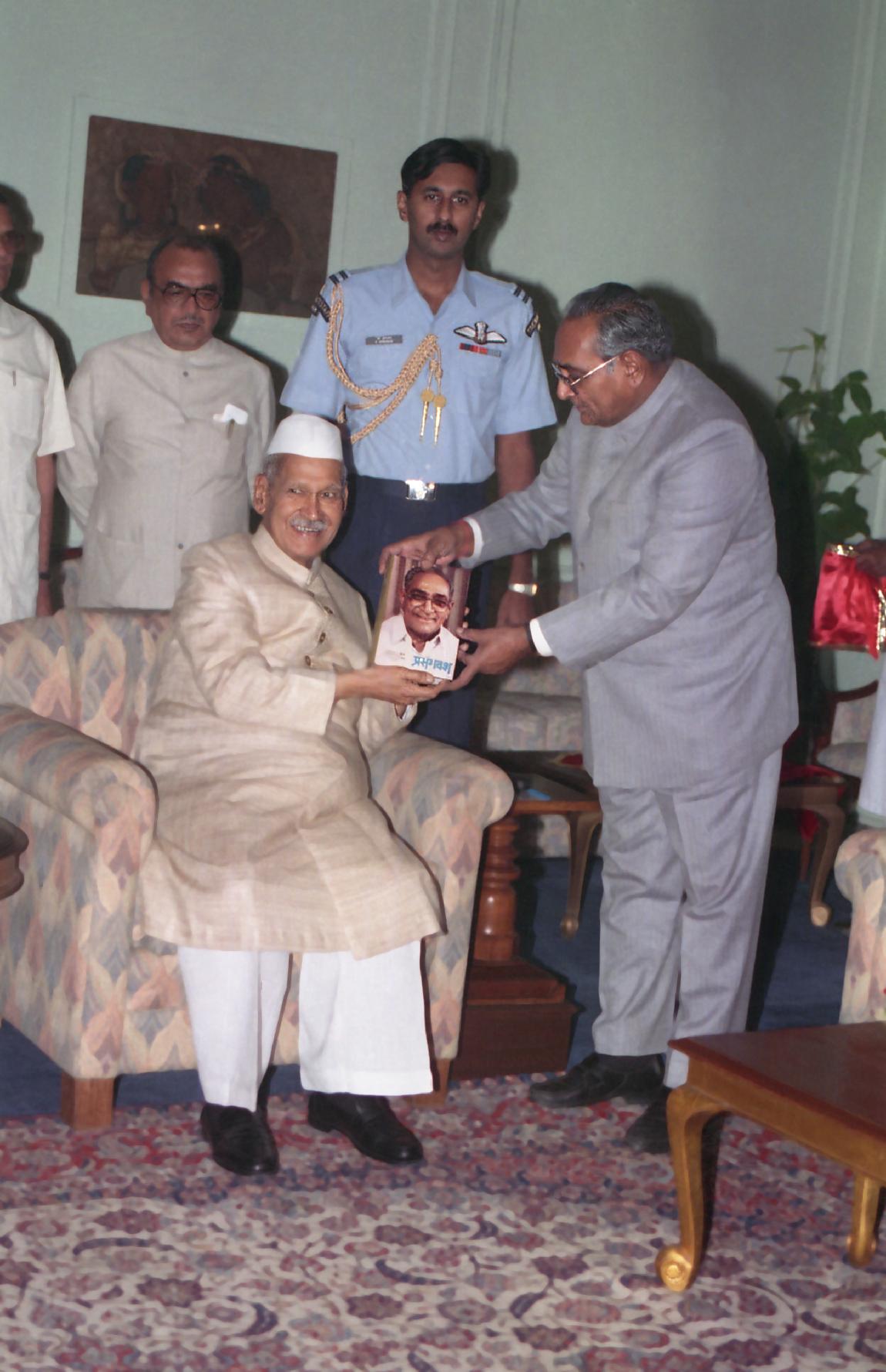 | Caption: | The President of India, Dr. Shankar Dayal Sharma receiving a copy of the book "Prasangvash" from Shri Motilal Vora, Governor of Uttar Pradesh at Rashtrapati Bhavan in New Delhi on November 09, 1994. |