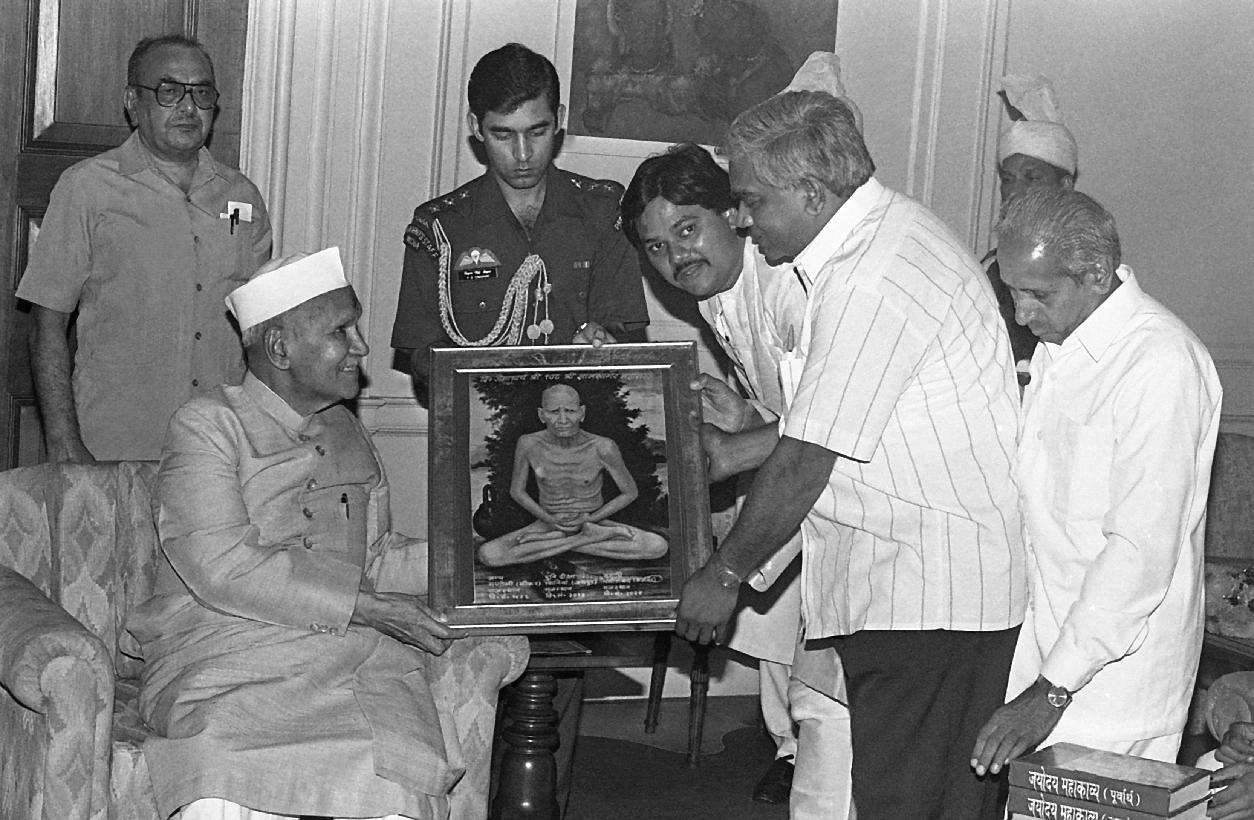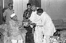 | Caption: | The President of India, Dr. Shankar Dayal Sharma receiving a set of 30 Sanskrit books from Digamber Jain Samiti, Ajmer at Rashtrapati Bhavan in New Delhi on August 23, 1995. |
