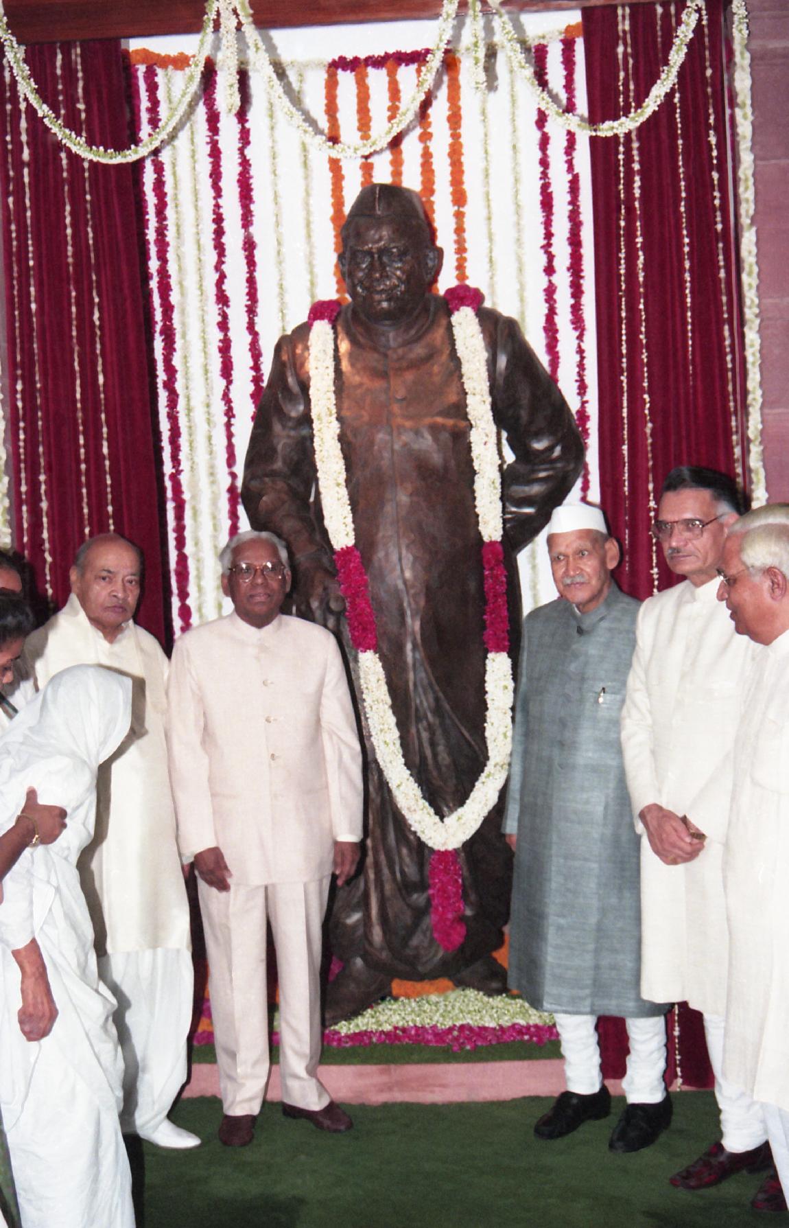 | Caption: | The President of India, Dr. Shankar Dayal Sharma unveiling the statue of Shri Jagjivan Ram at Parliament House in New Delhi on August 25, 1995. |