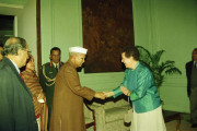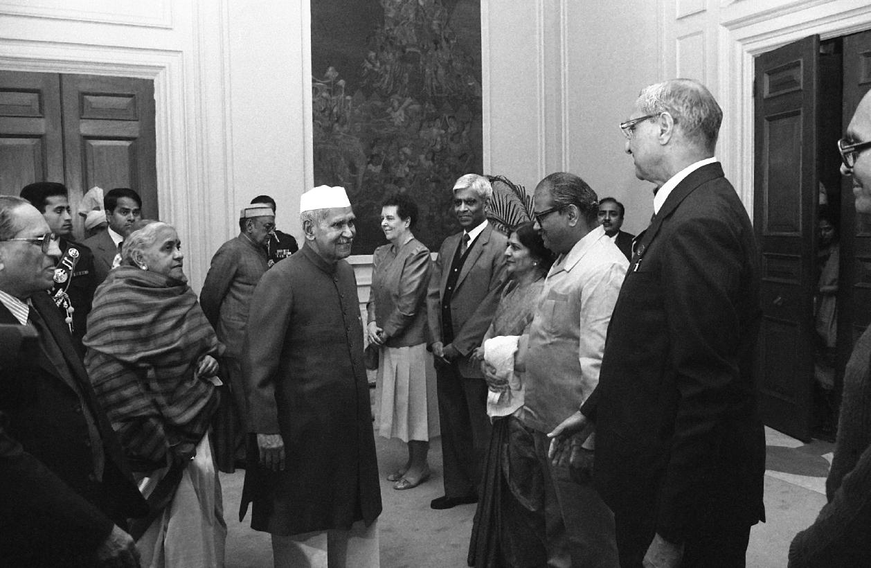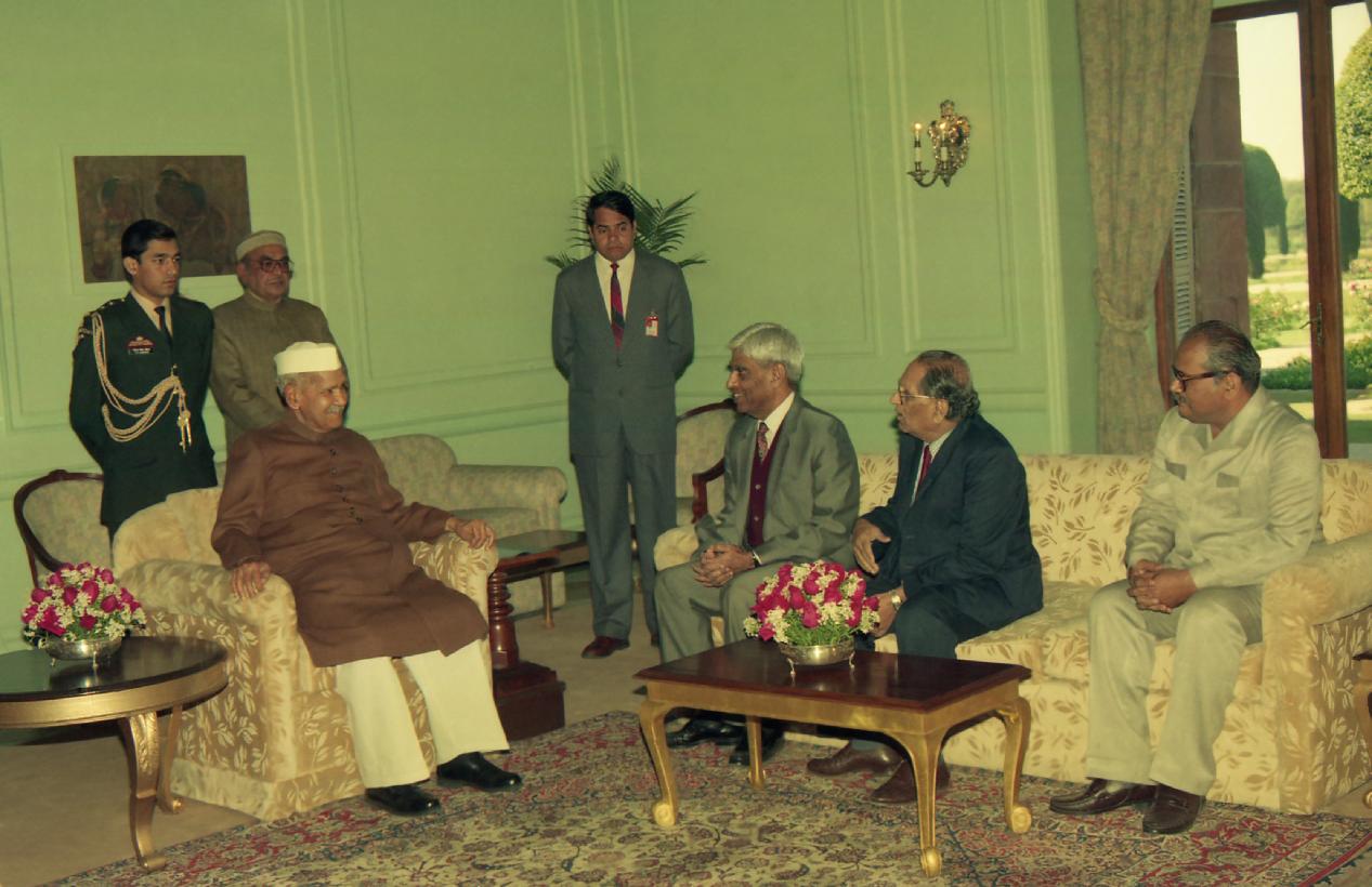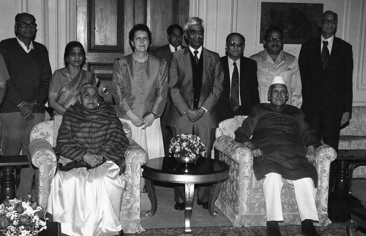 | Caption: | The President of India, Dr. Shankar Dayal Sharma meeting with Dr. S.K. Noordeen and Dr. (Ms) Jean Watson, Recipients of International Gandhi Awards for 1996 with others at Rashtrapati Bhavan in New Delhi on January 29, 1996. |