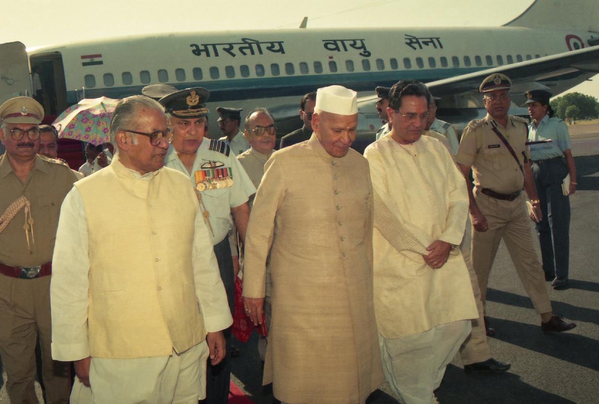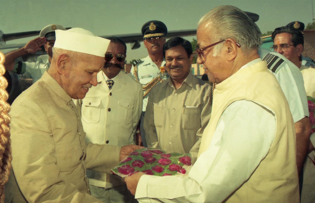 | Caption: | The President of India, Dr. Shankar Dayal Sharma being received by the Governor, Rajasthan, Shri Bali Ram Bhagat, at Jodhpur airport on October 26, 1995. |